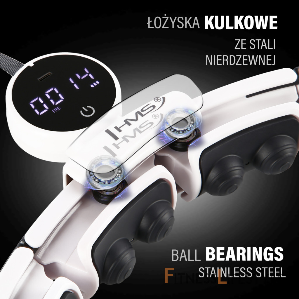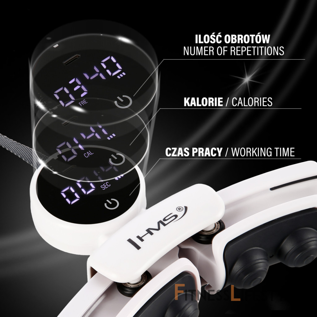 HMS HHM16 je hula hoop obruč s nastaviteľným obvodom, masážnymi magnetickými výstupkami, rotujúcim závažím a prehľadným, dobre čitateľným počítadlom. Konštrukcia masážneho hula hoopu Konštrukcia sa skladá z 16-tich rovnakých dielov ktoré sa spájajú pomocou plastových spojok. Aby šla obruč uzavrieť, tak je potrebné použiť najmenej 10 dielov. Jednotlivé diely v sebe skrývajú koľajnicu, do ktorej sa pred uzavretím zasunie kotva, ktorá je osadená štyrmi kolieskami s guličkovými ložiskami. Ku kotve je, pomocou dĺžkovo nastaviteľného remienka, pripojené závažie s hmotnosťou 300 gramov. Povrázok je možné nastaviť na dĺžku 20 až 38 centimetrov, zmenou dĺžky povrázku sa nastavuje výsledná odstredivá sila závažia - čím dlhší povrázok, tým "ťažšie" bude závažie. Magnetická masáž Každý diel HHM16 je z vnútornej strany vybavený dvoma masážnymi výstupkami, ktoré v sebe skrývajú magnet. Výstupky príjemne masírujú oblasť pása, tým sa pokožka prekrvuje a dochádza k narušovaniu a odbúravaniu tukového tkaniva. Záporne polarizované magnety podporujú prekrvovanie a tým majú pozitívny vplyv na funkciu metabolizmu. Používanie Dĺžka obruče sa nastaví podľa obvodu pása tak, aby bola dostatočne voľná, ale zároveň aby nepadala cez boky. Model HHM16 je vhodný pre obvod pása od 59 do 113 centimetrov. Po nastavení dĺžky sa do koľajnice vloží kotva so závažím a obruč sa uzavrie. Závažie sa následne „vrhne“ smerom, do ktorého budeme krútiť boky a začneme tréning. Intenzitu tréningu ovplyvňuje rýchlosť, akú krútime boky. Počítač s dobre čitateľným displejom a jeho funkcie Rozmerný a dobre čitateľný LCD displej umiestnený na kotve zobrazuje informácie o čase tréningu, počte spálených kalórií, a rýchlosti krúženia. Údaje je možné použiť na kontrolu tréningu a na sledovanie kondície. Počítač je napájaný akumulátorom, ktorý má dostatočnú kapacitu až pre 10 intenzívnych tréningov. Akumulátor sa dobíja pomocou USB-C konektora nad displejom. Na nabíjanie môžete použiť nabíjačku od telefónu, powerbanku, alebo napríklad notebook. O úrovni nabitia akumulátora informuje ukazovateľ pod displejom. Pravidelným používaním HMS HHM16: Jednotlivé diely obruče sú vyrobené z kvalitného PVC a ABS. Parametre: Upozornenie: