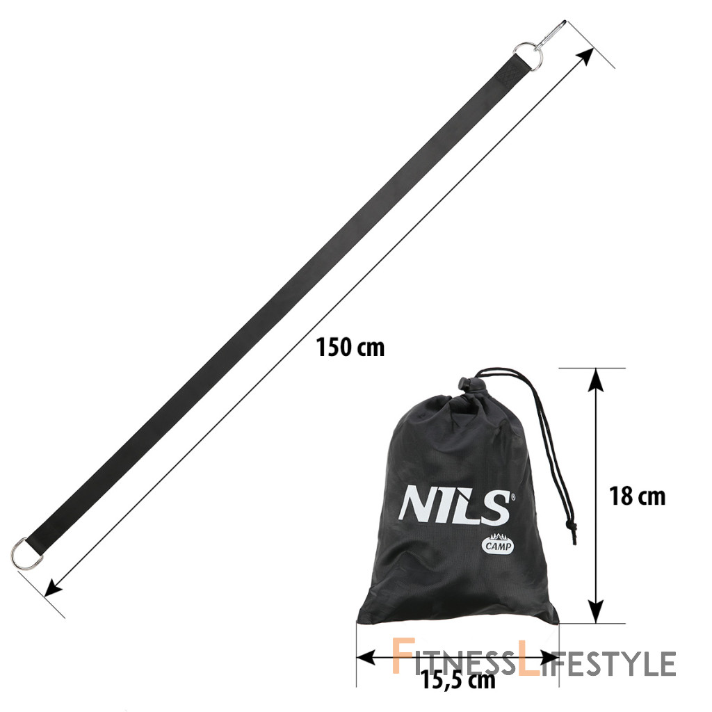 Sada 2 polyesterových popruhov s oceľovými okami NILS Camp NC1722 je určený na zavesenie hojdačiek, hojdacích sietí, posilňovacích systémov a brazílskych kresiel všade tam, kde nestačí dĺžka originálnych lán. Pokiaľ máte napríklad trámy na terase príliš vysoko na zavesenie hojdačky, alebo stromy na záhrade sú príloš ďaleko na napnutie hamaky, potom je NC1722 ideálne riešenie. V prípade potreby je možné viac popruhov spojiť pomocou karabín. Polyester je veľmi odolný materiál, ktorý je tvarovo stáli a neodiera sa. Oceľové oká na koncoch remeňa majú tvar písmena "D", tento tvar zamedzuje deformáciám popruhu, zaisťuje rovnomerné zaťažovanie popruhu a tým predlžuje ich životnosť. Nosnosť remeňa je až 500 kilogramov a jeho dĺžka vrátane karabíny je 150 centimetrov. V balení nájdete 2 popruhy a 2 skrutkovacie karabíny. Parametre: Upozornenie: