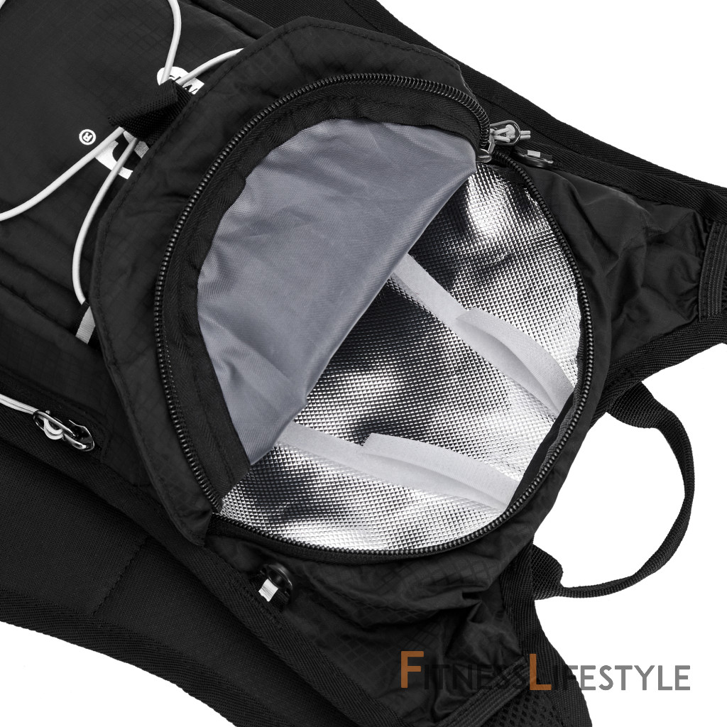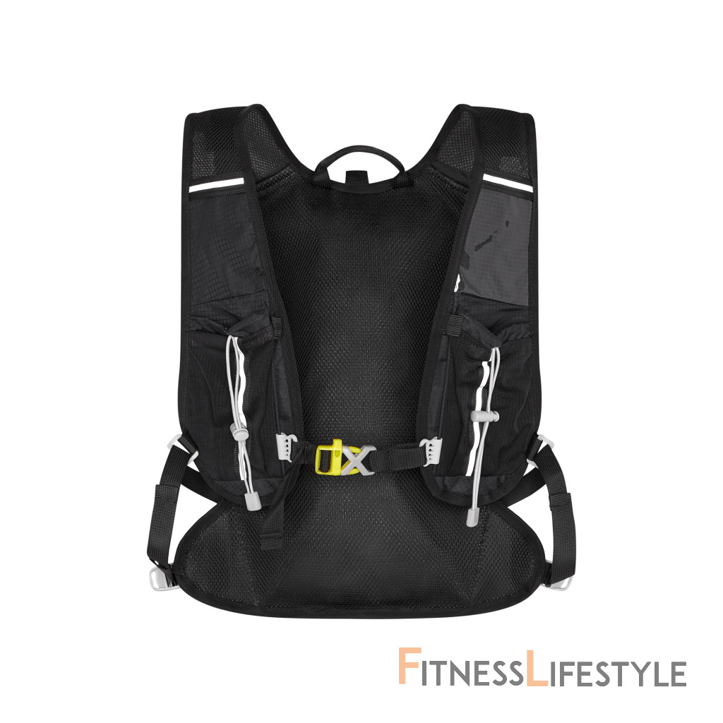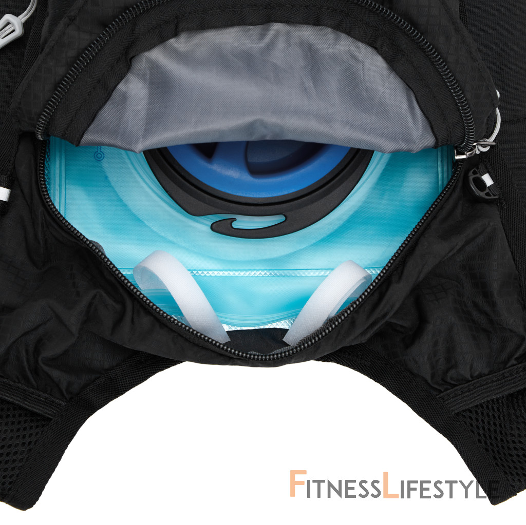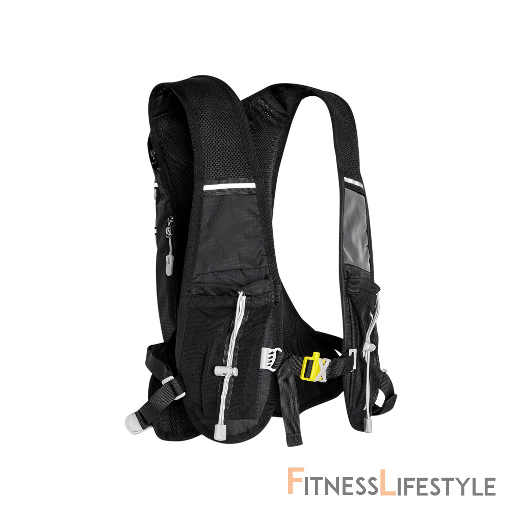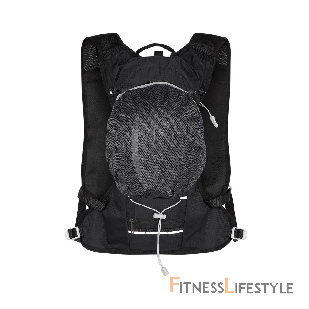 Hlavná komora batohu je vybavená prepážkou, v hornej časti sa nachádzajú 2 suché zipsy na zavesenie hydrovaku (nie je súčasťou dodávky). Zadná strana hlavnej komory je opatrená hliníkovou fóliou, ktorá slúži ako izolácia medzi hydrovakom a chrbtom, takže nápoj sa nebude ohrievať teplom od chrbta. Hadičku hydrovaku je možné vyviesť prievlakmi na pravej aj na ľavej strane pod ramennými panelmi. Predná strana batohu je opatrená gumovým lankom s brzdičkou, pod ktoré je možné uložiť napríklad karimatku. Nižšie nájdeme vrecko, v ktorom sa skrýva sieťka, ktorú je možné vytiahnuť a pomocou karabínok pripnúť k stranám batohu, sieťka následne vytvorí vrecko, čo ktoré môžeme uložiť napríklad cyklistickú helmu, ešus a pod.. Pod vreckom je reflexný panel, ku ktorému si môžeme pripnúť ďalšie vybavenie. Na pravej strane sa skrýva ďalšie vrecko na zips, ktoré je ideálne pre telefón, peňaženku, alebo napríklad kľúče. Na hornej strane batohu je pútko pre ľahké prenášanie batohu v ruke. Chrbát a ramenné popruhy sú vyrobené zo sieťoviny doplnené o priedušnú penu, ktorá zvyšuje priedušnosť panelu a chrbát sa bude menej potiť. Ramenné popruhy sú opatrené reflexnými remienkami na pretiahnutie hadičky od hydrovaku a vreckami zo sieťoviny. Na ľavom popruhu sa navyše nachádza vrecko s priehľadnou čelnou stranou, do ktorej je možné uložiť napríklad kartičku pre prípad straty, štartové číslo a podobne. Ramenné popruhy sú spojené hrudným pásom, ktorý je možné výškovo nastaviť. Popruh je spojený plastovou prackou s píšťalkou.