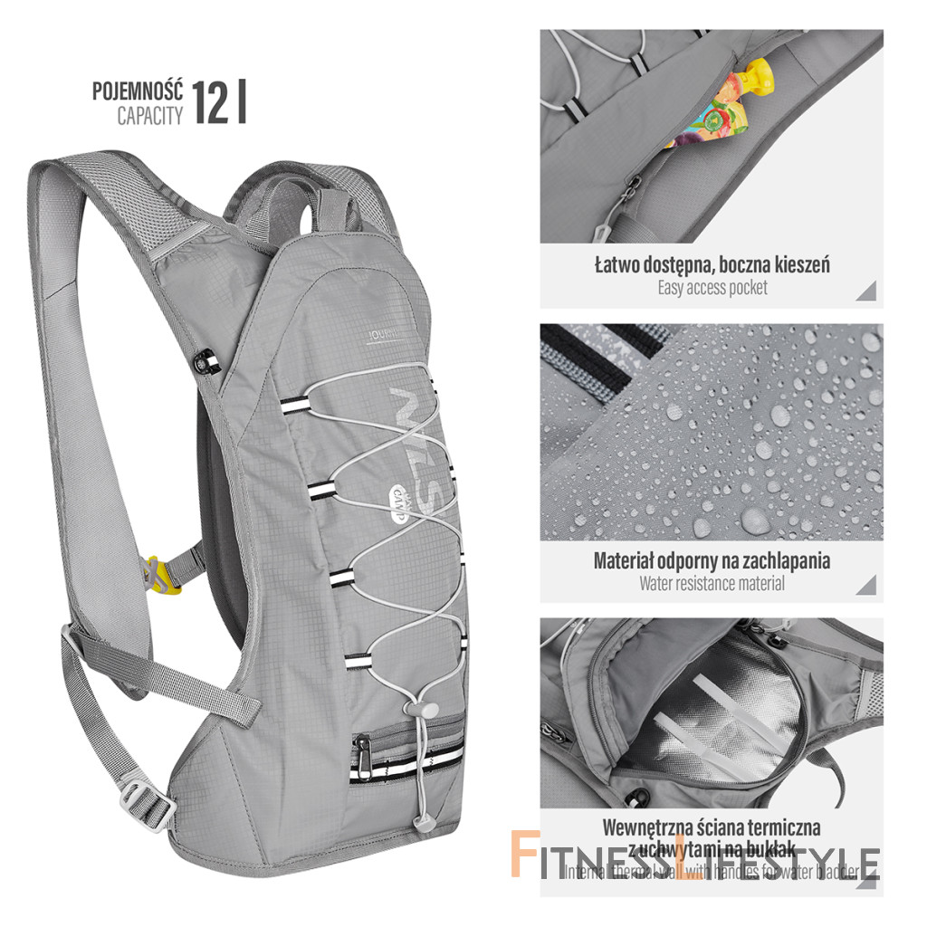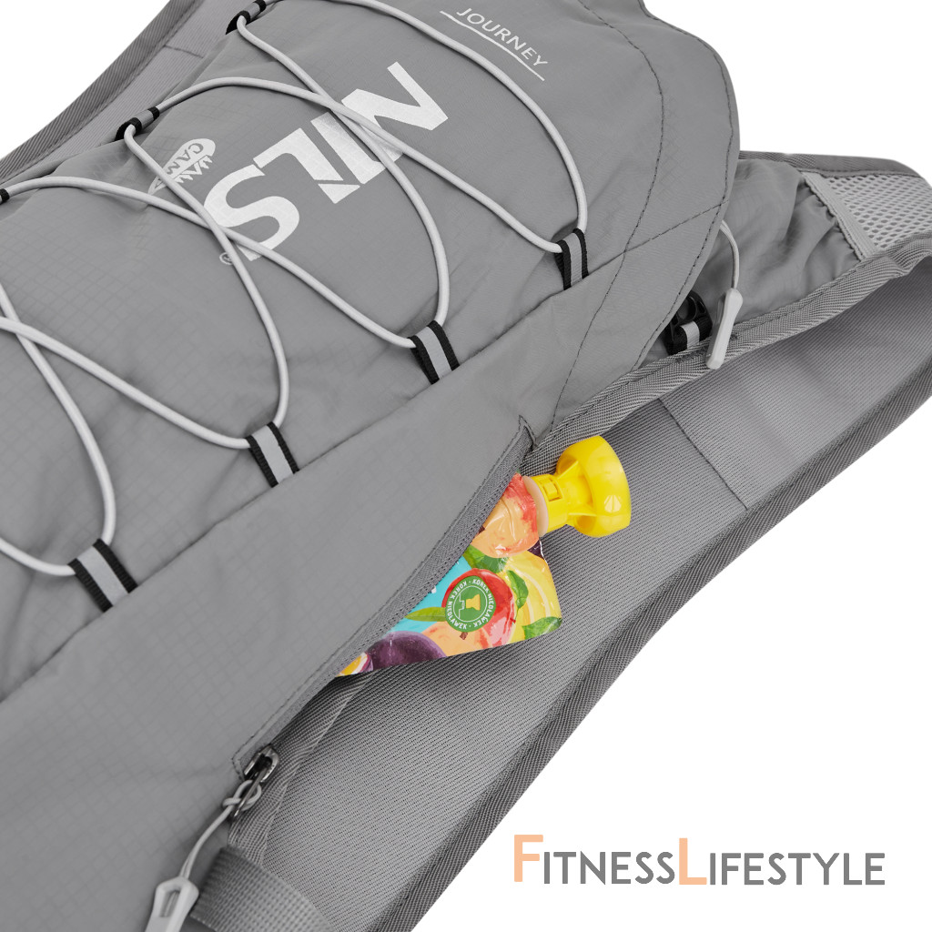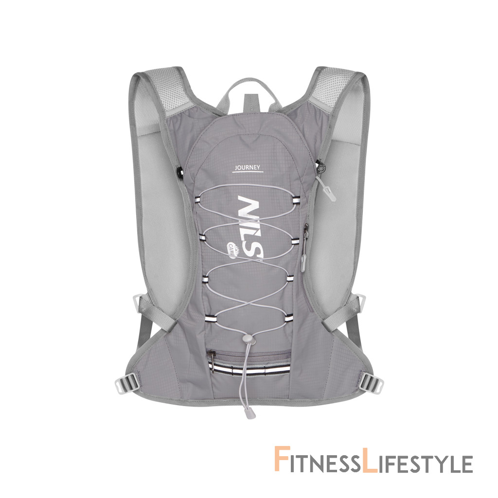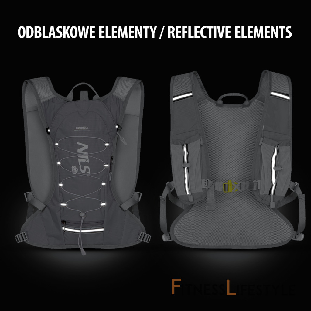 NILS Camp NC1797 Journey je ľahký batoh s objemom 12 litrov, ktorý je ideálny na jednodňové výlety, dlhé prechádzky, jazdu na bicykli alebo behanie. Model Journey je vyrobený z odolného nylonu, vďaka čomu je ľahký, odolný proti početným oderom a mechanickému poškodeniu. Nylon je navyše odolný voči striekajúcej vode. Hlavná komora batohu je vybavená prepážkou, v hornej časti sa nachádzajú 2 suché zipsy na zavesenie hydrovaku (nie je súčasťou dodávky). Zadná strana hlavnej komory je opatrená hliníkovou fóliou, ktorá slúži ako izolácia medzi hydrovakom a chrbtom, takže nápoj sa nebude ohrievať teplom od chrbta. Hadičku hydrovaku je možné vyviesť prievlakmi na pravej aj na ľavej strane pod ramennými panelmi. Predná strana batohu je opatrená gumovým lankom s brzdičkou, pod ktoré je možné uložiť napríklad karimatku. Nižšie nájdeme vrecko, v ktorom sa skrýva sieťka, ktorú je možné vytiahnuť a pomocou karabínok pripnúť k stranám batohu, sieťka následne vytvorí vrecko, čo ktoré môžeme uložiť napríklad cyklistickú helmu, ešus a pod.. Pod vreckom je reflexný panel, ku ktorému si môžeme pripnúť ďalšie vybavenie. Na pravej strane sa skrýva ďalšie vrecko na zips, ktoré je ideálne pre telefón, peňaženku, alebo napríklad kľúče. Na hornej strane batohu je pútko pre ľahké prenášanie batohu v ruke. Chrbát a ramenné popruhy sú vyrobené zo sieťoviny doplnené o priedušnú penu, ktorá zvyšuje priedušnosť panelu a chrbát sa bude menej potiť. Ramenné popruhy sú opatrené reflexnými remienkami na pretiahnutie hadičky od hydrovaku a vreckami zo sieťoviny. Na ľavom popruhu sa navyše nachádza vrecko s priehľadnou čelnou stranou, do ktorej je možné uložiť napríklad kartičku pre prípad straty, štartové číslo a podobne. Ramenné popruhy sú spojené hrudným pásom, ktorý je možné výškovo nastaviť. Popruh je spojený plastovou prackou s píšťalkou. Parametre: Upozornenie: