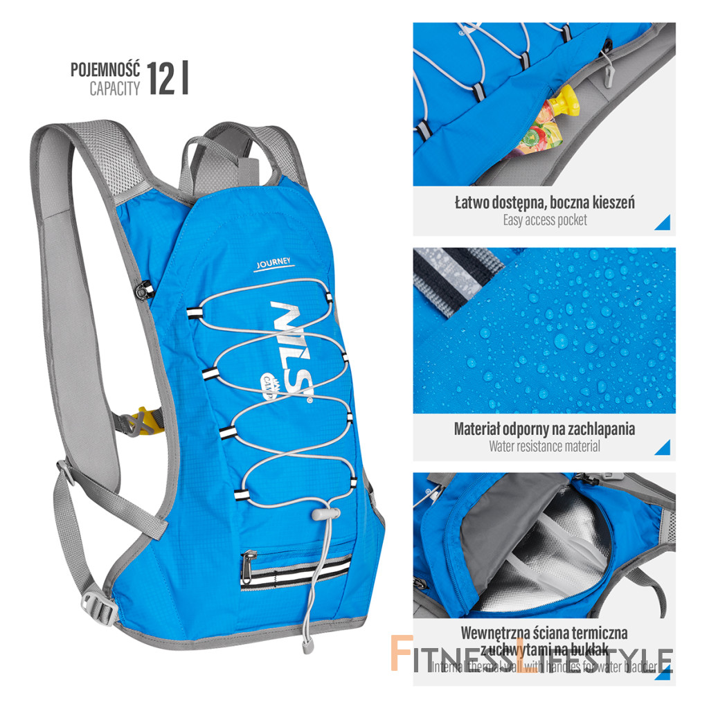 NILS Camp NC1797 Journey je ľahký batoh s objemom 12 litrov, ktorý je ideálny na jednodňové výlety, dlhé prechádzky, jazdu na bicykli alebo behanie. Model Journey je vyrobený z odolného nylonu, vďaka čomu je ľahký, odolný proti početným oderom a mechanickému poškodeniu. Nylon je navyše odolný voči striekajúcej vode. Hlavná komora batohu je vybavená prepážkou, v hornej časti sa nachádzajú 2 suché zipsy na zavesenie hydrovaku (nie je súčasťou dodávky). Zadná strana hlavnej komory je opatrená hliníkovou fóliou, ktorá slúži ako izolácia medzi hydrovakom a chrbtom, takže nápoj sa nebude ohrievať teplom od chrbta. Hadičku hydrovaku je možné vyviesť prievlakmi na pravej aj na ľavej strane pod ramennými panelmi. Predná strana batohu je opatrená gumovým lankom s brzdičkou, pod ktoré je možné uložiť napríklad karimatku. Nižšie nájdeme vrecko, v ktorom sa skrýva sieťka, ktorú je možné vytiahnuť a pomocou karabínok pripnúť k stranám batohu, sieťka následne vytvorí vrecko, čo ktoré môžeme uložiť napríklad cyklistickú helmu, ešus a pod.. Pod vreckom je reflexný panel, ku ktorému si môžeme pripnúť ďalšie vybavenie. Na pravej strane sa skrýva ďalšie vrecko na zips, ktoré je ideálne pre telefón, peňaženku, alebo napríklad kľúče. Na hornej strane batohu je pútko pre ľahké prenášanie batohu v ruke. Chrbát a ramenné popruhy sú vyrobené zo sieťoviny doplnené o priedušnú penu, ktorá zvyšuje priedušnosť panelu a chrbát sa bude menej potiť. Ramenné popruhy sú opatrené reflexnými remienkami na pretiahnutie hadičky od hydrovaku a vreckami zo sieťoviny. Na ľavom popruhu sa navyše nachádza vrecko s priehľadnou čelnou stranou, do ktorej je možné uložiť napríklad kartičku pre prípad straty, štartové číslo a podobne. Ramenné popruhy sú spojené hrudným pásom, ktorý je možné výškovo nastaviť. Popruh je spojený plastovou prackou s píšťalkou. Parametre: Upozornenie: