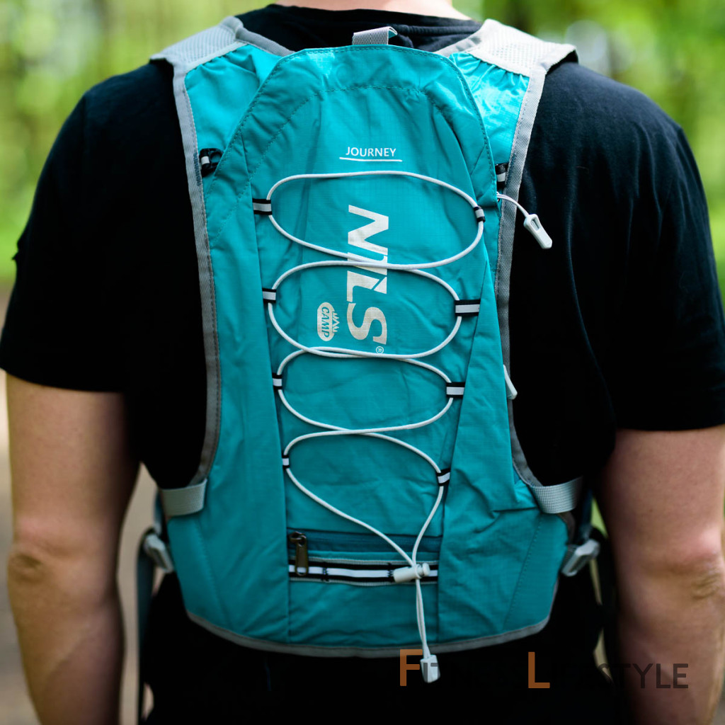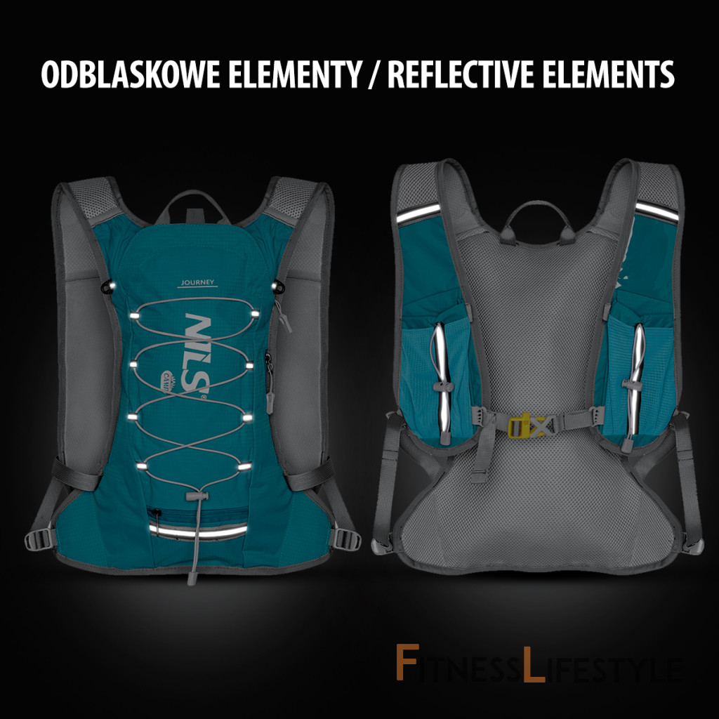 NILS Camp NC1797 Journey je ľahký batoh s objemom 12 litrov, ktorý je ideálny na jednodňové výlety, dlhé prechádzky, jazdu na bicykli alebo behanie. Model Journey je vyrobený z odolného nylonu, vďaka čomu je ľahký, odolný proti početným oderom a mechanickému poškodeniu. Nylon je navyše odolný voči striekajúcej vode. Hlavná komora batohu je vybavená prepážkou, v hornej časti sa nachádzajú 2 suché zipsy na zavesenie hydrovaku (nie je súčasťou dodávky). Zadná strana hlavnej komory je opatrená hliníkovou fóliou, ktorá slúži ako izolácia medzi hydrovakom a chrbtom, takže nápoj sa nebude ohrievať teplom od chrbta. Hadičku hydrovaku je možné vyviesť prievlakmi na pravej aj na ľavej strane pod ramennými panelmi. Predná strana batohu je opatrená gumovým lankom s brzdičkou, pod ktoré je možné uložiť napríklad karimatku. Nižšie nájdeme vrecko, v ktorom sa skrýva sieťka, ktorú je možné vytiahnuť a pomocou karabínok pripnúť k stranám batohu, sieťka následne vytvorí vrecko, čo ktoré môžeme uložiť napríklad cyklistickú helmu, ešus a pod.. Pod vreckom je reflexný panel, ku ktorému si môžeme pripnúť ďalšie vybavenie. Na pravej strane sa skrýva ďalšie vrecko na zips, ktoré je ideálne pre telefón, peňaženku, alebo napríklad kľúče. Na hornej strane batohu je pútko pre ľahké prenášanie batohu v ruke. Chrbát a ramenné popruhy sú vyrobené zo sieťoviny doplnené o priedušnú penu, ktorá zvyšuje priedušnosť panelu a chrbát sa bude menej potiť. Ramenné popruhy sú opatrené reflexnými remienkami na pretiahnutie hadičky od hydrovaku a vreckami zo sieťoviny. Na ľavom popruhu sa navyše nachádza vrecko s priehľadnou čelnou stranou, do ktorej je možné uložiť napríklad kartičku pre prípad straty, štartové číslo a podobne. Ramenné popruhy sú spojené hrudným pásom, ktorý je možné výškovo nastaviť. Popruh je spojený plastovou prackou s píšťalkou. Parametre: Upozornenie:
