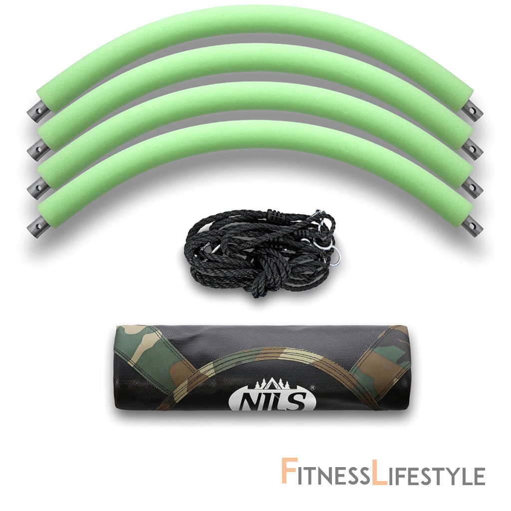 Rám s priemerom 110 centimetrov je vyrobený z oceľovej guľatiny s priemerom 25 milimetrov, na ktoré je pre maximálne bezpečie nalepená vysoká vrstva PE peny. Poťah modelu NB5032 je vyrobený z kombinácie polypropylénu a tkaniny Oxford 600D, ktorá je maximálne odolná voči poškodeniu a povětrnostím vplyvom ako je dážď a sneh, hniezdo tak nemusíte schovávať keď práve začne pršať. Nosná, polyetylénová lanká majú priemer 10 milimetrov a dĺžku 180 cm. Keď tieto vlastnosti skombinujeme tak získame priestrannú hojdačku s nosnosťou 150 kilogramov, na ktoré sa vybláznia aj viac detí naraz.