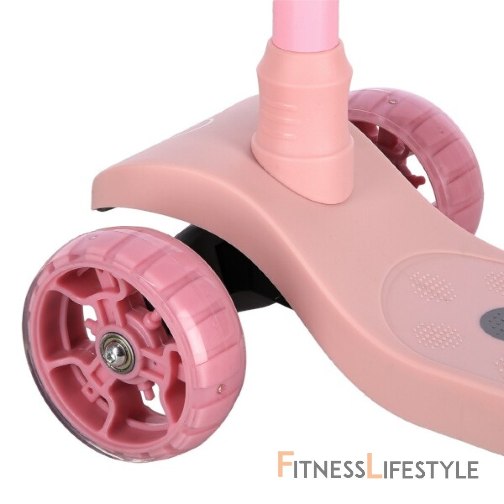 Predné kolieska s priemerom 120 milimetrov sú osadené bielymi LED diódami, zadné koliesko s priemerom 90 milimetrov diódami farebnými. Svietiace LED diódy slúžia ako zaujímavý, vizuálny prvok, zvyšujú záujem detí av neposlednom rade zvyšujú viditeľnosť kolobežky napríklad za šera. Kolieska svietia automaticky počas ich otáčania. Ďalej sú kolieska osadené ložiskami ABEC 7 pre plynulú jazdu. Zadný blatník slúži ako nášľapná brzda na bezpečné zastavenie kolobežky.