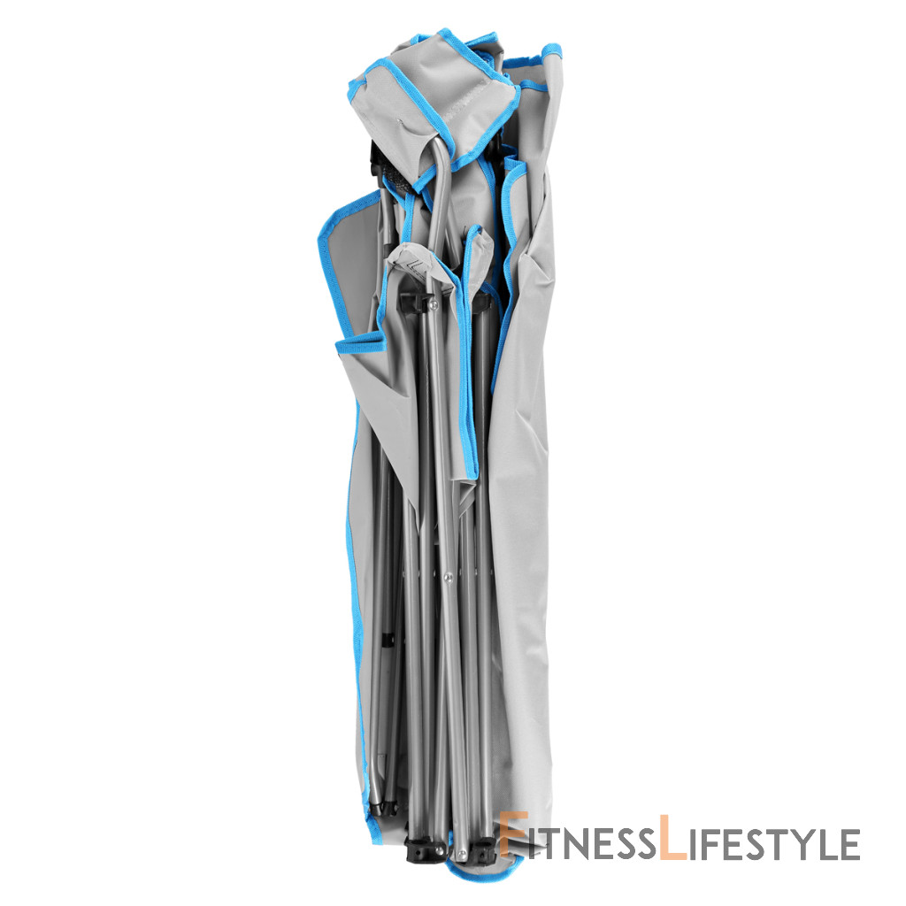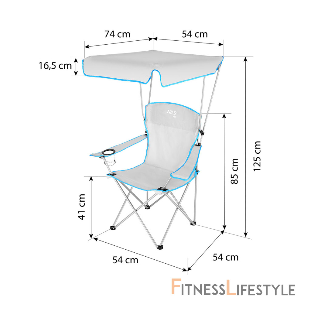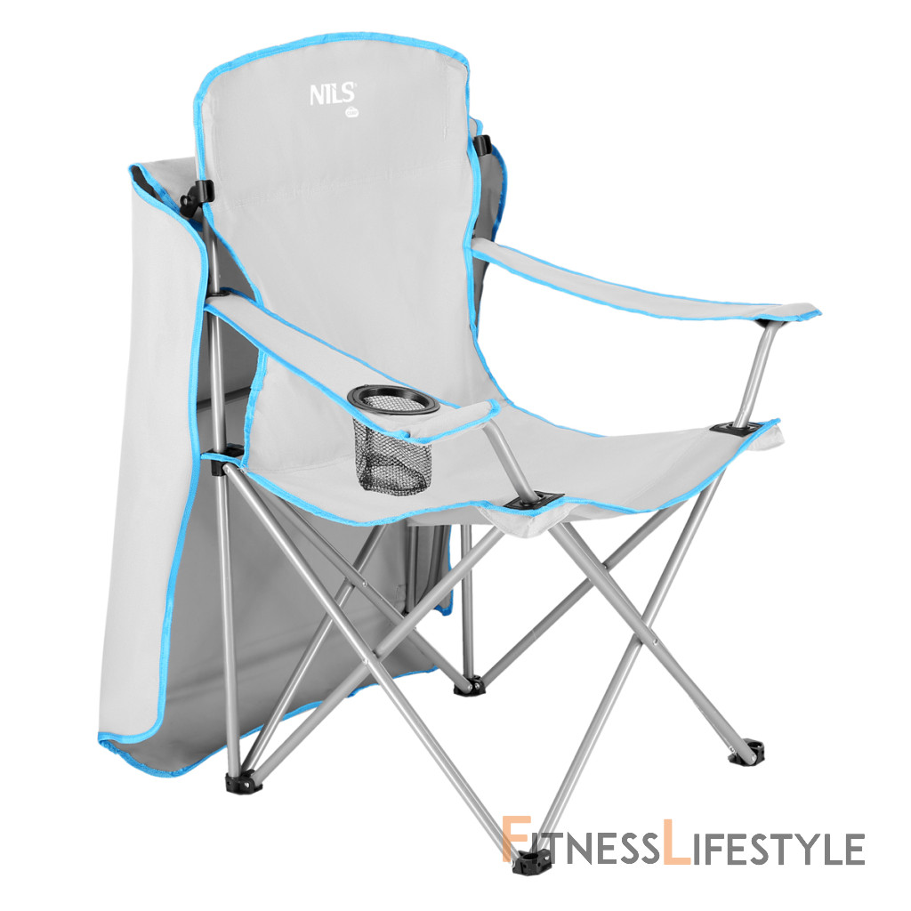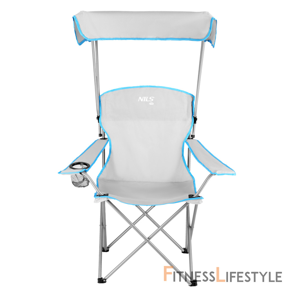 Skladacia, kempingová stolička so strieškou NILS Camp NC3087 je ideálna k vode, na ryby, na festival, alebo napríklad na dovolenku pod stan. Zložiteľná strieška ochráni pred slnečnými lúčmi alebo drobnou prehánkou. Charakteristickým rysom modelu NC3087 je strieška, ktorú možno ľahko sklopiť za stoličku. V prípade potreby dodatočnej ochrany pred slnkom alebo drobnými dažďovými zrážkami je možné striešku rýchlo zdvihnúť. Stabilná konštrukcia je vyrobená z oceľových rúrok s priemerom 16 milimetrov, ktoré sú k sebe spojené pomocou kvalitných nitov. Poťah je vyrobený z polyesteru v úprave oxford 600D. Táto tkanina je maximálne odolná voči poškodeniu a poveternostným vplyvom ako je dážď a sneh. Všetky miesta, kde rám prechádza poťahom, sú opatrené plastovými výstuhami s prešitím. Kombinácia kvalitnej konštrukcie a odolnej tkaniny zaisťuje nosnosť až 110 kilogramov. Plastové nožičky majú tvar štvorca a zvyšujú stabilitu kresla, zamedzujú jeho pohybu av mäkkom podloží (napríklad piesok) sa nebúria. Lakťové opierky majú možnosť regulácie výšky jednoduchým posunom zadnej časti po profile konštrukcie. Pravá opierka lakťa je opatrená košíkom, do ktorého sa pohodlne zmestí menšia fľaša, alebo vysoký pohár. Pre ľahké prenášanie je možné stoličku zložiť. Parametre: Upozornenie: