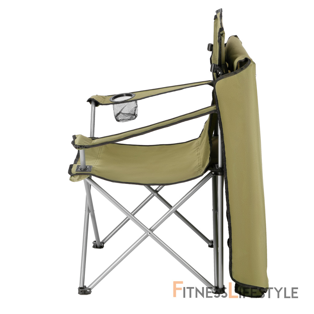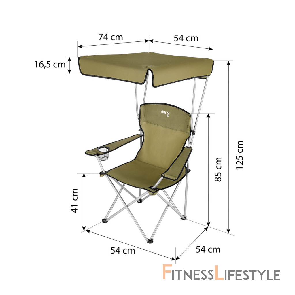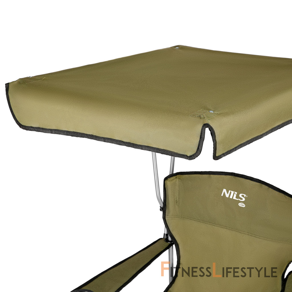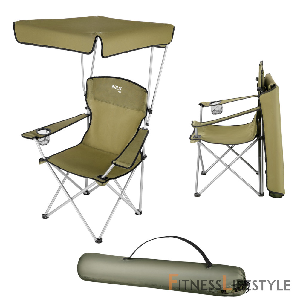 Skladacia, kempingová stolička so strieškou NILS Camp NC3087 je ideálna k vode, na ryby, na festival, alebo napríklad na dovolenku pod stan. Zložiteľná strieška ochráni pred slnečnými lúčmi alebo drobnou prehánkou. Charakteristickým rysom modelu NC3087 je strieška, ktorú možno ľahko sklopiť za stoličku. V prípade potreby dodatočnej ochrany pred slnkom alebo drobnými dažďovými zrážkami je možné striešku rýchlo zdvihnúť. Stabilná konštrukcia je vyrobená z oceľových rúrok s priemerom 16 milimetrov, ktoré sú k sebe spojené pomocou kvalitných nitov. Poťah je vyrobený z polyesteru v úprave oxford 600D. Táto tkanina je maximálne odolná voči poškodeniu a poveternostným vplyvom ako je dážď a sneh. Všetky miesta, kde rám prechádza poťahom, sú opatrené plastovými výstuhami s prešitím. Kombinácia kvalitnej konštrukcie a odolnej tkaniny zaisťuje nosnosť až 110 kilogramov. Plastové nožičky majú tvar štvorca a zvyšujú stabilitu kresla, zamedzujú jeho pohybu av mäkkom podloží (napríklad piesok) sa nebúria. Lakťové opierky majú možnosť regulácie výšky jednoduchým posunom zadnej časti po profile konštrukcie. Pravá opierka lakťa je opatrená košíkom, do ktorého sa pohodlne zmestí menšia fľaša, alebo vysoký pohár. Pre ľahké prenášanie je možné stoličku zložiť. Parametre: Upozornenie: