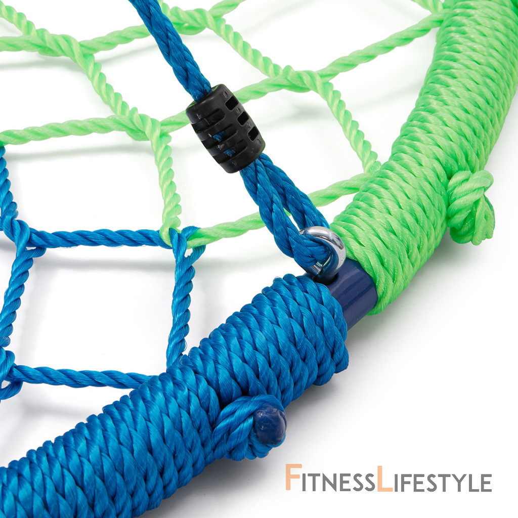 Rám s priemerom 100 centimetrov je vyrobený z oceľovej guľatiny s priemerom 32 milimetrov, ktorá je pre maximálnu bezpečnosť omotaná lanom. Polyetylénový výplet modelu NB5039 má priemer 6,5 milimetra a je maximálne odolný voči poveternostným vplyvom ako je dážď a sneh, hniezdo tak nemusíte schovávať keď práve začne pršať. Nosné, polyetylénové lanká majú priemer 10 milimetrov a dĺžku 180 cm. Keď tieto vlastnosti skombinujeme tak získame priestrannú hojdačku s nosnosťou 180 kilogramov, na ktorej sa vyšantia aj viac detí naraz.