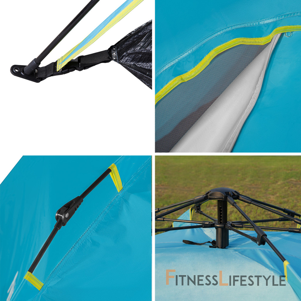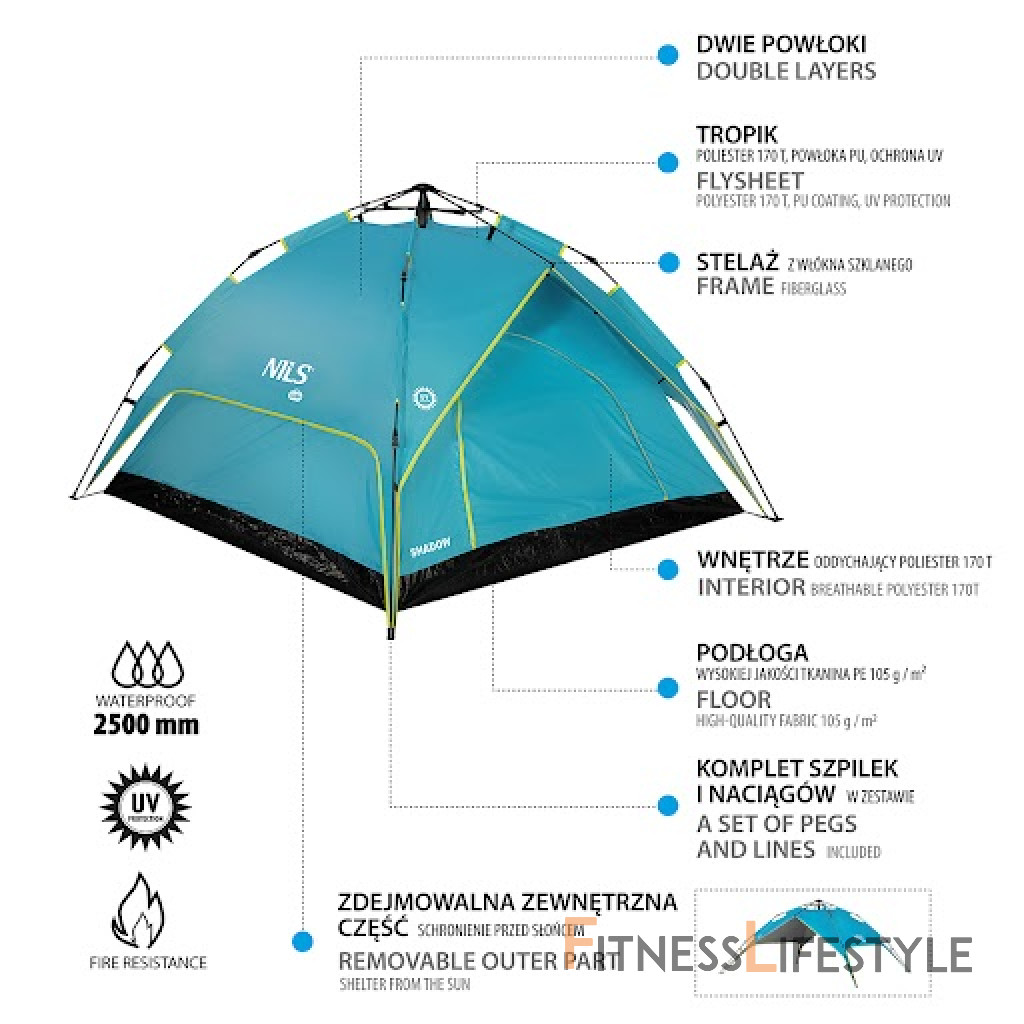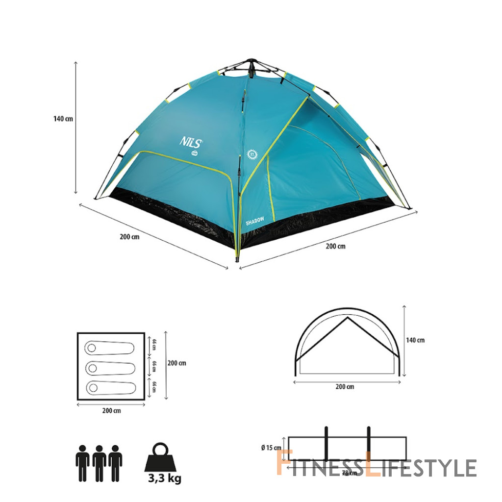 NILS Camp NC7819 Shadow je 3 osobový stan, ktorý oceníte pri potulkách prírodou, spaní pod "širákom" alebo pri krátkom pobyte v kempe. Odnímateľné tropiko je možné využiť ako prístrešok, ktorý vás ochráni pred dažďom alebo slnkom. Automatická skladacia konštrukcia zaisťuje rýchle zloženie a rozloženie stanu. Automatická skladacia konštrukcia Model NC7819 Shadow je možné rozložiť v priebehu pár okamihov. Jednoducho ho vytiahnete z transportného obalu, rozprestrite, narovnáte 4 hlavné prúty rámu, roztiahnete ho a zaistíte posunutím mechanizmu sa stredu kupoly, tým je stan pripravený. V prípade potreby je možné stan zaistiť pomocou dodávaných vypínacích šnúr a kolíkov. V prípade rozkladania sa postupuje v opačnom smere. Mechanizmus v strede kupoly sa odistí, hlavné prúty sa zložia a celý stan sa zbalí do dodávaného obalu. Odnímateľné tropiko Na ráme stanu je navlečené tropiko ak nemu je pomocou remienkov s prackami zavesená spálňa. Spálňa ide v prípade potreby oddeliť a samonosné tropiko je možné použiť napríklad ako plážový prístrešok chrániaci pred slnečnými lúčmi, ako doplnok k piknikovej deke počas príjemného popoludnia v parku alebo ako ochranu pred dažďom. Tropiko je vyrobené z polyesteru s polyuretánovým záterom a má podlepené švy, vďaka tomu je nepremokavé do výšky vodného stĺpca 3000 mm H2O - zvládne teda aj jesennú búrku. Tkanina je odolná voči UV žiareniu, nebledne a nestráca pevnosť. Priestranná spálňa Horná polovica je vyrobená z polyesteru - z rovnakého materiálu ako tropiko. Polyetylénová podlaha má gramáž 105g/m2 a je vodeodolná do 2500 mm H2O. Rozmery spálne sú 200 x 200 centimetrov a výška je 125 centimetrov. V spálni sa teda pohodlne vyspia 3 osoby. Stan NC7819 Shadow je vybavený dvoma vchodmi, ktoré sa nachádzajú oproti sebe. Oba vchody tvoria ako plachta, tak aj moskytiéra pre maximálnu cirkuláciu vzduchu. V strede spálne sa nachádza praktické pútko s háčikom napríklad na zavesenie svietidla. Parametre: Upozornenie: