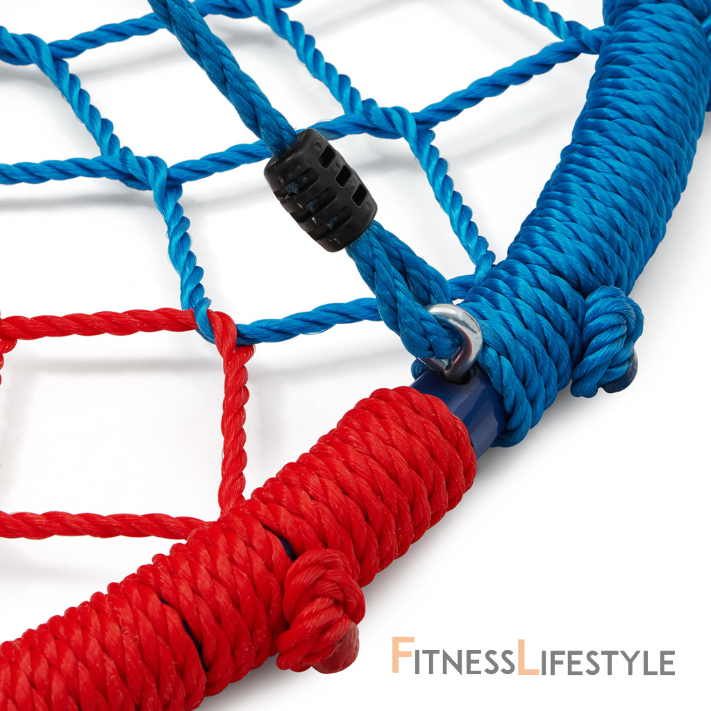 Rám s priemerom 100 centimetrov je vyrobený z oceľovej guľatiny s priemerom 32 milimetrov, ktorá je pre maximálnu bezpečnosť omotaná lanom. Polyetylénový výplet modelu NB5039 má priemer 6,5 milimetra a je maximálne odolný voči poveternostným vplyvom ako je dážď a sneh, hniezdo tak nemusíte schovávať keď práve začne pršať. Nosné, polyetylénové lanká majú priemer 10 milimetrov a dĺžku 180 cm. Keď tieto vlastnosti skombinujeme tak získame priestrannú hojdačku s nosnosťou 180 kilogramov, na ktorej sa vyšantia aj viac detí naraz.