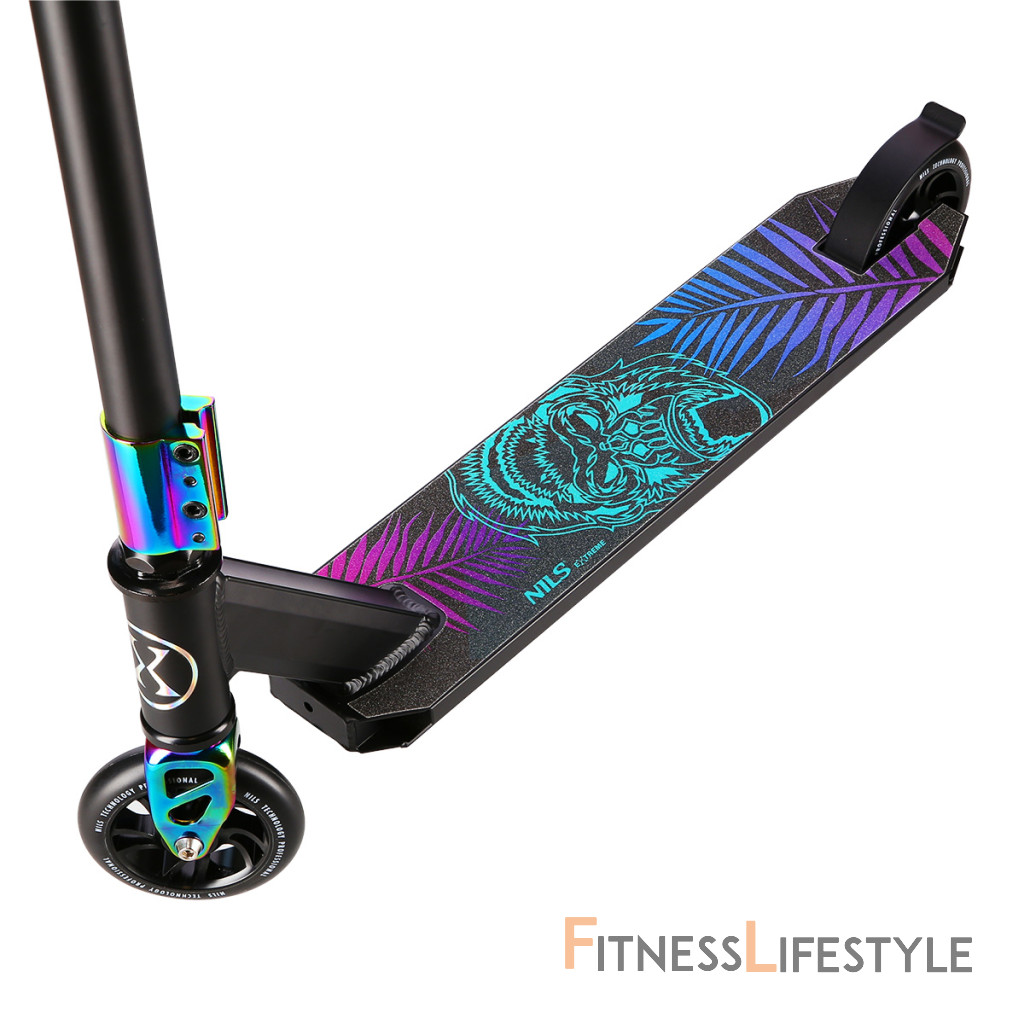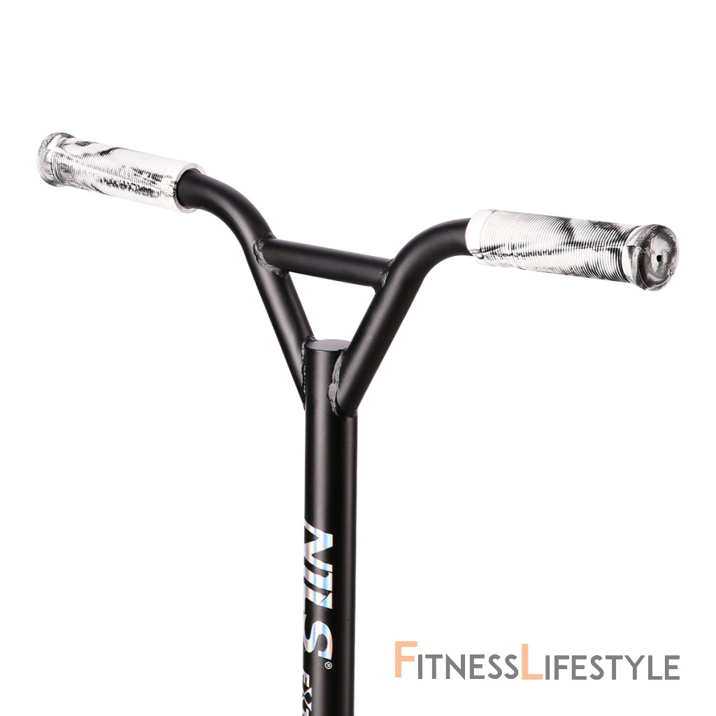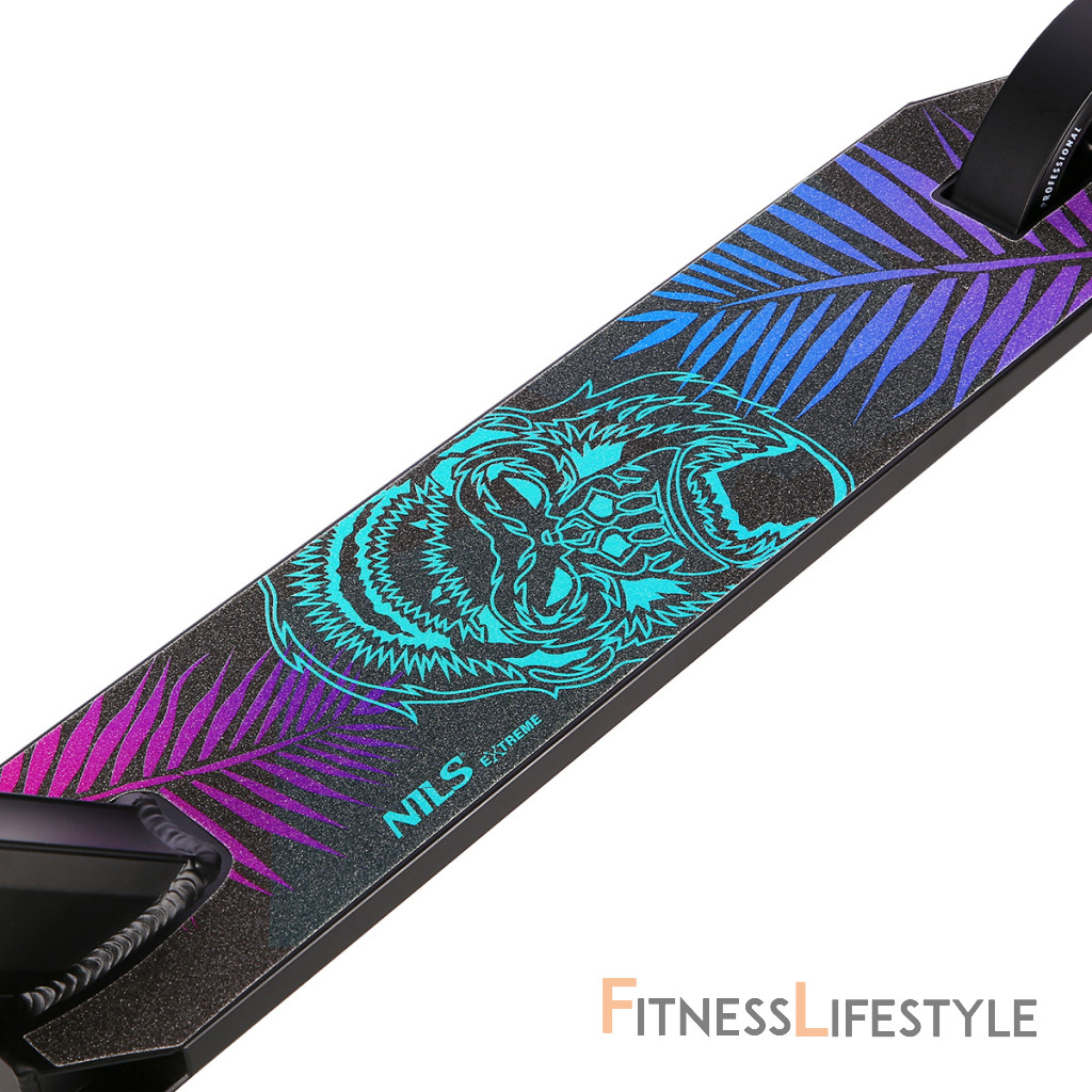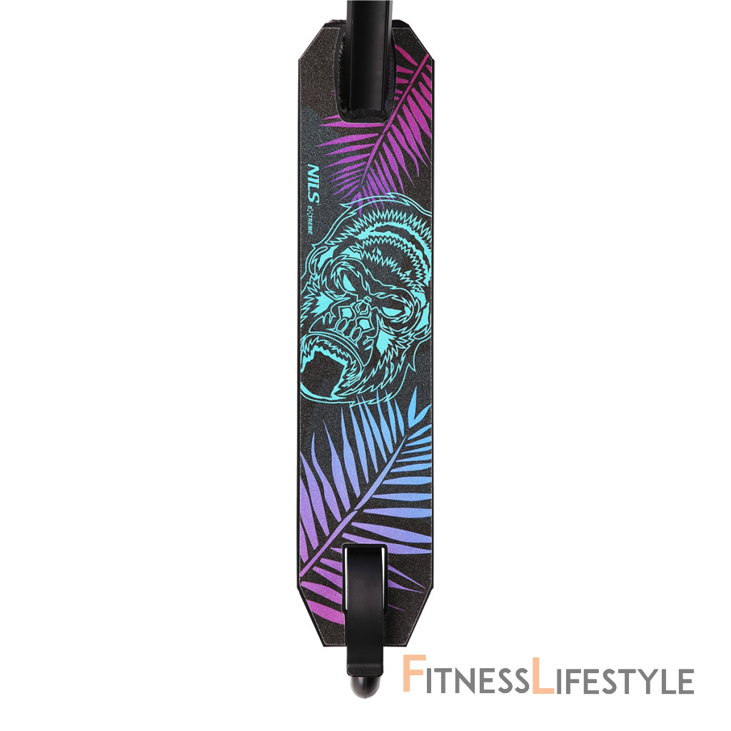 Freestyle kolobežka NILS Extreme HS002 je určená pre deti, mládež a dospelých. Pevný hliníkový rám a oceľové riadidlá sú zárukou, že kolobežka HS002 vydrží aj to najdrsnejšie zaobchádzanie. HS002 je ideálny na asfaltový povrch a spevnené mestské chodníky. Kolieska s rozmermi 110 x 24 mm s ložiskami ABEC 9 zaručujú rýchlu a svižnú jazdu bez zbytočne vynaloženej námahy. Zadná nášľapná brzda flex fender zase zaisťuje maximálnu bezpečnosť používania a umožňuje okamžité zastavenie kolobežky. Freestylová kolobežka nemá žiadny skladací mechanizmus ani systém nastavenia výšky riadidiel - tieto typy riešení by mohli oslabiť celú konštrukciu, čo samozrejme nie je žiaduce pri produkte, kde je odolnosť zásadná. Model HS002 má trojkomorový, hliníkový deck a široké bezzávitové riadidlá pripevnené štvorskrutkovou svorkou. Náboj riadidiel je skrutkovaný. Riadidlá samozrejme umožňujú ich pretáčanie o 360 °. Gumené gripy zaisťujú pevný úchop. Parametre: Upozornenie: