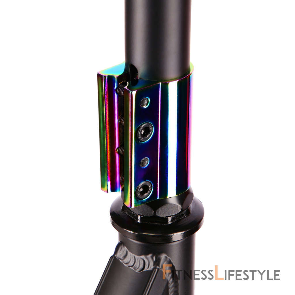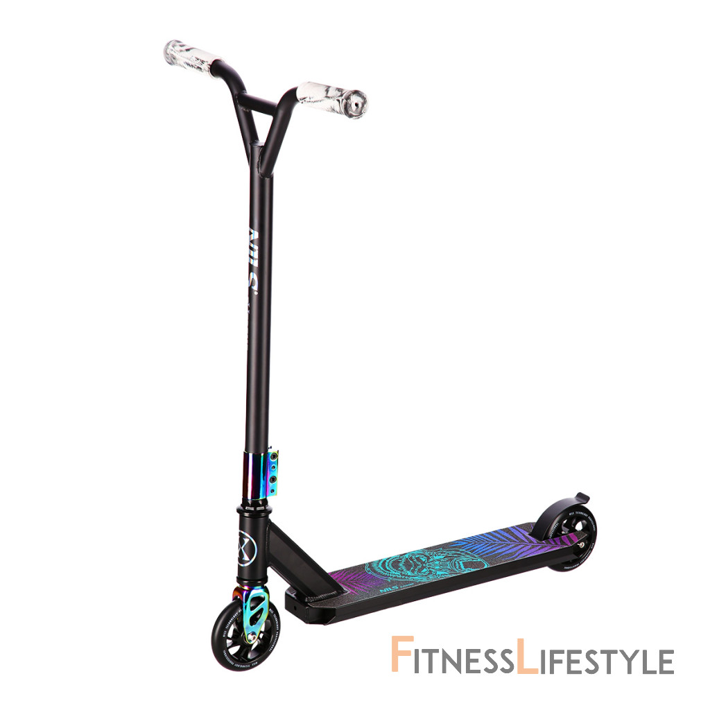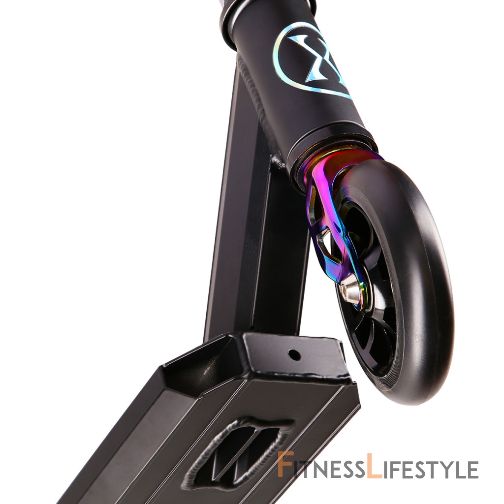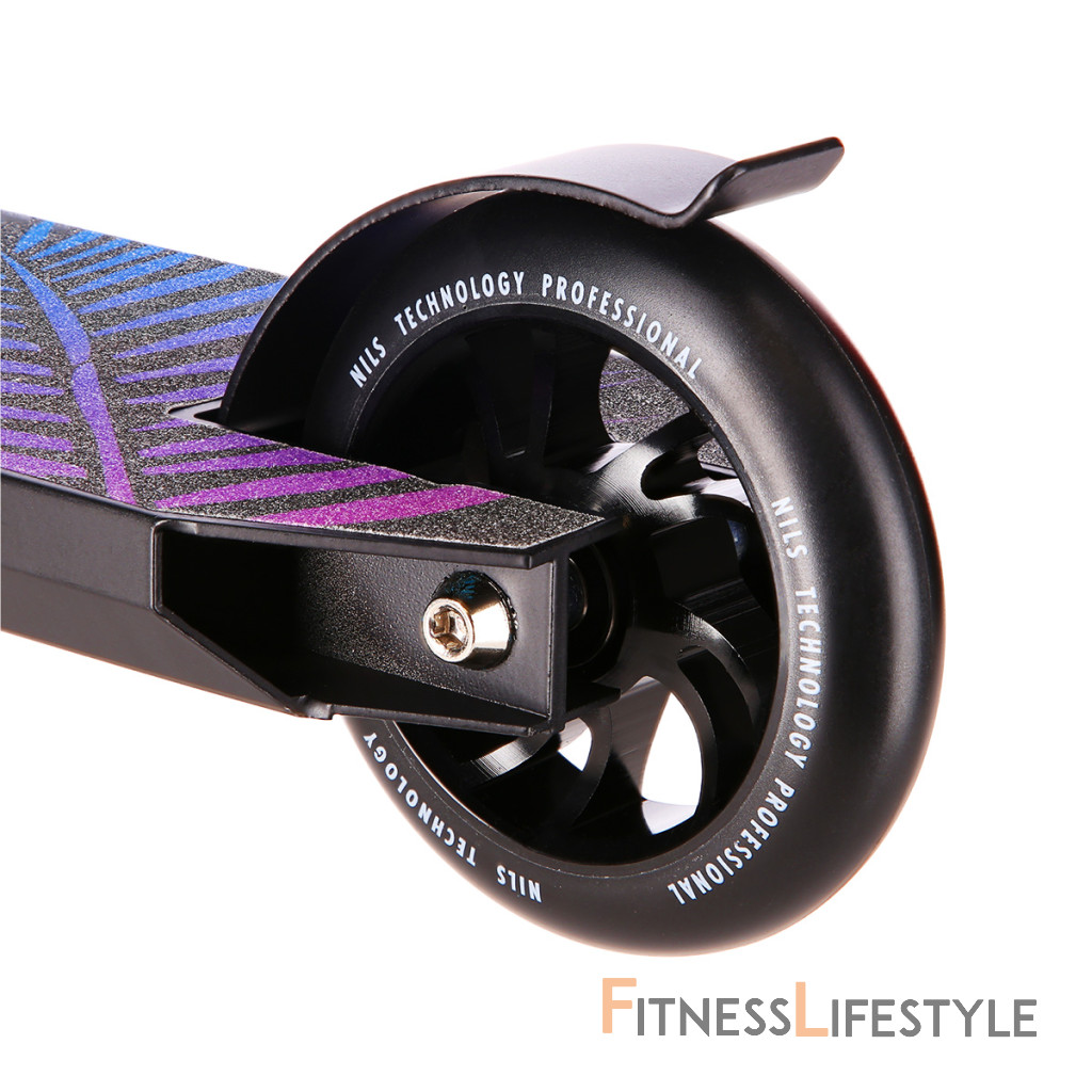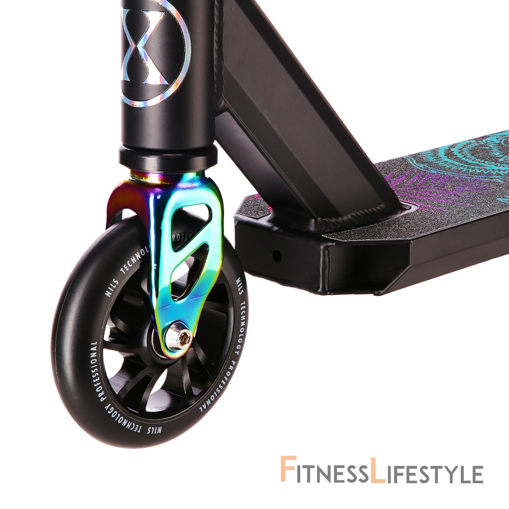 Freestyle kolobežka NILS Extreme HS002 je určená pre deti, mládež a dospelých. Pevný hliníkový rám a oceľové riadidlá sú zárukou, že kolobežka HS002 vydrží aj to najdrsnejšie zaobchádzanie. HS002 je ideálny na asfaltový povrch a spevnené mestské chodníky. Kolieska s rozmermi 110 x 24 mm s ložiskami ABEC 9 zaručujú rýchlu a svižnú jazdu bez zbytočne vynaloženej námahy. Zadná nášľapná brzda flex fender zase zaisťuje maximálnu bezpečnosť používania a umožňuje okamžité zastavenie kolobežky. Freestylová kolobežka nemá žiadny skladací mechanizmus ani systém nastavenia výšky riadidiel - tieto typy riešení by mohli oslabiť celú konštrukciu, čo samozrejme nie je žiaduce pri produkte, kde je odolnosť zásadná. Model HS002 má trojkomorový, hliníkový deck a široké bezzávitové riadidlá pripevnené štvorskrutkovou svorkou. Náboj riadidiel je skrutkovaný. Riadidlá samozrejme umožňujú ich pretáčanie o 360 °. Gumené gripy zaisťujú pevný úchop. Parametre: Upozornenie:
