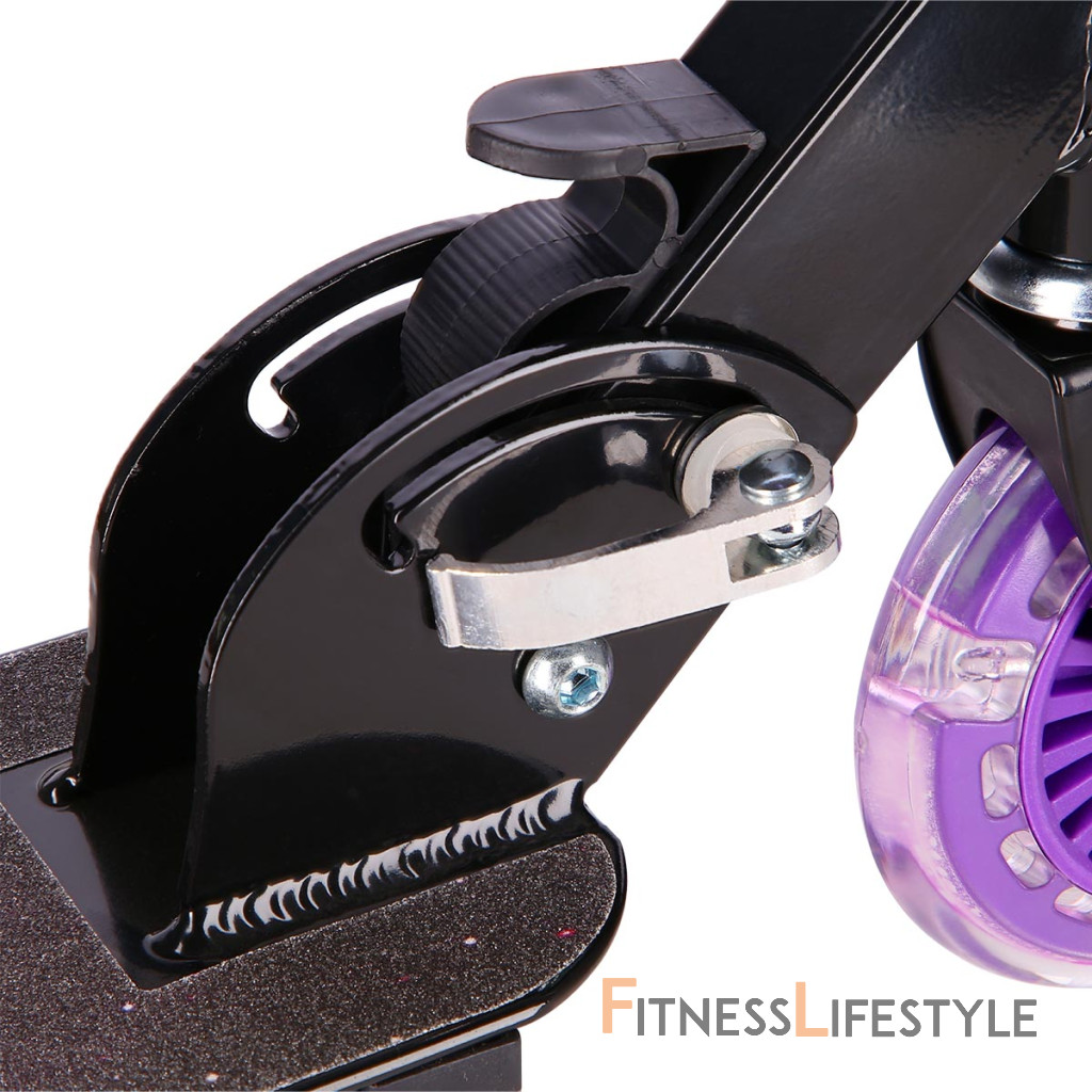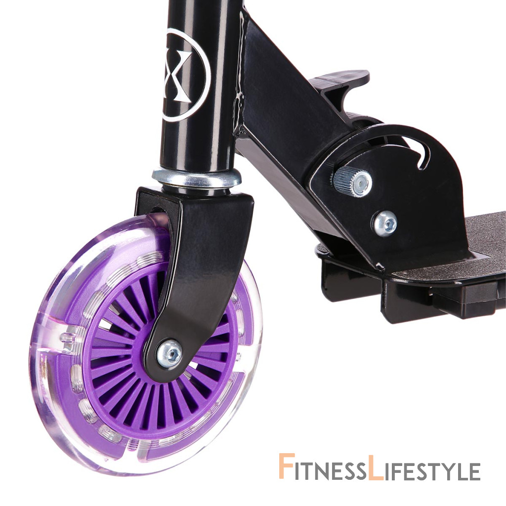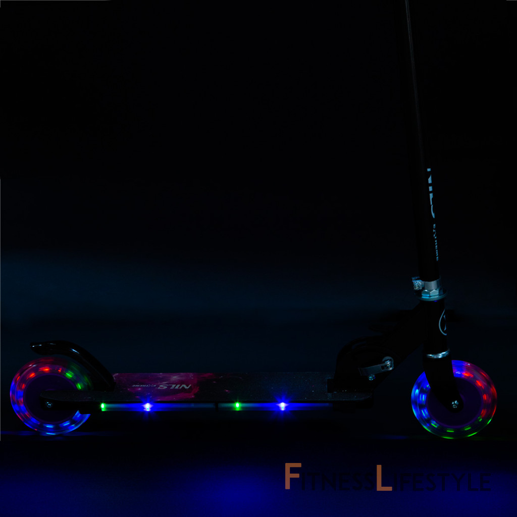 Kolieska s priemerom 125 milimetrov sú osadené farebnými LED diódami, tie slúžia ako zaujímavý, vizuálny prvok, zvyšujú záujem detí av neposlednom rade zvyšujú viditeľnosť kolobežky napríklad za šera. Kolieska svietia automaticky počas ich otáčania. Ďalej sú kolieska osadené ložiskami ABEC 5 pre pohodovú jazdu. Zadný blatník slúži ako nášľapná brzda na bezpečné zastavenie kolobežky.