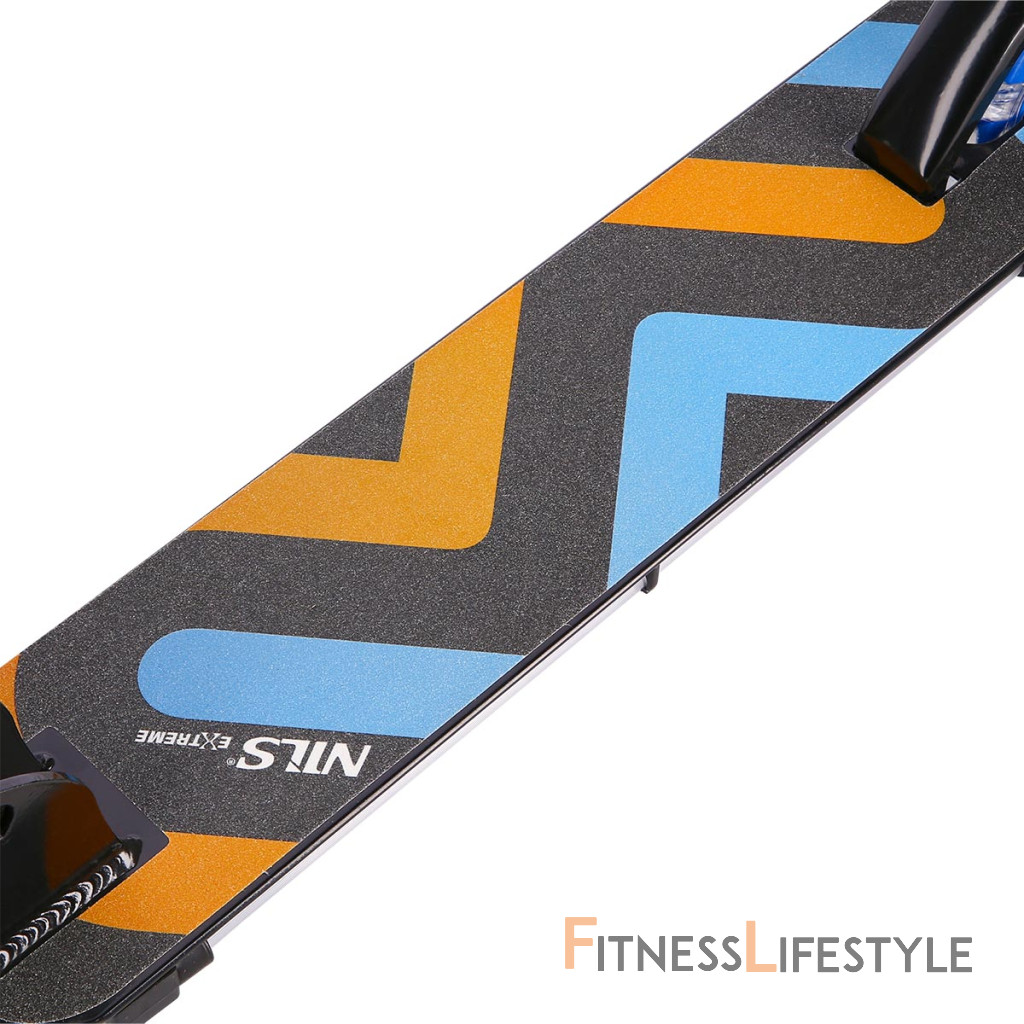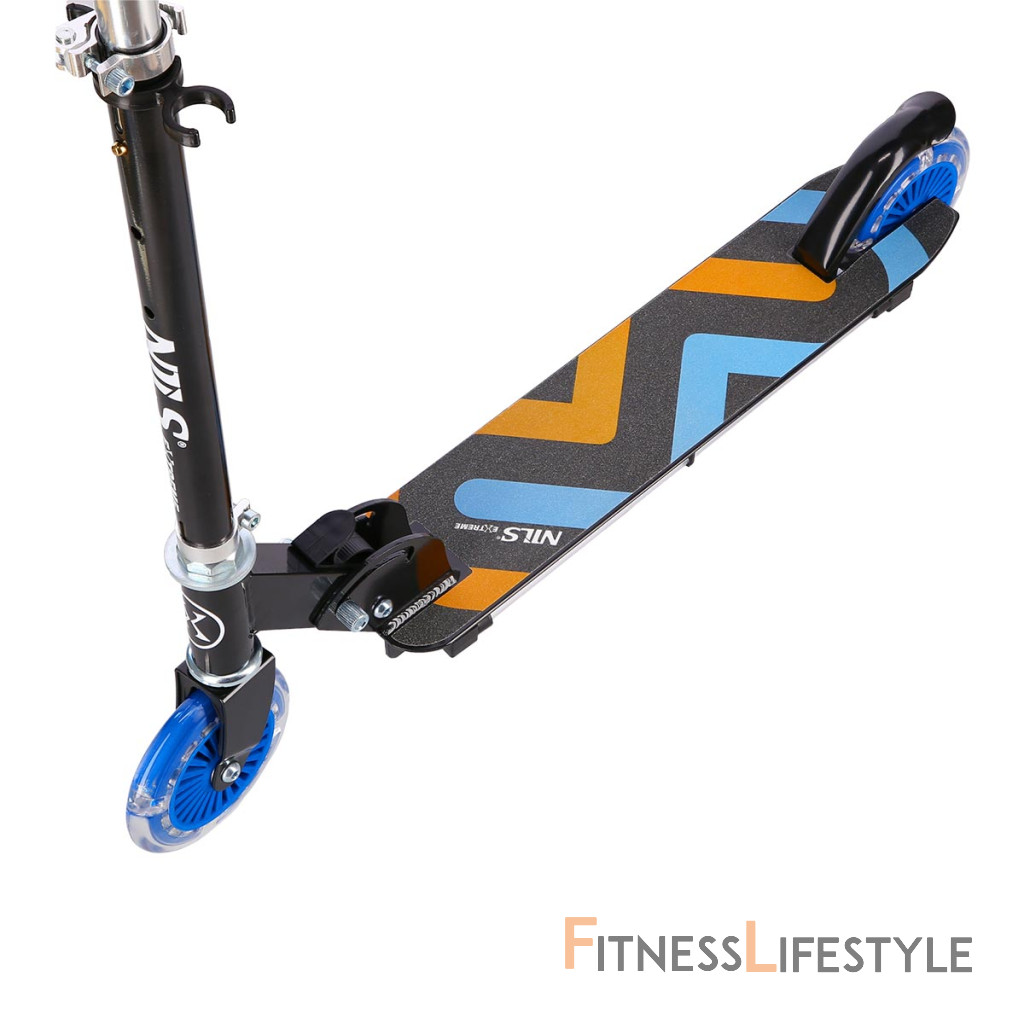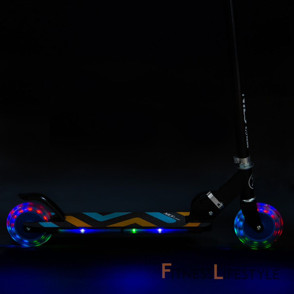 NILS Extreme HD025 je skladacia kolobežka pre deti a dorast. Jej nespornou výhodou je moderný dizajn, skvelé jazdné vlastnosti a svietiace kolieska s platformou! Je ideálny pre rekreačnú jazdu na asfalte, betónových plochách a spevnených chodníkoch. Stabilná konštrukcia Konštrukcia je vyrobená z ocele a hliníka, vďaka čomu je kolobežka veľmi ľahká a odolná. Hmotnosť kolobežky dosahuje iba 2,3 kg. Výškovo nastaviteľné riadidlá Teleskopické riadidlá sú výškovo nastaviteľné do 4 polôh (60 - 68 - 73 - 78 cm od zeme). Zmena nastavenia výšky sa vykonáva uvoľnením páčky rýchloupináku, stlačením poistného čapu a vysunutím, alebo zasunutím vnútornej tyče riadidiel. Pre úsporu miesta je možné riadidlá zložiť - k tomu je potrebné uvoľniť páčku spodného rýchloupináku a potiahnuť tiahlo smerom nahor, riadidlá je možné následne sklopiť. Gripy na riadidlách sú vyrobené z TPR pre pevný a pohodlný úchop, šírka riadidiel je 32 centimetrov a madlá je možné sklopiť. Robustná základňa pre správny postoj Priestranný deck ponúka dostatok priestoru (30 x 10 cm) pre obe nohy. Hliníkové stúpadlo je v priestore pre topánky opatrené griptapom. Bočnice stúpadla sú osadené trubicami s farebnými, blikajúcimi LED diódami, ktoré sú napájané pomocou troch mikrotužkových batérií (AAA/LR03), tie je potrebné zakúpiť samostatne. Svietiace, rýchle kolieska Kolieska s priemerom 125 milimetrov sú osadené farebnými LED diódami, tie slúžia ako zaujímavý, vizuálny prvok, zvyšujú záujem detí av neposlednom rade zvyšujú viditeľnosť kolobežky napríklad za šera. Kolieska svietia automaticky počas ich otáčania. Ďalej sú kolieska osadené ložiskami ABEC 5 pre pohodovú jazdu. Zadný blatník slúži ako nášľapná brzda na bezpečné zastavenie kolobežky. Parametre: Upozornenie: