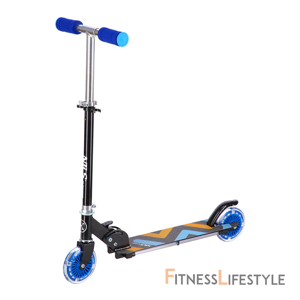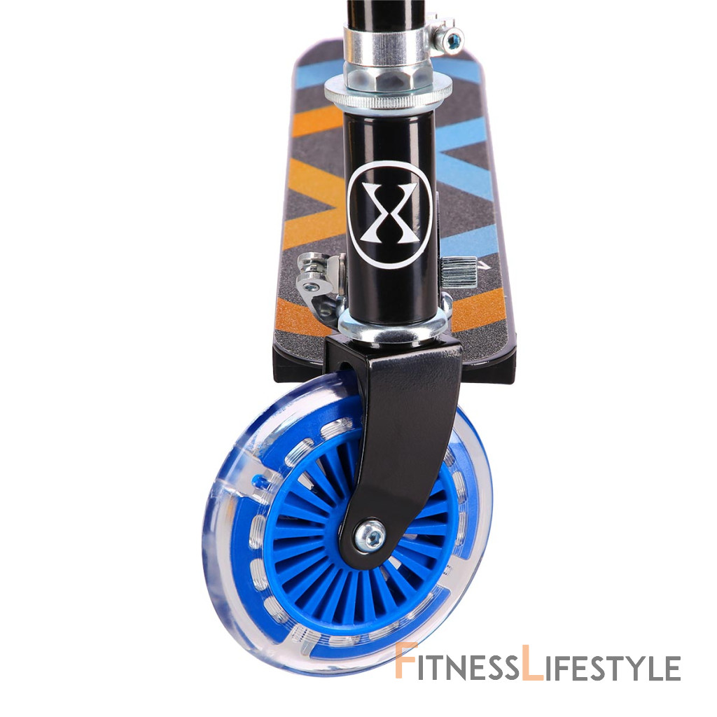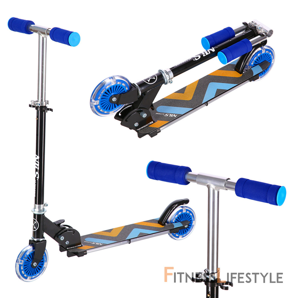 NILS Extreme HD025 je skladacia kolobežka pre deti a dorast. Jej nespornou výhodou je moderný dizajn, skvelé jazdné vlastnosti a svietiace kolieska s platformou! Je ideálny pre rekreačnú jazdu na asfalte, betónových plochách a spevnených chodníkoch. Stabilná konštrukcia Konštrukcia je vyrobená z ocele a hliníka, vďaka čomu je kolobežka veľmi ľahká a odolná. Hmotnosť kolobežky dosahuje iba 2,3 kg. Výškovo nastaviteľné riadidlá Teleskopické riadidlá sú výškovo nastaviteľné do 4 polôh (60 - 68 - 73 - 78 cm od zeme). Zmena nastavenia výšky sa vykonáva uvoľnením páčky rýchloupináku, stlačením poistného čapu a vysunutím, alebo zasunutím vnútornej tyče riadidiel. Pre úsporu miesta je možné riadidlá zložiť - k tomu je potrebné uvoľniť páčku spodného rýchloupináku a potiahnuť tiahlo smerom nahor, riadidlá je možné následne sklopiť. Gripy na riadidlách sú vyrobené z TPR pre pevný a pohodlný úchop, šírka riadidiel je 32 centimetrov a madlá je možné sklopiť. Robustná základňa pre správny postoj Priestranný deck ponúka dostatok priestoru (30 x 10 cm) pre obe nohy. Hliníkové stúpadlo je v priestore pre topánky opatrené griptapom. Bočnice stúpadla sú osadené trubicami s farebnými, blikajúcimi LED diódami, ktoré sú napájané pomocou troch mikrotužkových batérií (AAA/LR03), tie je potrebné zakúpiť samostatne. Svietiace, rýchle kolieska Kolieska s priemerom 125 milimetrov sú osadené farebnými LED diódami, tie slúžia ako zaujímavý, vizuálny prvok, zvyšujú záujem detí av neposlednom rade zvyšujú viditeľnosť kolobežky napríklad za šera. Kolieska svietia automaticky počas ich otáčania. Ďalej sú kolieska osadené ložiskami ABEC 5 pre pohodovú jazdu. Zadný blatník slúži ako nášľapná brzda na bezpečné zastavenie kolobežky. Parametre: Upozornenie:
