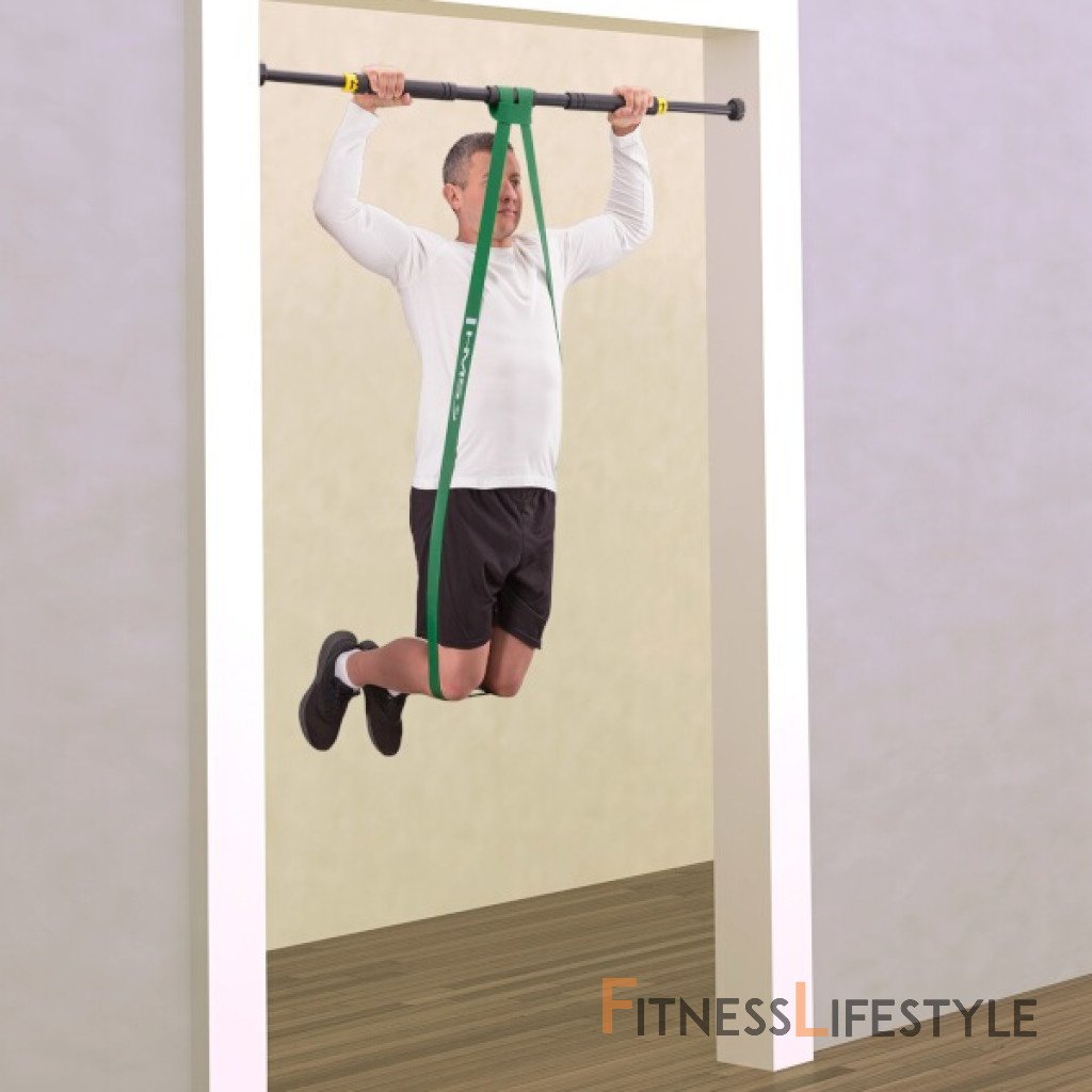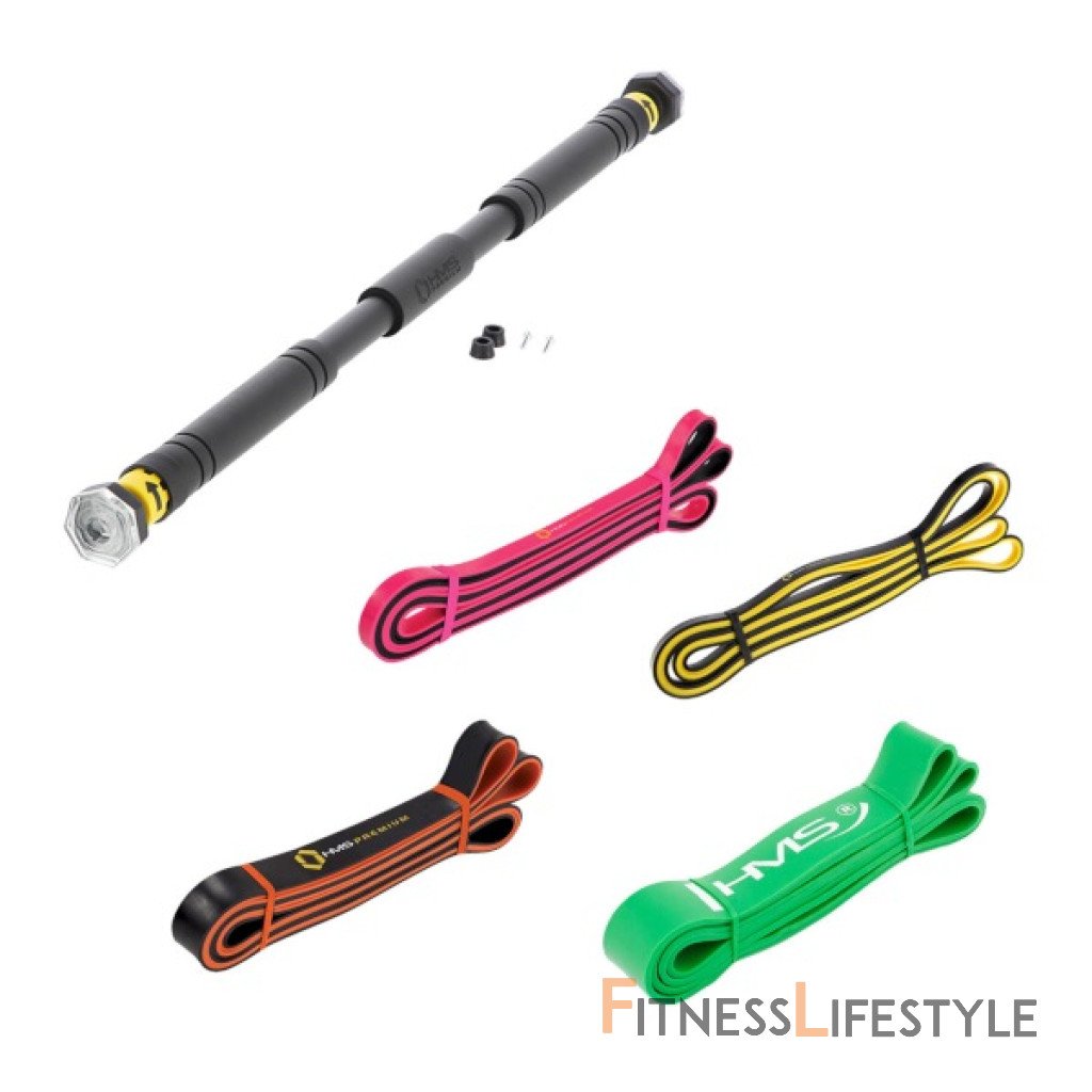 Predstavujeme sadu kombinujúcu hrazdu do dverí HMS Premium DD201 v komplete s odporovými gumami. Takáto kombinácia poskytuje mnoho možností cvičenia. Gumy je možné použiť na základný tréning, rozcvičenie, rehabilitáciu a tiež ako pomôcku na odľahčenie záťaže pri niektorých cvikoch. Jedným z týchto cvikov je príťah na hrazde. Atraktívna možnosť pre tých, ktorí začínajú s tréningom. U pokročilých jedincov sa manéver s gumovým expandérom osvedčí v záverečnej sérii, kedy už potrebujete znížiť záťaž. Gumová páska natiahnutá cez kolená alebo chodidlá čiastočne odľahčí svalom a umožní vám sústrediť sa na správnu techniku. Aj začiatočníci, ktorí sa doteraz nedokázali pritiahnuť k hrazde, to teraz zvládnu na jedničku.