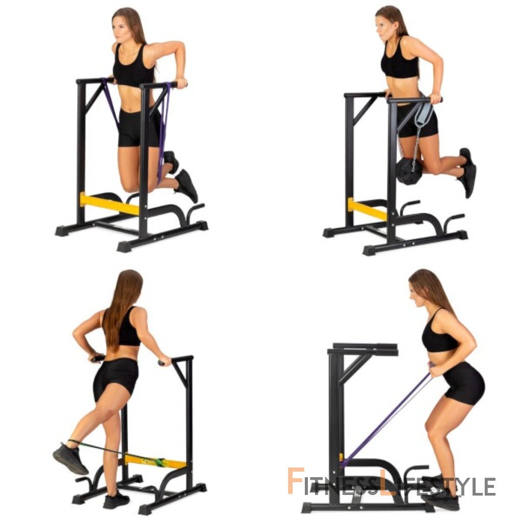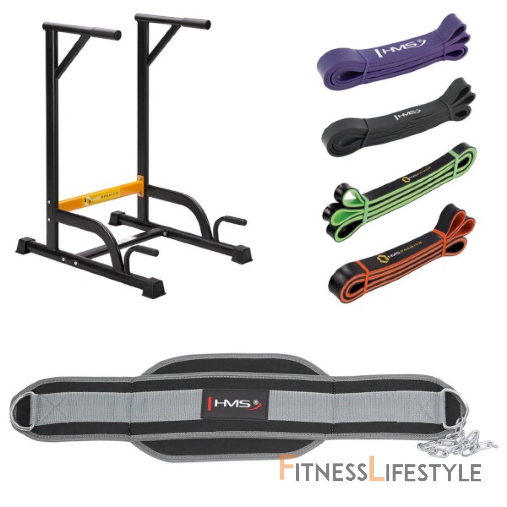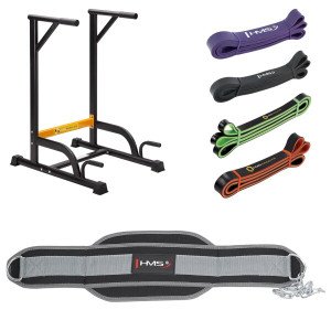 Predstavujeme sadu, ktorá kombinuje multifunkčné podpery HMS PWL8306 so záťažovým pásom HMS PST04 a kompletom odporových gúm. Táto kombinácia poskytuje širokú škálu možností cvičenia. Hlavným účelom podpier je vykonávanie tzv. dipov. Pre začiatočníkov môže byť toto cvičenie ťažké alebo dokonca nemožné. Ostatné prvky zostavy vám umožnia užiť si toto cvičenie na akejkoľvek úrovni pokročilosti. Keď je tréning s vlastnou váhou tela stále ešte výzvou, nastupujú odporové gumy. Zavesením gumy za madlá fungujú ako dopomoc pri dipoch aj klasickom kľučku. Týmto spôsobom budeme rozvíjať techniku a vďaka rôznemu rozsahu zaťaženia gumy budeme posilňovať vlastným tempom. Postupne bude možné vykonávať toto cvičenie bez pomoci a váha vlastného tela, nebude problém. Je však dôležité si uvedomiť, že sila sa bude naďalej zvyšovať av určitom okamihu bude zaťaženie tela nedostatočné. V takom prípade je nepostrádateľný záťažový pás, ktorý je súčasťou sady. Na retiazku PST04 možno ľahko navliecť voľné závažia. Je veľmi dôležité si uvedomiť, že elastické pásiky v kombinácii s PWL8306 majú oveľa viac využitia ako len pomoc pri dipoch. Po pripevnení k madlu je možné vykonávať veľké množstvo cvikov na rôzne svalové skupiny. Všetky súčasti sady sú najvyššej kvality, čo zaručuje bezpečnosť pri cvičení.