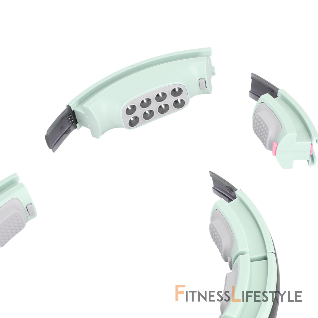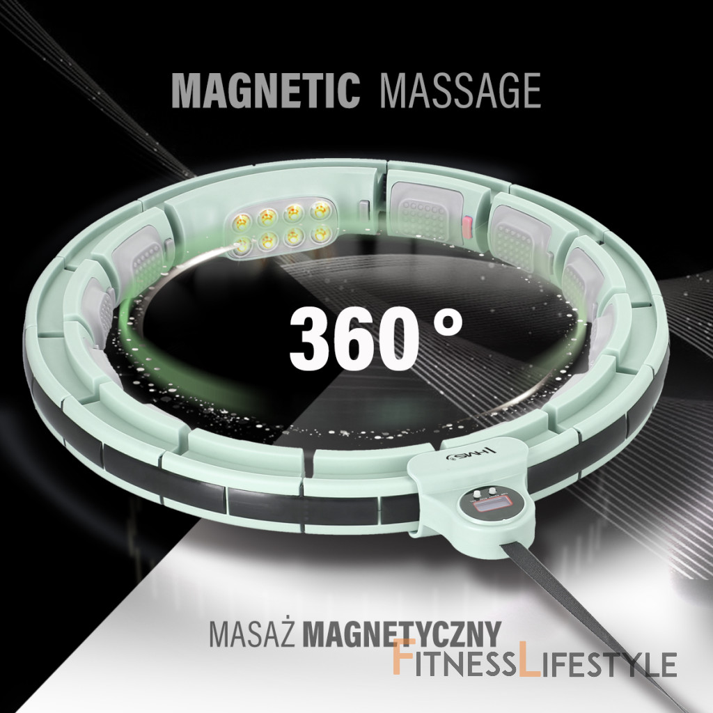 konštrukcia masáže Hula Hoop Stavba pozostáva z 12 rovnakých častí a jednej časti s magnetmi, ku ktorým sa pripájajú. Na zatvorenie obruče je potrebné použiť najmenej 9 dielov. Jednotlivé časti zakrývajú koľajnicu, ktorá sa vkladá pred zatvorením kotvy, ktorá je vybavená štyrmi kolesami guľovými ložiskami. Kotva je pomocou remienka na nastaviteľné dĺžky spojené s hmotnosťami s hmotnosťou 380 (+- 20) gramov. Reťazec je možné nastaviť na dĺžku 15 - 30 centimetrov, a to zmenou dĺžky reťazca, výsledná odstredivosť hmotnosti je nastavená - čím dlhšia je reťazec, tým „ťažšie“ bude hmotnosť.