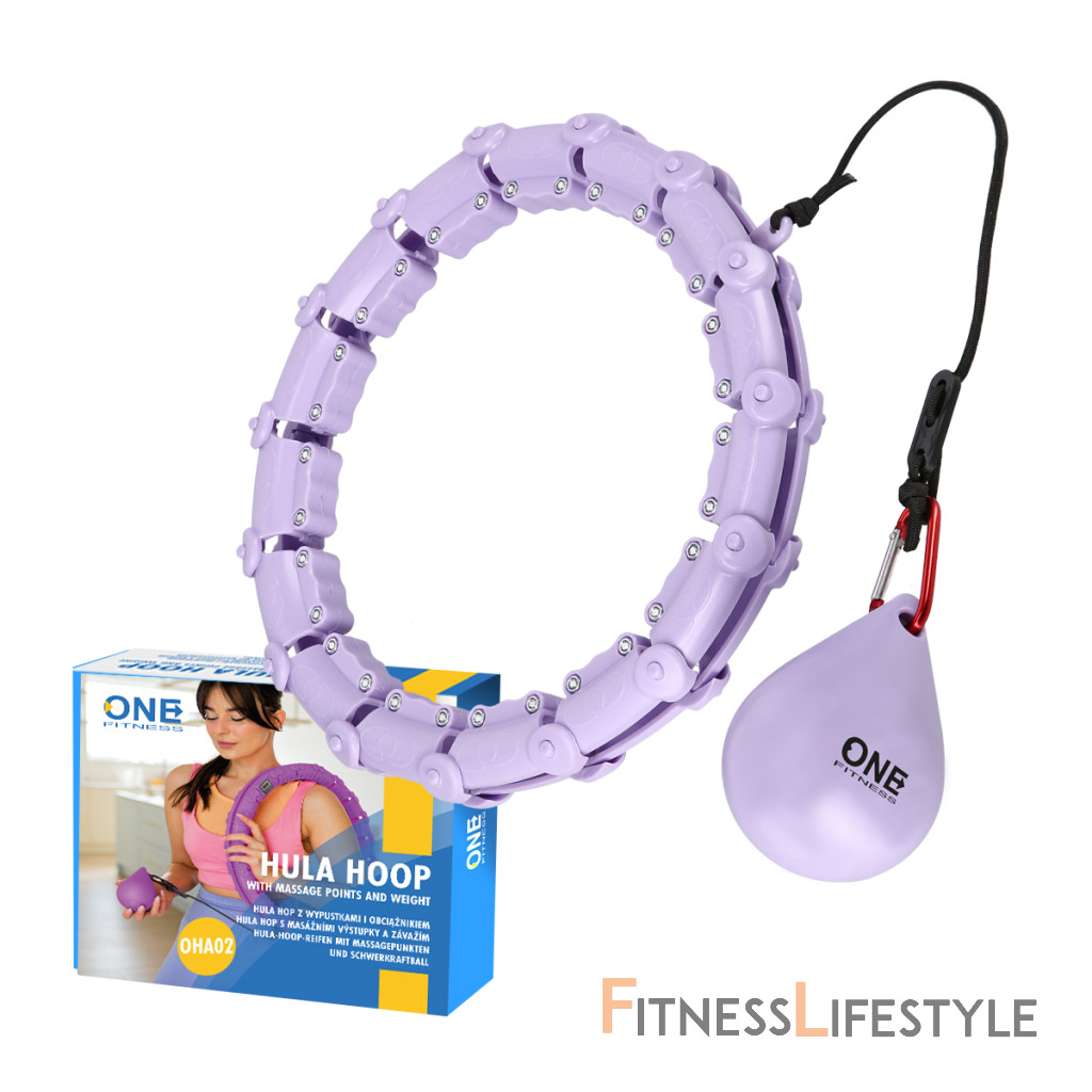 ONE Fitness OHA02 je hula hop obruč s nastaviteľnou dĺžkou, masážnymi výstupkami a rotujúcim závažím. Funkcia obruče OHA02 je veľmi jednoduchá. Konštrukcia sa skladá z 24 rovnakých dielov ktoré sa do seba skladajú. Aby išla obruč uzavrieť, tak je potrebné použiť najmenej 14 kusov, ktoré následne vytvoria kruh s vnútorným priemerom 20 centimetrov, pokiaľ spojíte všetkých 24 kusov, potom bude vnútorný priemer 39 centimetrov. Model OHA02 je vhodný pre obvod pása od 60-tich do 118-tich centimetrov. Jednotlivé diely v sebe skrývajú koľajnicu, do ktorej sa pred uzavretím zasunie kotva, ktorá je osadená štyrmi kolieskami - guličkovými ložiskami. Ku kotve je, pomocou dĺžkovo nastaviteľného povrázka, pripojené závažie s hmotnosťou 300 gramov. Povrázok je možné nastaviť na dĺžku 20 až 30 centimetrov, zmenou dĺžky povrázku sa nastavuje výsledná odstredivá sila závažia - čím dlhší povrázok, tým "ťažšie" bude závažie. Dĺžka obruče sa nastaví podľa obvodu pása tak, aby bola dostatočne voľná, ale zároveň aby nepadala cez boky. Závažie sa následne „vrhne“ smerom, do ktorého budeme krútiť boky a začneme tréning. Obruč OHA02 je z vnútornej strany opatrená plôškami, ktoré príjemne masírujú oblasť pása. Intenzitu tréningu ovplyvňuje dĺžka povrázku so závažím a rýchlosť, akú krútime boky. Pravidelným tréningom s hula hoopom OHA02 možno docieliť: