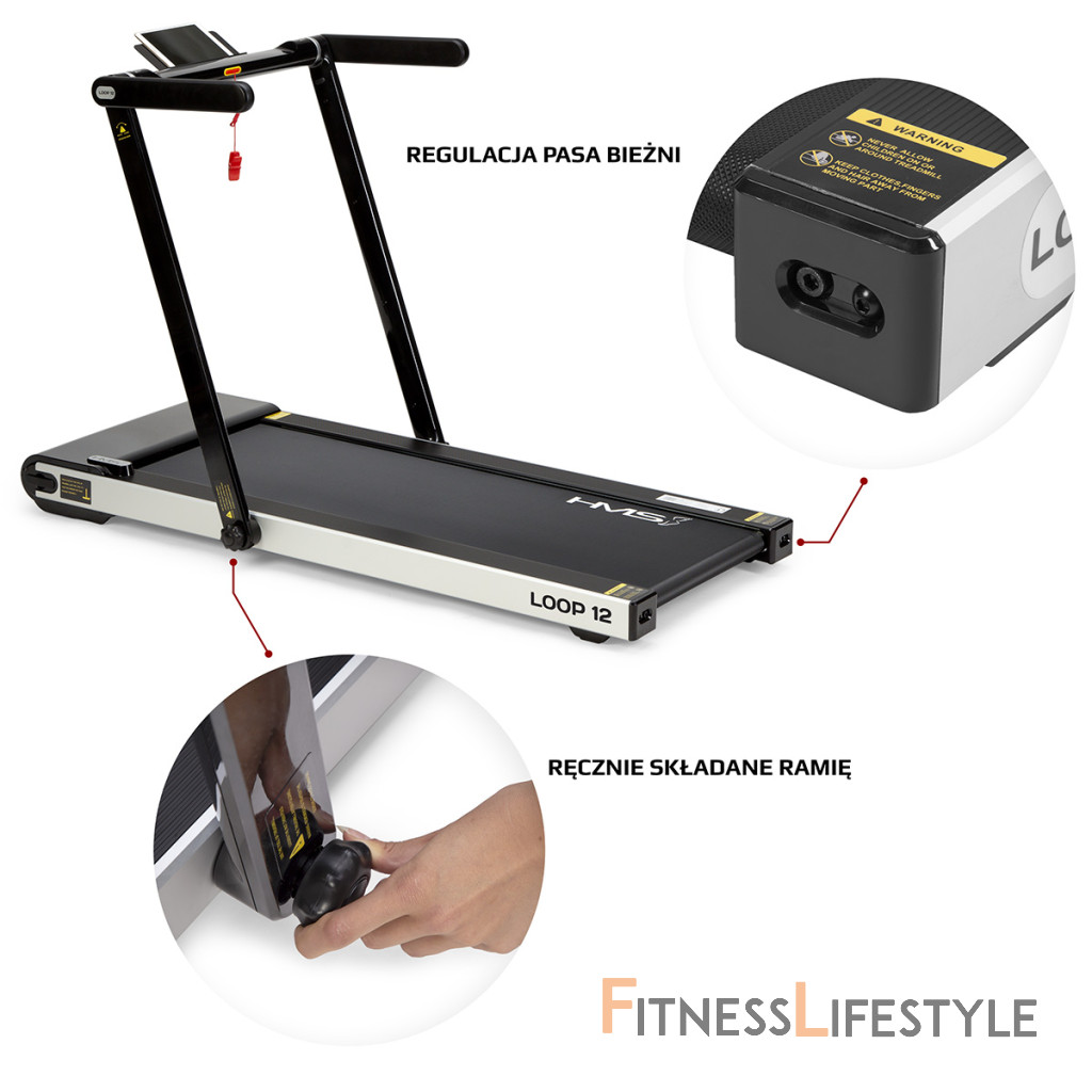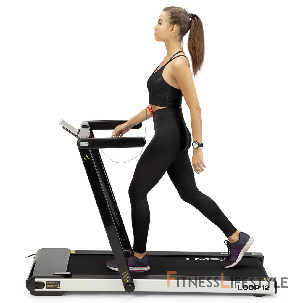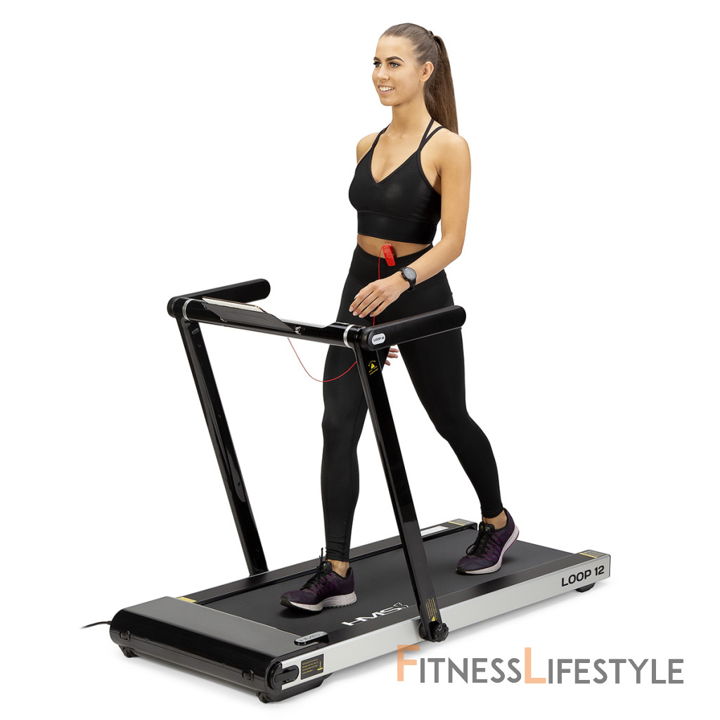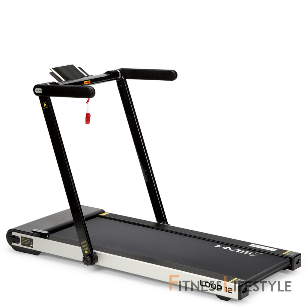 Elektrický bežecký trenažér HMS LOOP12 má moderný dizajn a po zložení zaberá veľmi málo miesta. Maximálna rýchlosť trenažéra je 12 km/h, motor má špičkový výkon 2,5 HP. Bežecká plocha s rozmermi 125 x 45 cm je na 6 miestach odpružená pomocou silikagelových silentblokov, ktoré znižujú zaťažovanie kĺbov pri behu. Konzola sa dá ľahko sklopiť k zadnej hrane trenažéra a po sklopení získame rozmer 158 x 77 x 14 cm a trenažér sa tak zmestí za skriňu, alebo pod posteľ. Presúvanie modelu LOOP12 navyše uľahčujú 2 páry koliesok. Prvý pár sa nachádza na spodnej hrane a po zdvihnutí zadnej časti pásu umožňujú pohyb vpred a vzad. Druhý pár koliesok sa nachádza na čele trenažéra a po jeho zdvihnutí do zvislej polohy umožňujú pohyb do strán. Ovládací panel zobrazuje všetky dôležité údaje počas tréningu (rýchlosť, čas, vzdialenosť, spálené kalórie a počet krokov). Po stranách displeja nájdeme tlačidlá na zastavenie a spustenie pásu, reguláciu rýchlosti a 2 tlačidlá na skokovú zmenu rýchlosti na 3 a 5 km/h. Počítač tiež disponuje rozhraním bluetooth na spojenie s tréningovou aplikáciou FitShow, pomocou ktorej môžeme sledovať vývoj našej kondície a zároveň nám umožňuje nastavenie tréningového programu, podľa ktorého trenažér automaticky mení rýchlosť bežeckej plochy. Konzola je vybavená reproduktormi na počúvanie hudby, alebo sledovanie filmov na mobilnom zariadení, ktoré si môžete odložiť do sklopného stojanu. Parametre: Upozornenie: