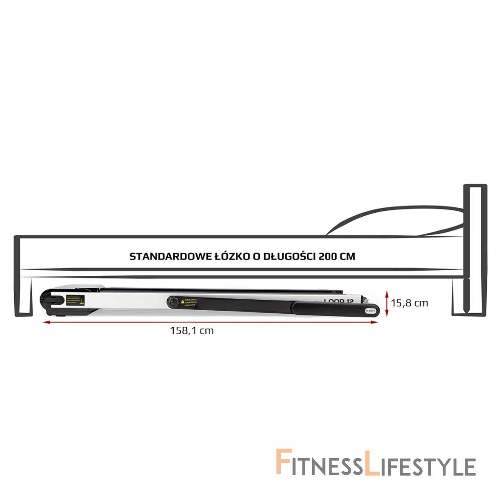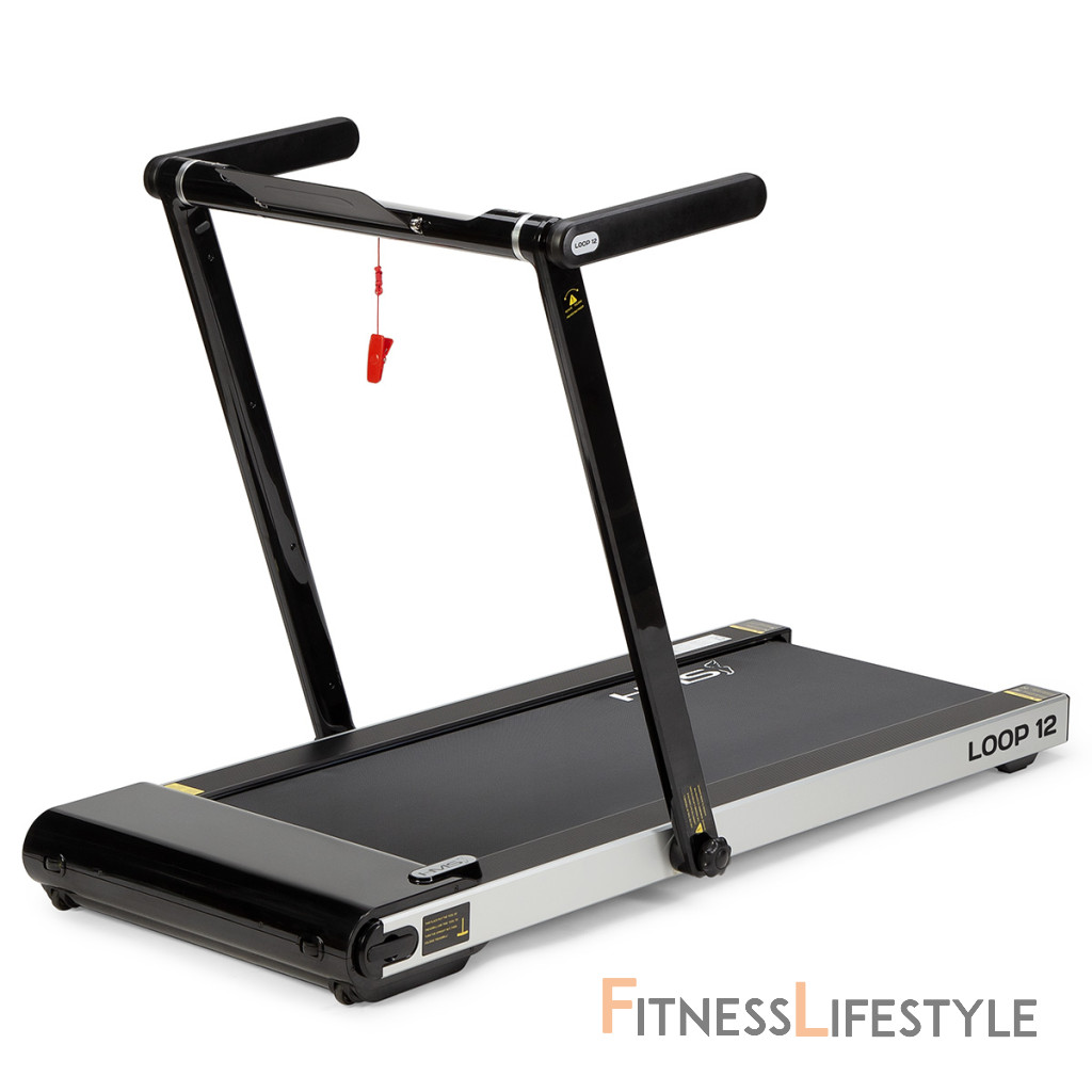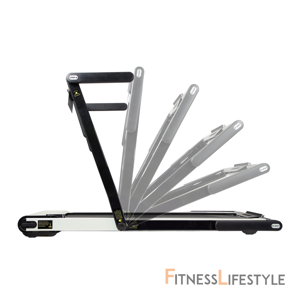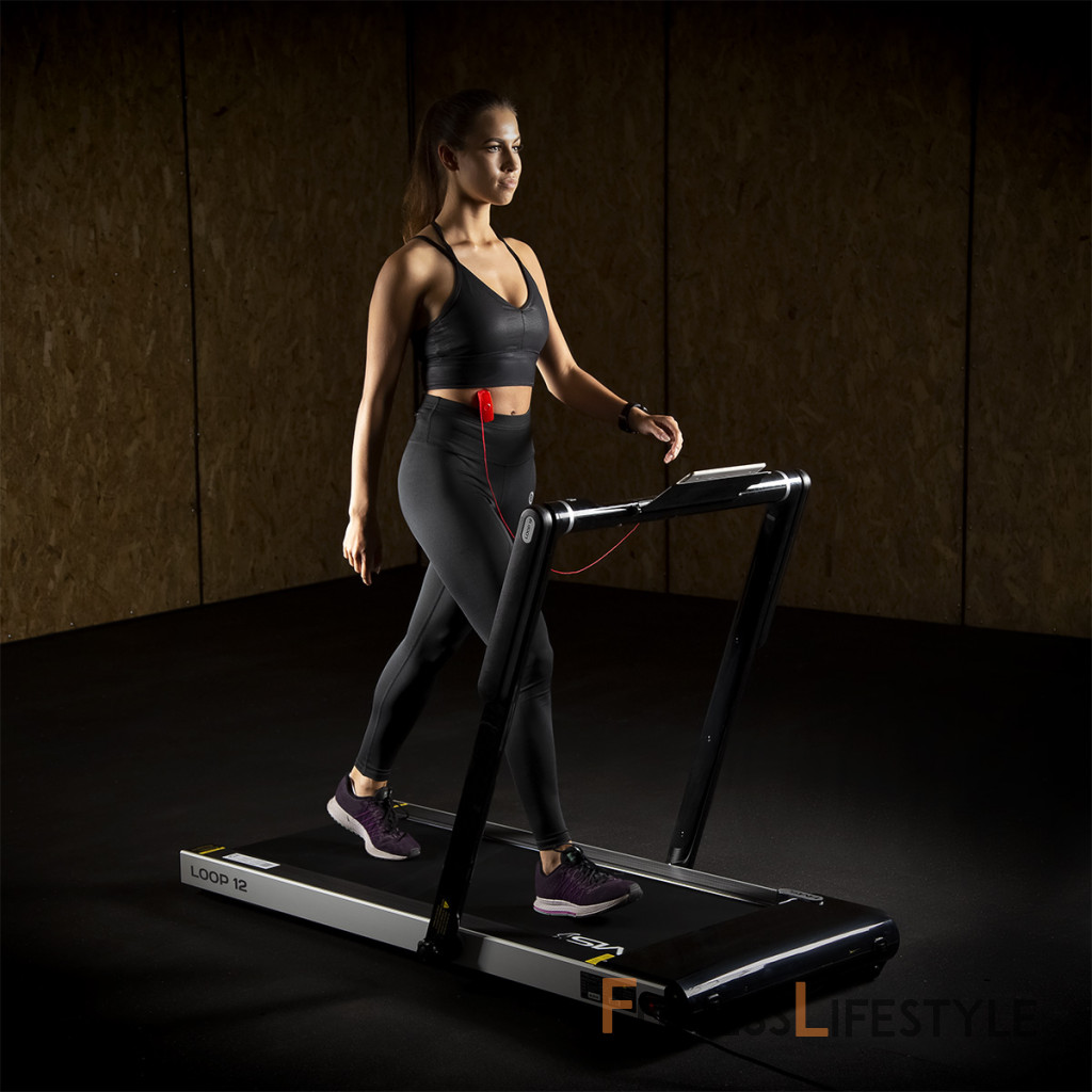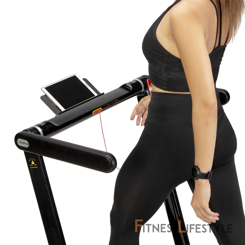 Elektrický bežecký trenažér HMS LOOP12 má moderný dizajn a po zložení zaberá veľmi málo miesta. Maximálna rýchlosť trenažéra je 12 km/h, motor má špičkový výkon 2,5 HP. Bežecká plocha s rozmermi 125 x 45 cm je na 6 miestach odpružená pomocou silikagelových silentblokov, ktoré znižujú zaťažovanie kĺbov pri behu. Konzola sa dá ľahko sklopiť k zadnej hrane trenažéra a po sklopení získame rozmer 158 x 77 x 14 cm a trenažér sa tak zmestí za skriňu, alebo pod posteľ. Presúvanie modelu LOOP12 navyše uľahčujú 2 páry koliesok. Prvý pár sa nachádza na spodnej hrane a po zdvihnutí zadnej časti pásu umožňujú pohyb vpred a vzad. Druhý pár koliesok sa nachádza na čele trenažéra a po jeho zdvihnutí do zvislej polohy umožňujú pohyb do strán. Ovládací panel zobrazuje všetky dôležité údaje počas tréningu (rýchlosť, čas, vzdialenosť, spálené kalórie a počet krokov). Po stranách displeja nájdeme tlačidlá na zastavenie a spustenie pásu, reguláciu rýchlosti a 2 tlačidlá na skokovú zmenu rýchlosti na 3 a 5 km/h. Počítač tiež disponuje rozhraním bluetooth na spojenie s tréningovou aplikáciou FitShow, pomocou ktorej môžeme sledovať vývoj našej kondície a zároveň nám umožňuje nastavenie tréningového programu, podľa ktorého trenažér automaticky mení rýchlosť bežeckej plochy. Konzola je vybavená reproduktormi na počúvanie hudby, alebo sledovanie filmov na mobilnom zariadení, ktoré si môžete odložiť do sklopného stojanu. Parametre: Upozornenie: