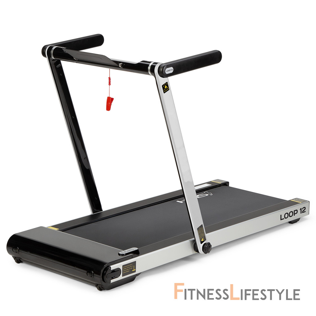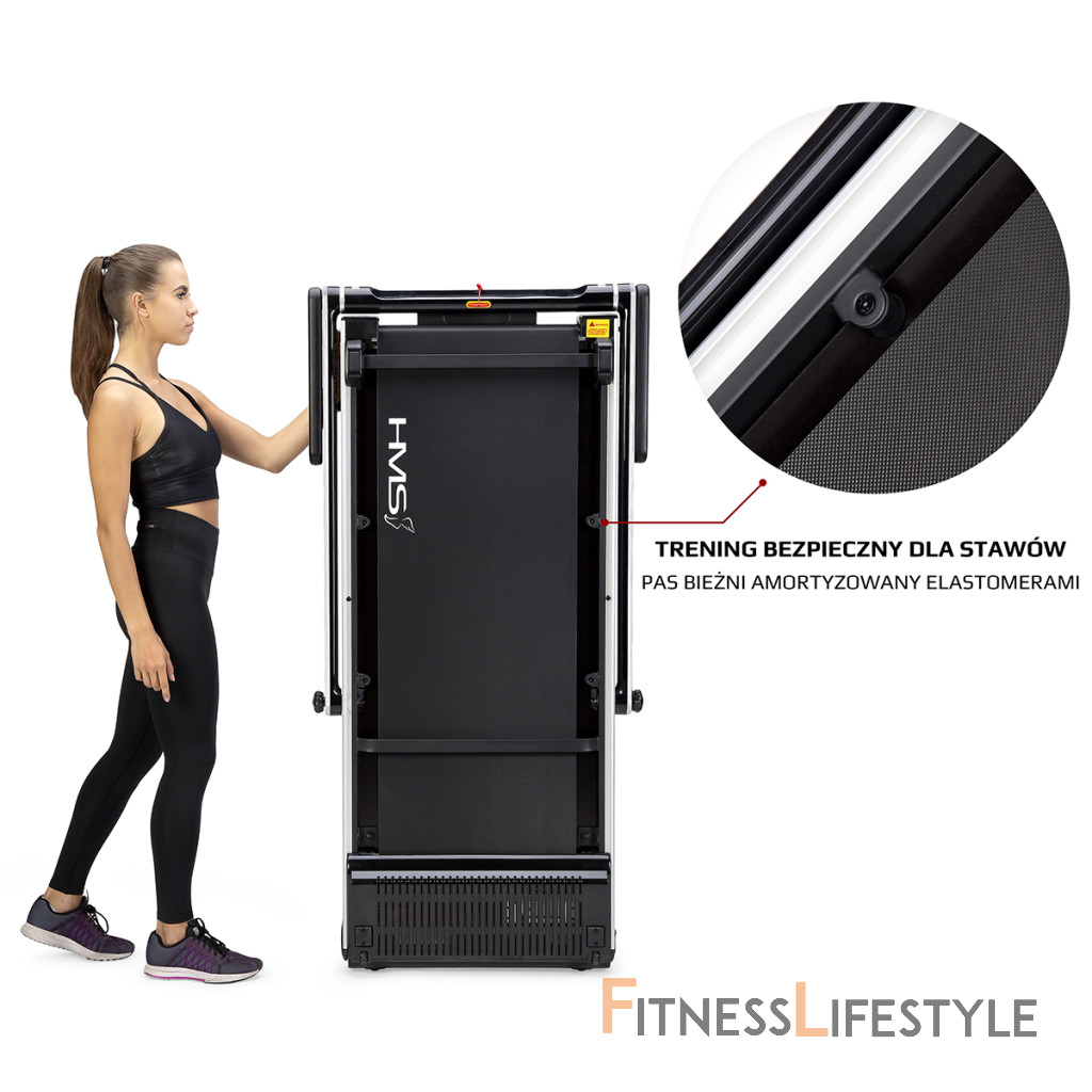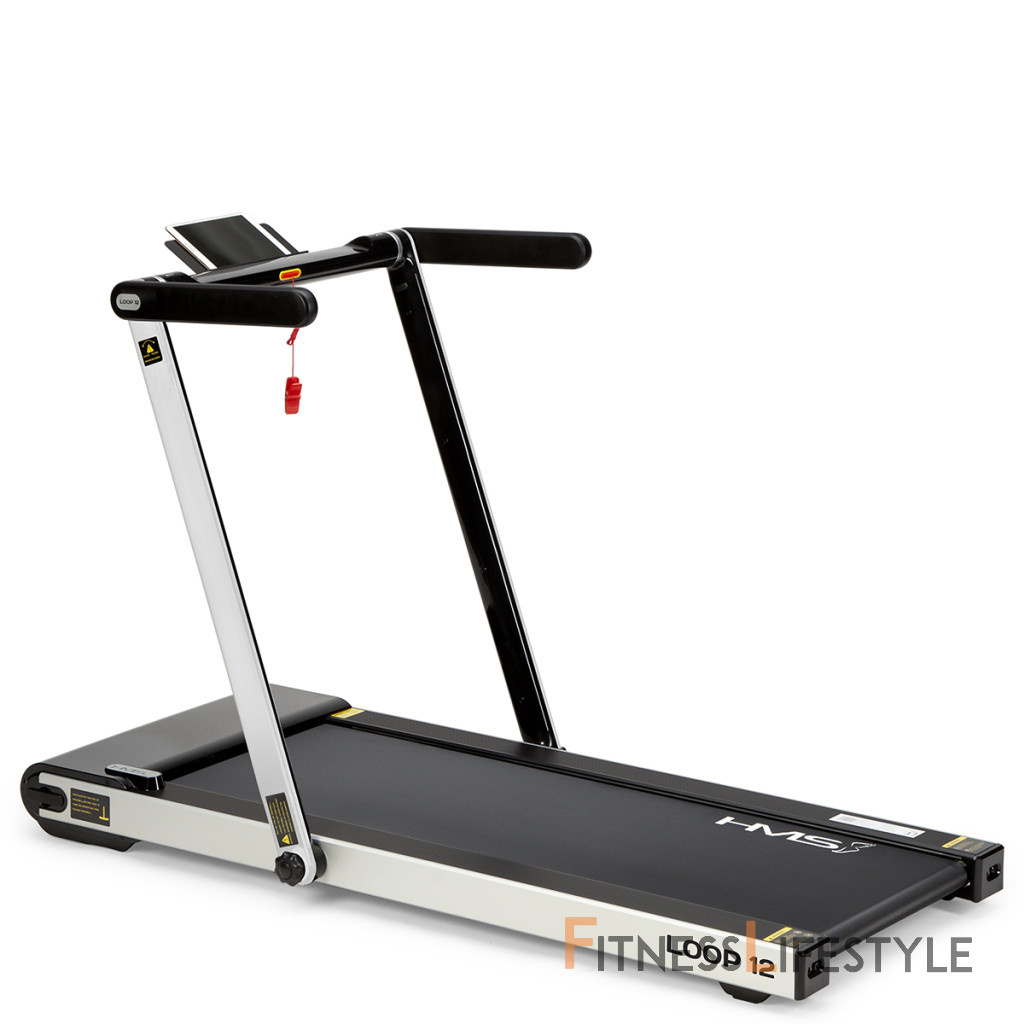 Elektrický bežecký trenažér HMS LOOP12 má moderný dizajn a po zložení zaberá veľmi málo miesta. Maximálna rýchlosť trenažéra je 12 km/h, motor má špičkový výkon 2,5 HP. Bežecká plocha s rozmermi 125 x 45 cm je na 6 miestach odpružená pomocou silikagelových silentblokov, ktoré znižujú zaťažovanie kĺbov pri behu. Konzola sa dá ľahko sklopiť k zadnej hrane trenažéra a po sklopení získame rozmer 158 x 77 x 14 cm a trenažér sa tak zmestí za skriňu, alebo pod posteľ. Presúvanie modelu LOOP12 navyše uľahčujú 2 páry koliesok. Prvý pár sa nachádza na spodnej hrane a po zdvihnutí zadnej časti pásu umožňujú pohyb vpred a vzad. Druhý pár koliesok sa nachádza na čele trenažéra a po jeho zdvihnutí do zvislej polohy umožňujú pohyb do strán. Ovládací panel zobrazuje všetky dôležité údaje počas tréningu (rýchlosť, čas, vzdialenosť, spálené kalórie a počet krokov). Po stranách displeja nájdeme tlačidlá na zastavenie a spustenie pásu, reguláciu rýchlosti a 2 tlačidlá na skokovú zmenu rýchlosti na 3 a 5 km/h. Počítač tiež disponuje rozhraním bluetooth na spojenie s tréningovou aplikáciou FitShow, pomocou ktorej môžeme sledovať vývoj našej kondície a zároveň nám umožňuje nastavenie tréningového programu, podľa ktorého trenažér automaticky mení rýchlosť bežeckej plochy. Konzola je vybavená reproduktormi na počúvanie hudby, alebo sledovanie filmov na mobilnom zariadení, ktoré si môžete odložiť do sklopného stojanu. Parametre: Upozornenie: