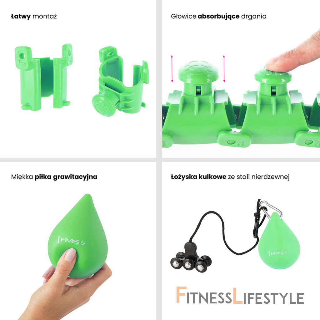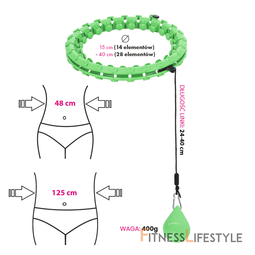 HMS HHW12 je hula hop obruč s nastaviteľnou dĺžkou, masážnymi výstupkami a rotujúcim závažím.