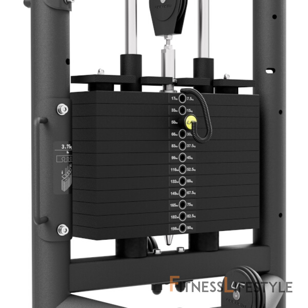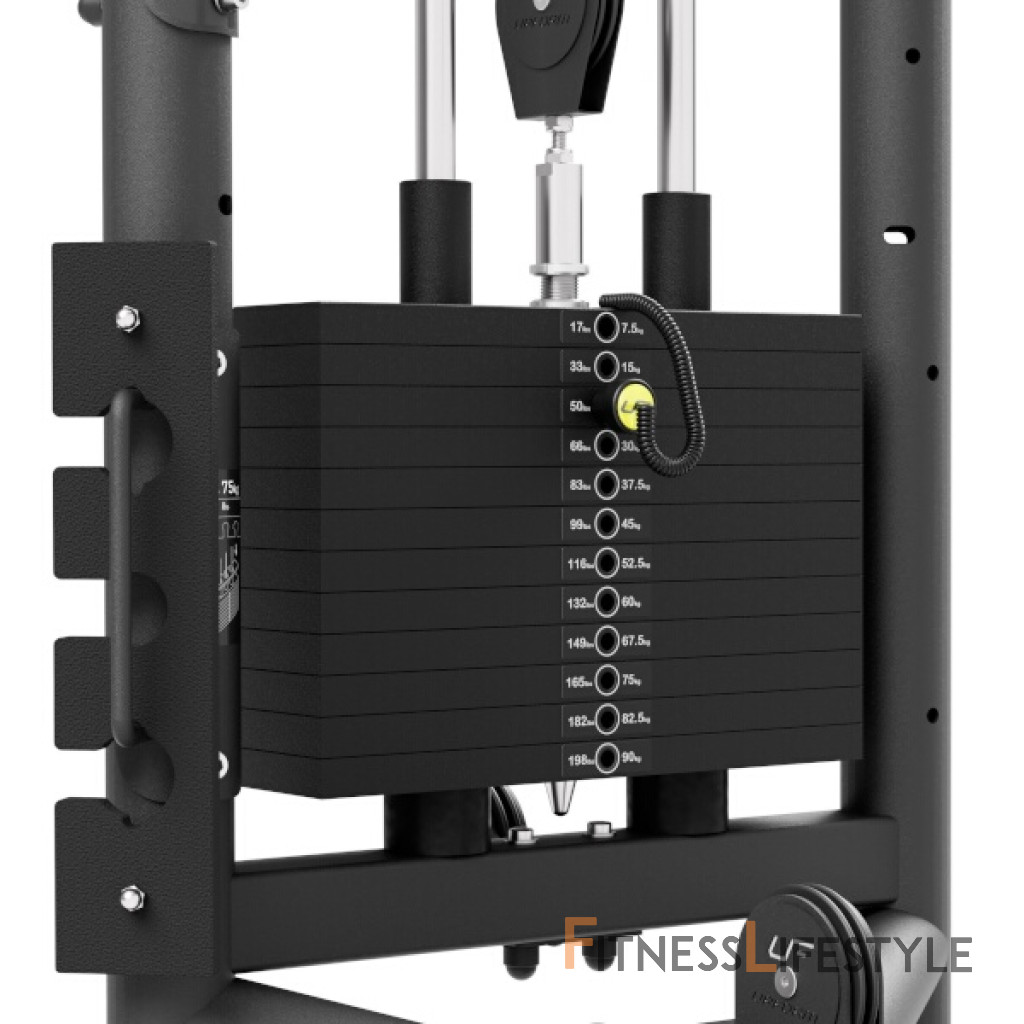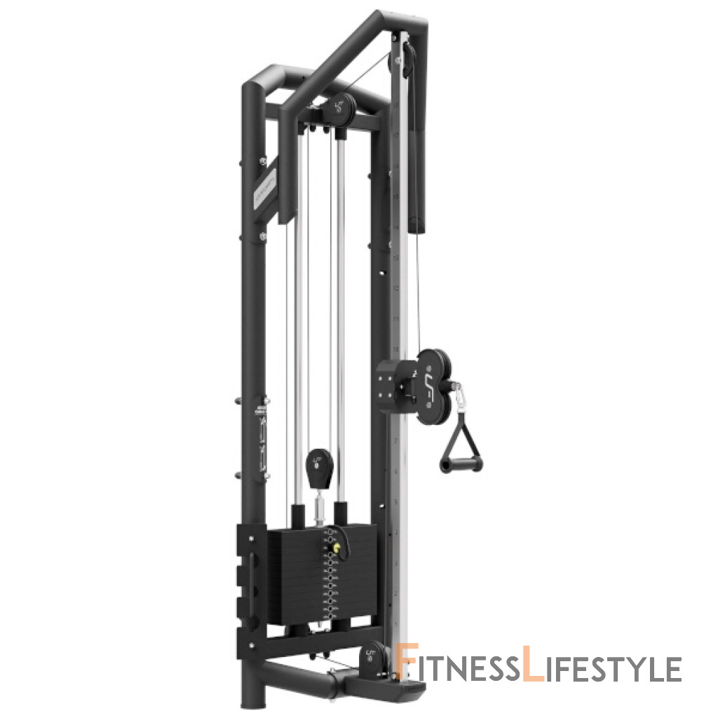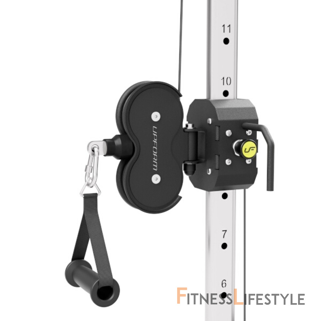 Posuvná kladka UpForm UF-001 je vybavená sadou závažia obsahujúcou 12 tehál s celkovou hmotnosťou 90 kilogramov odstupňovaných po 7,5 kg a jednou doplnkovou tehlou s hmotnosťou 3,75 kilogramov, tá sa umiestňuje nad prvú pevnú tehlu a používa sa na volenie ,75 kilogramov. Volič váhy je opatrený nálepkami pre rýchlu voľbu požadovanej záťaže a istiaci čap je pripevnený na lanku, takže nehrozí jeho strata. Horné rameno sa nachádza vo výške 220 centimetrov, na stroji tak môže pohodlne trénovať ktokoľvek do výšky 200 cm. Všetky kladky sú schované pod kovovými krytmi s logom UpForm. Oceľové lanko je pokryté čiernym PVC, je zakončené masívnym okom a je odpružené gumovým tlmičom. Posuvný mechanizmus je opatrený madlom pre ľahký presun a pružinovým, istiacim kolíkom. Pojazd je možné nastaviť do 18-tich polôh, ktoré sú číslované.