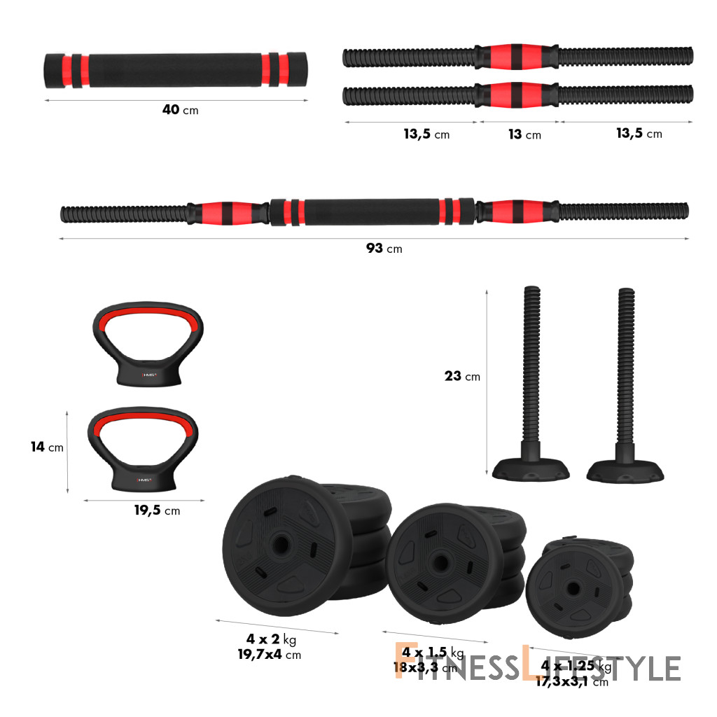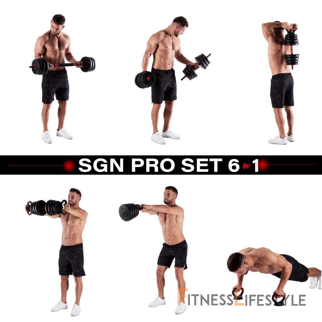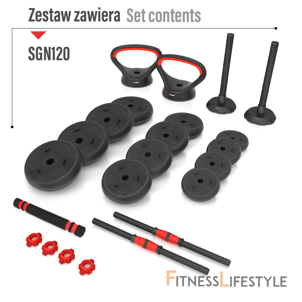 HMS SGN120 6v1 je variabilná a všestranná sada nakladacích činiek, ktorá umožňuje vykonávať širokú škálu silových cvičení s jednou sadou. Sada SGN120 6v1 sa skladá z 12-tich kotúčov, dvoch krátkych osí, jedného spojovacieho dielu, dvoch úchopov a dvoch nakladacích tŕňov pre kettlebell a uzáverov. Kombinovaním jednotlivých dielov môžete vytvoriť vždy jednu z nasledujúcich 6-tich zostáv.