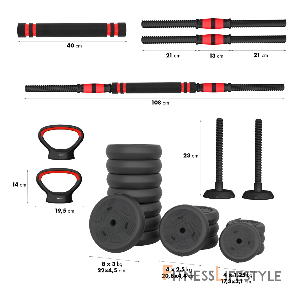 HMS SGN140 6v1 je variabilná a všestranná sada nakladacích činiek, ktorá umožňuje vykonávať širokú škálu silových cvičení s jednou sadou. Sada SGN140 6v1 sa skladá zo 16-tich kotúčov, dvoch krátkych osí, jedného spojovacieho dielu, dvoch úchopov a dvoch nakladacích tŕňov pre kettlebell a uzáverov. Kombinovaním jednotlivých dielov môžete vytvoriť vždy jednu z nasledujúcich 6-tich zostáv.