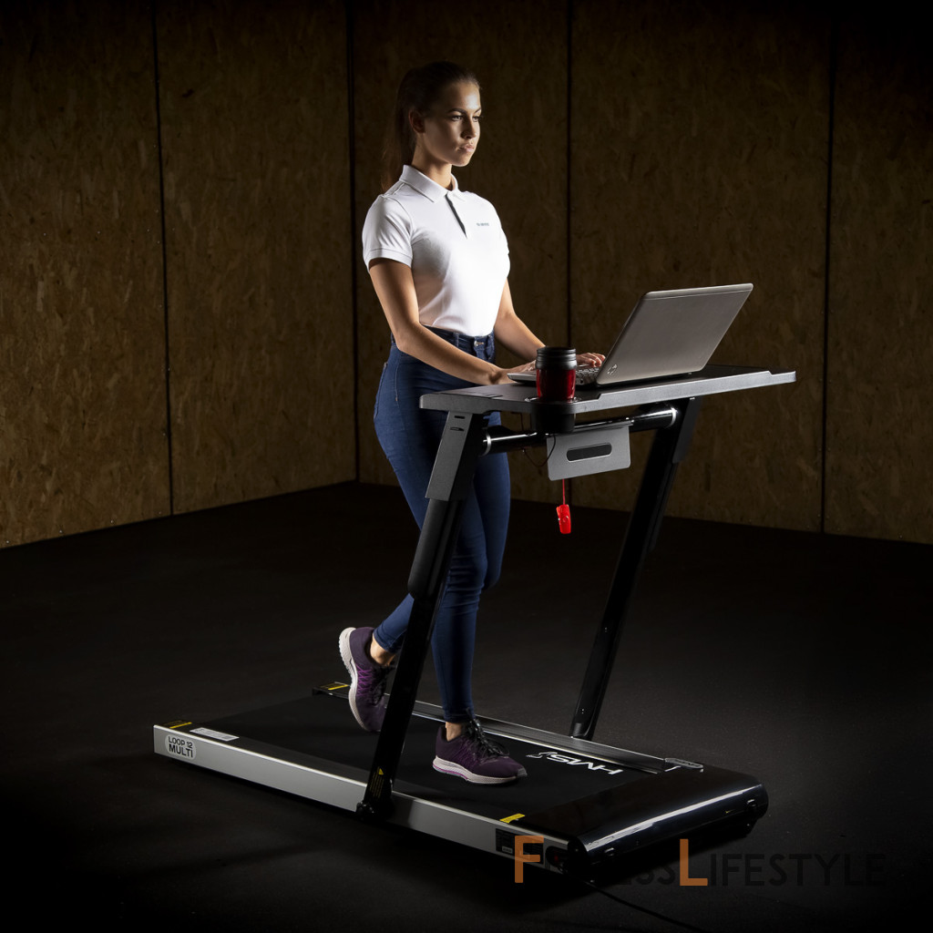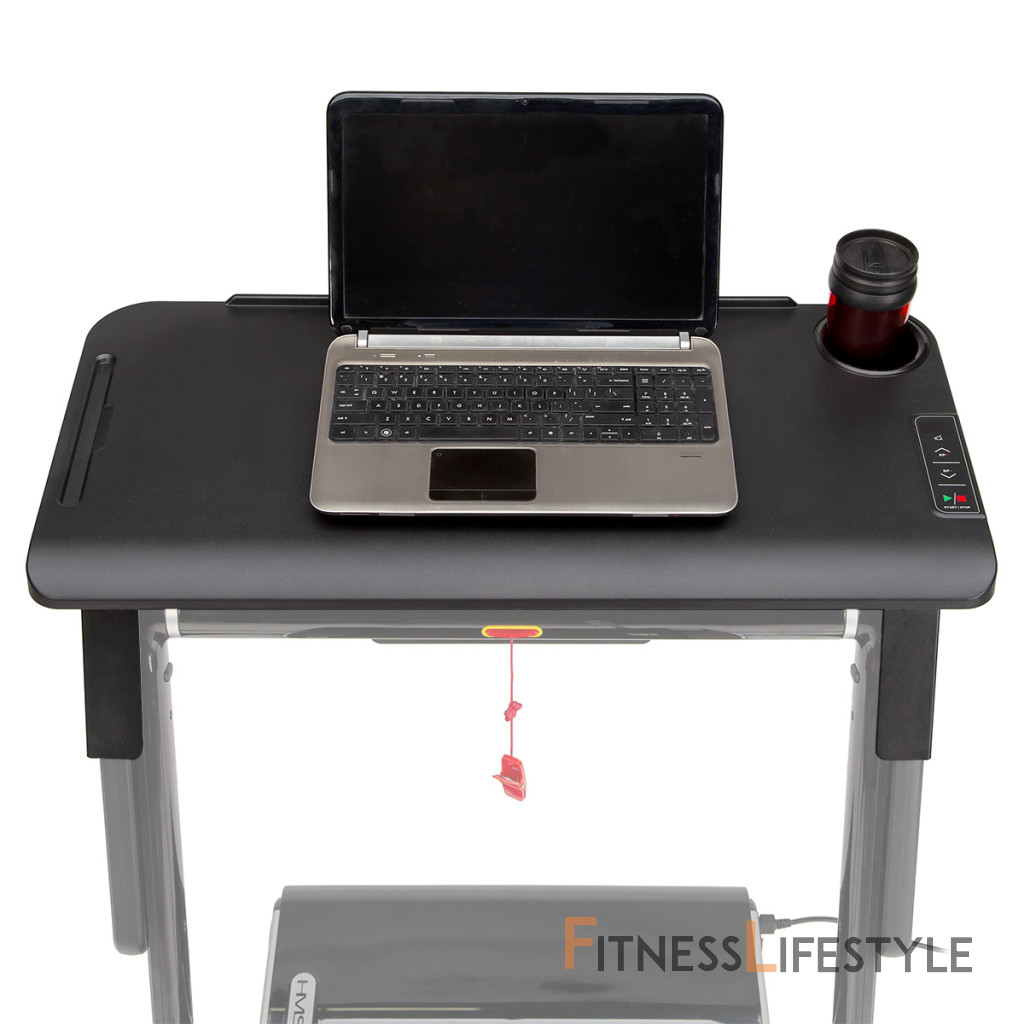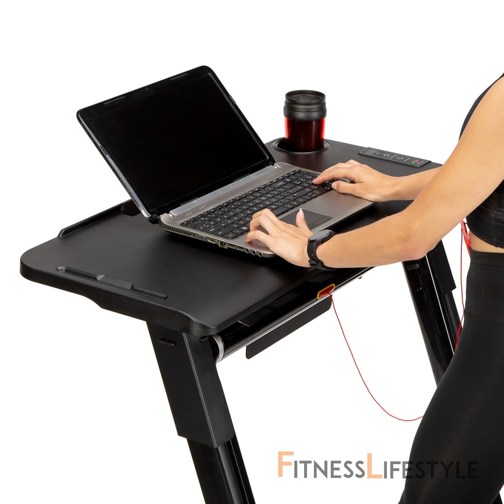 Vďaka stolu bude teraz možné kombinovať prácu a fyzickú aktivitu. Pripojenie stola obmedzuje rýchlosť bežeckého pásu na 6 km/h, takže obsluha notebooku pri chôdzi nebude problém. Na stole je umiestnený držiak na fľašu alebo kelímok a nechýba ani držiak na tablet. Vďaka špeciálnemu ovládaciemu panelu môžeme bežecký pás kedykoľvek spomaliť alebo vypnúť. Stôl sa ľahko zostavuje a pripojenie k bežeckému pásu sa vykonáva pomocou jediného kábla. Takéto riešenie je skvelou alternatívou k práci za stolom.