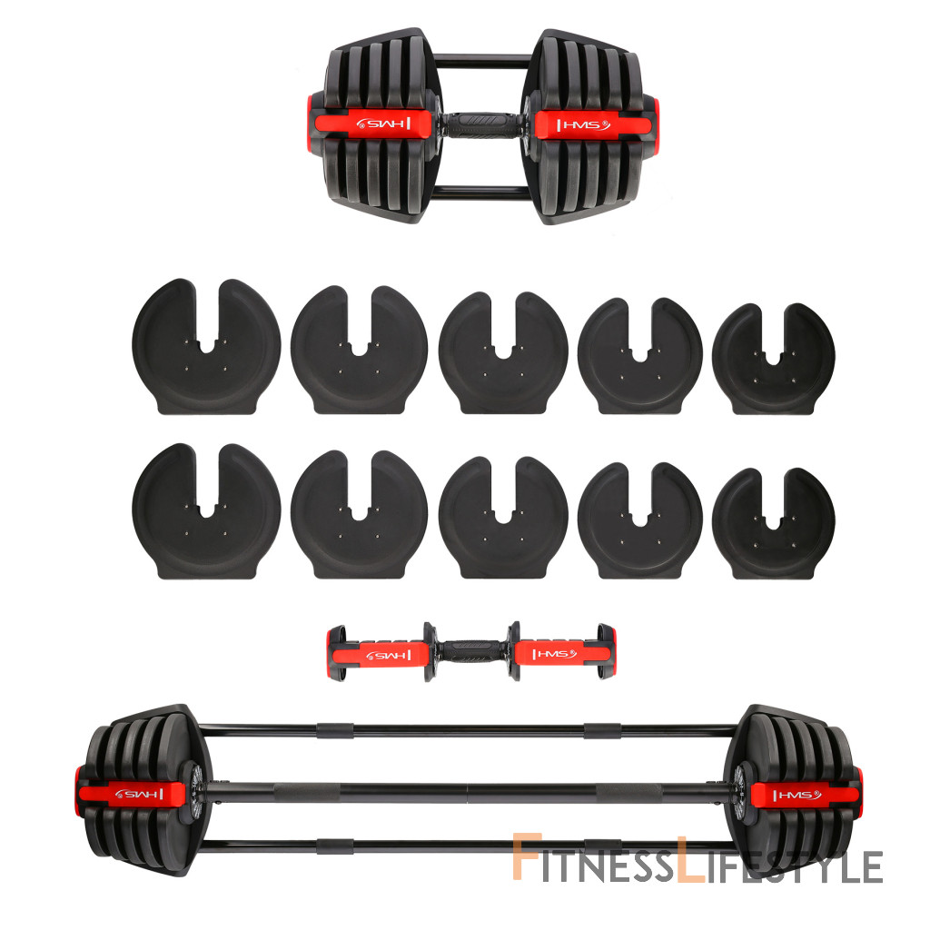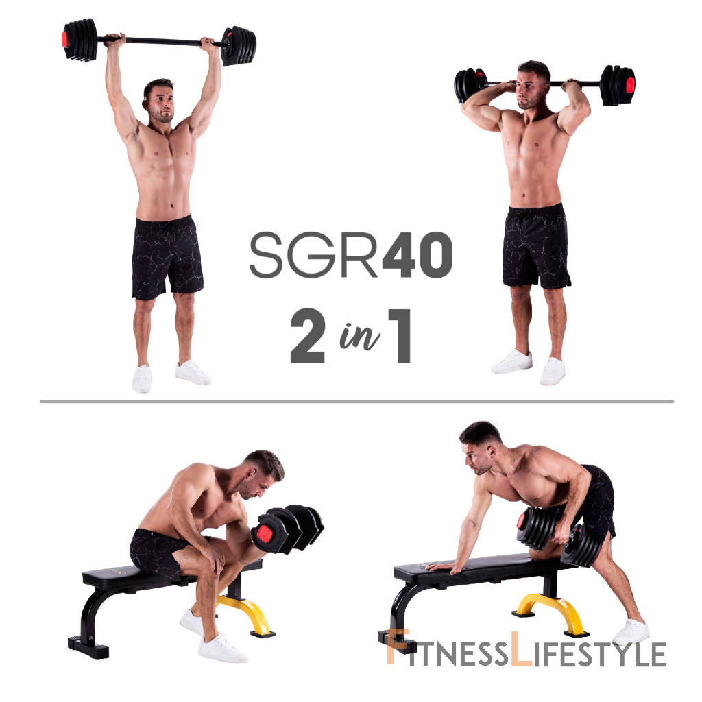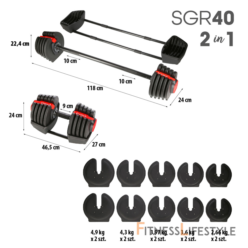 HMS SGR40 PRO SET 2v1 je sada variabilná - nastaviteľné činky s možnosťou zostavenia ako jednoručná, alebo obojručná činka.