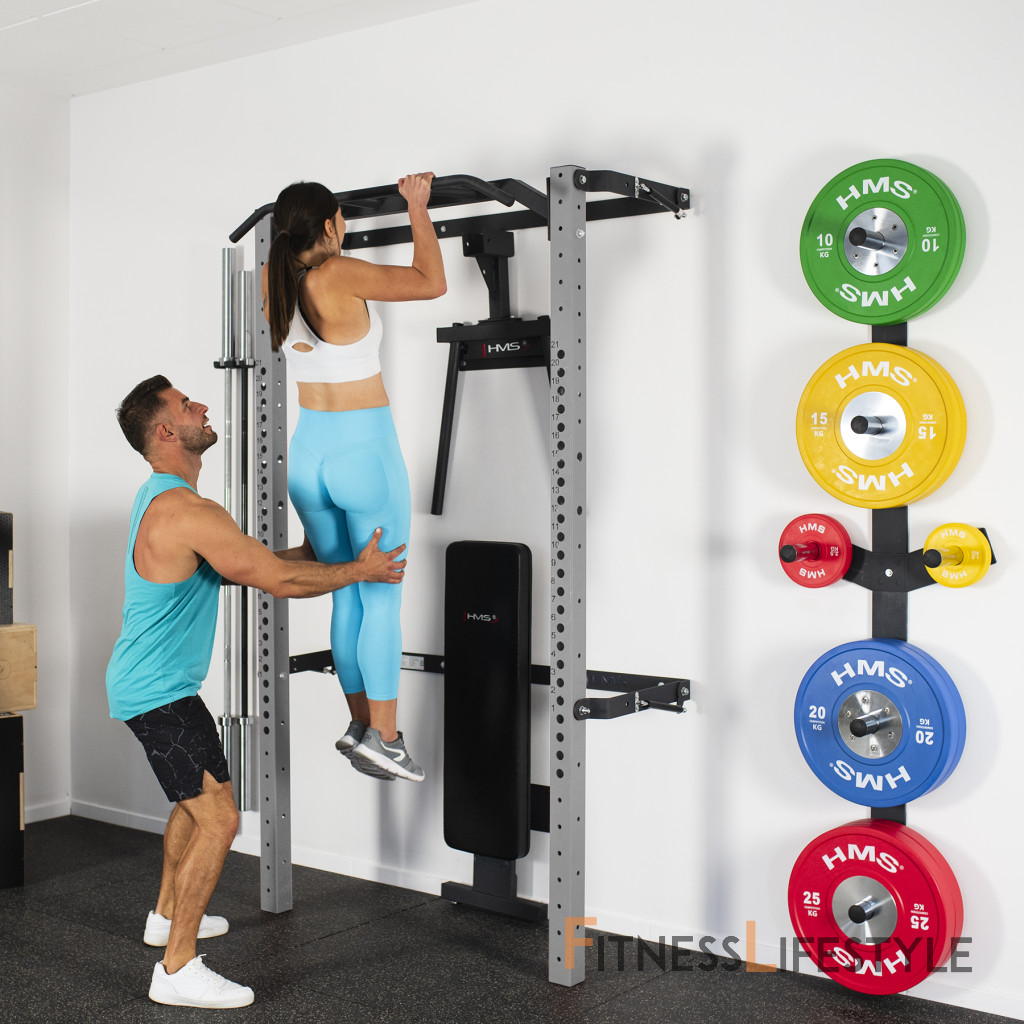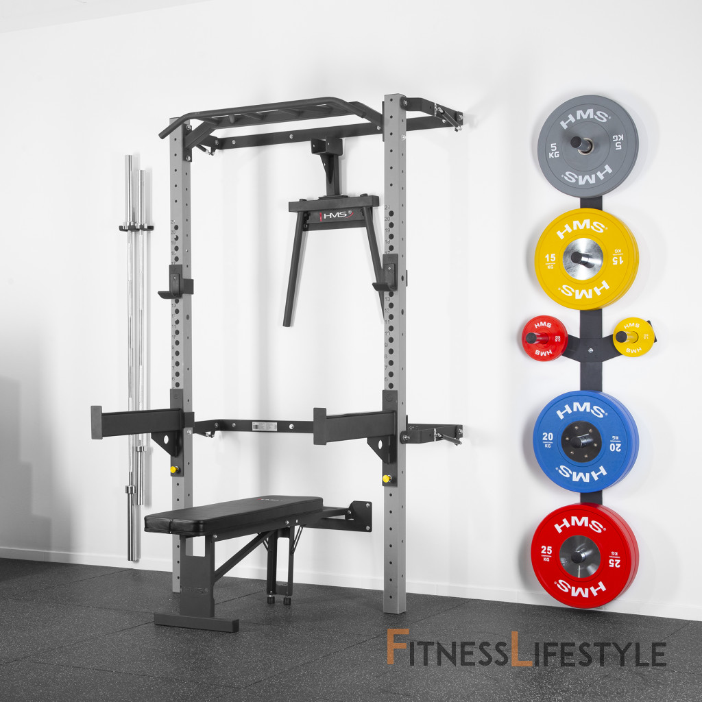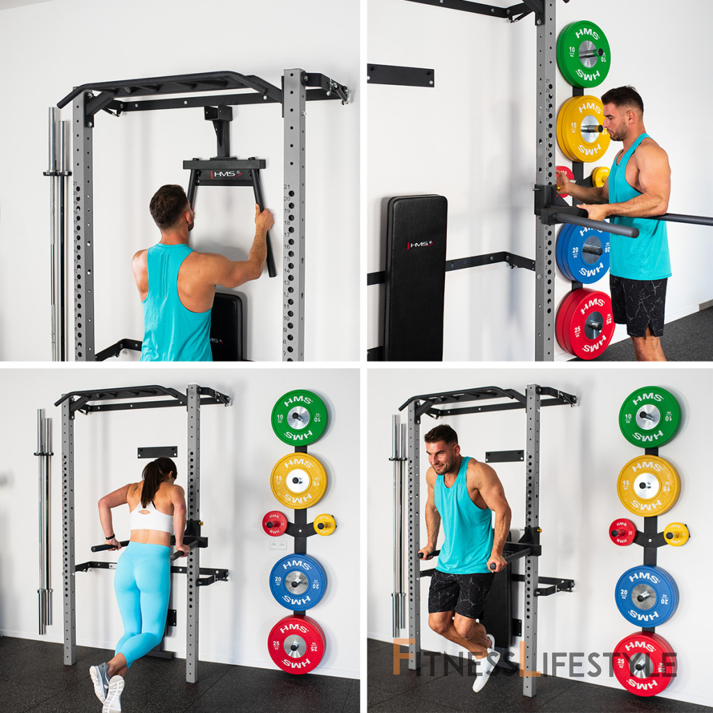 Skladací posilňovací stojan - Power Rack KLT22 od spoločnosti HMS bol navrhnutý tak, aby zodpovedal súčasným trendom na trhu a spĺňal očakávania najnáročnejších zákazníkov. Rack v tejto variante sa predáva s ďalším vybavením. Okrem hrazdy, hákov na činky a bezpečnostných podpier tu nájdete skladaciu rovnú lavicu, adaptér na dipy, nástenný stojan na činky a držiak na osi. Takáto sada rozšíri vaše tréningové možnosti a poskytne vám nové úložné priestory pre vaše vybavenie.