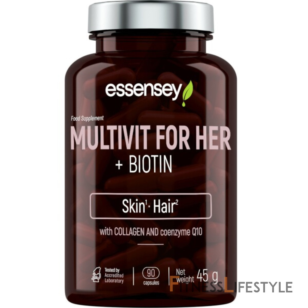 ESSENSEY MULTIVITAMÍN PRE ŽENY + BIOTÍN. Výživový doplnok. Prípravok v kapsuliach s obsahom vitamínov pre ženy, obohatený o kolagén, extrakt zo zeleného čaju, CLA, L-karnitín, kyselinu hyalurónovú a koenzým Q10. Tiamín, vitamín B6, vitamín B12, biotín a vitamín C prispievajú k normálnemu energetickému metabolizmu. Riboflavín, biotín a vitamín A prispievajú k udržaniu zdravej pokožky. Biotín prispieva k udržaniu zdravých vlasov.