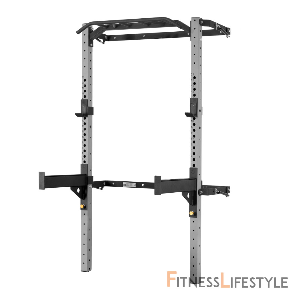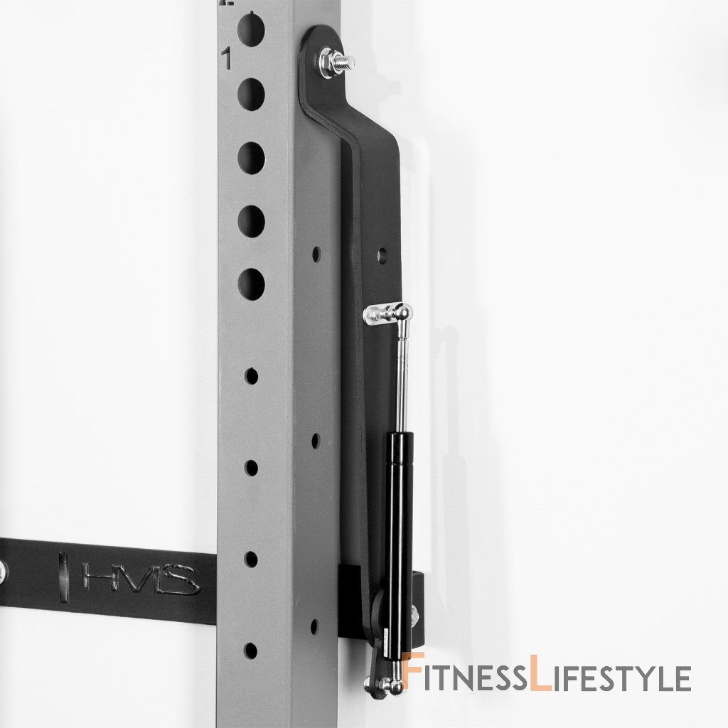 Power Rack KLT23 je pripevnený k stene, čo zaisťuje jeho stabilitu a bezpečnosť. Keď ho nepoužívate, môžete ho ľahko zložiť, takže nezaberie veľa miesta. To je obrovská výhoda tohto zariadenia, pretože ho môžu používať ľudia s obmedzeným tréningovým priestorom. Keď je stojan zložený k stene, v najhlbšom bode, zaberá od steny iba 10 cm! Jedno z ramien je vybavené pneumatickým piestom, ktorý uľahčuje skladanie (zdvíhanie) stojana.