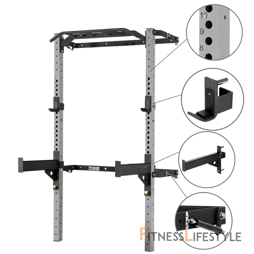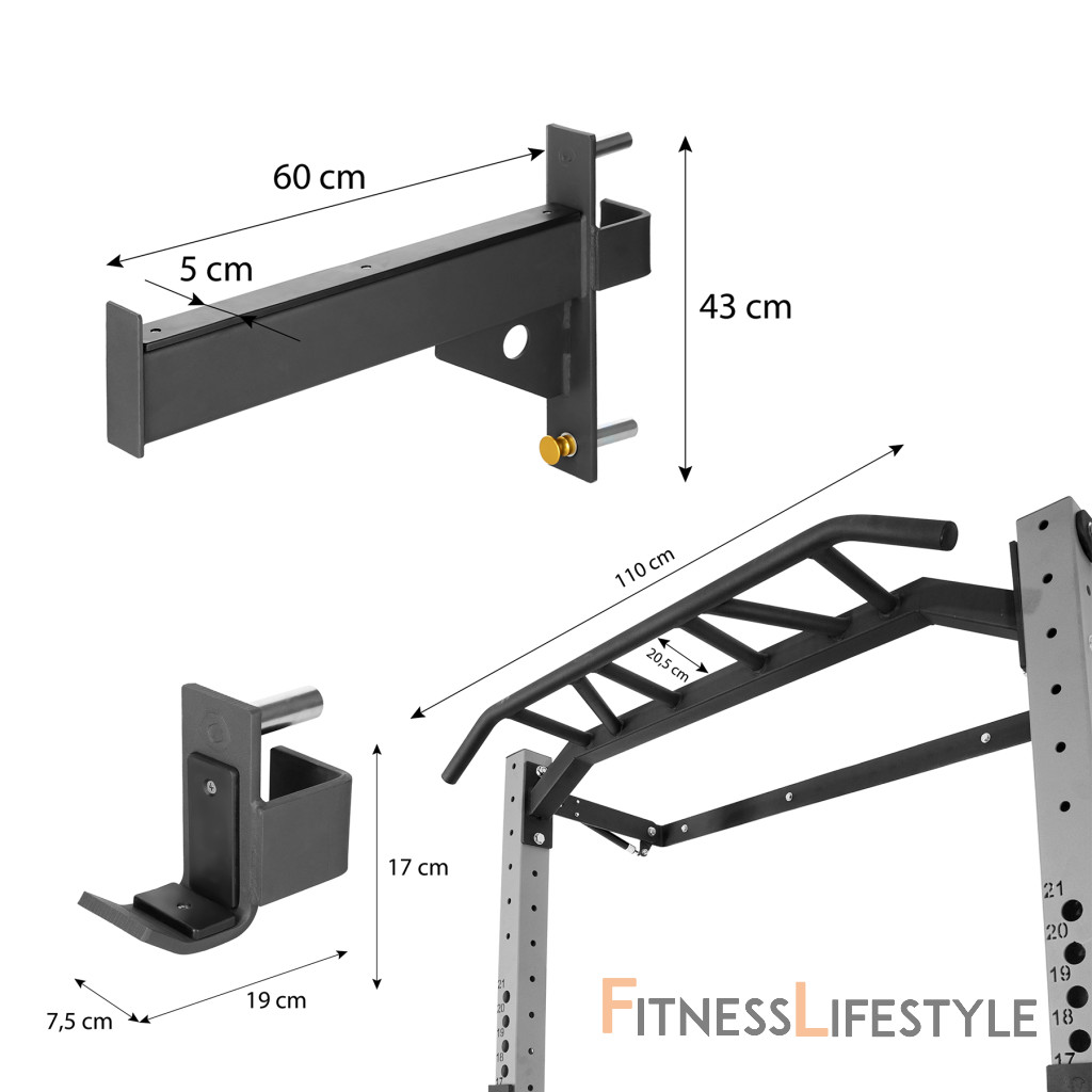 Rack má multifunkčnú hrazdu na príťahy, ktorá vám vďaka rôznym možnostiam úchopu umožní rozvíjať chrbtové, ramenné a prsné svaly. Zhyby sú jedným z najlepších cvikov pre hornú časť tela, pretože zapájajú viac svalových skupín a zlepšujú pohyblivosť kĺbov. Ak si chcete toto cvičenie zjednodušiť, stačí použiť špeciálne odporové gumy. Na KLT23 nájdete aj dva háky na os, ktoré môžete upevniť v ľubovoľnej výške.