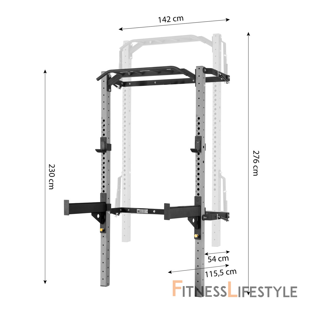 Súčasťou Power Racku KLT23 sú tiež špeciálne podpery, ktoré môžete pripevniť k rámu stojana, aby ste zaistili maximálnu bezpečnosť pri tréningu s ťažkými váhami. Podpery je možné pripevniť takmer v ľubovoľnej výške a je možné ich použiť pri vykonávaní cvikov, ako sú bench press alebo drepy s činkou bez toho, aby ste sa museli obávať toho, že už nemáte dostatok síl na vytlačenie činky späť do hákov. So stojanom KLT23 môžete posúvať hranice svojej vlastnej sily.