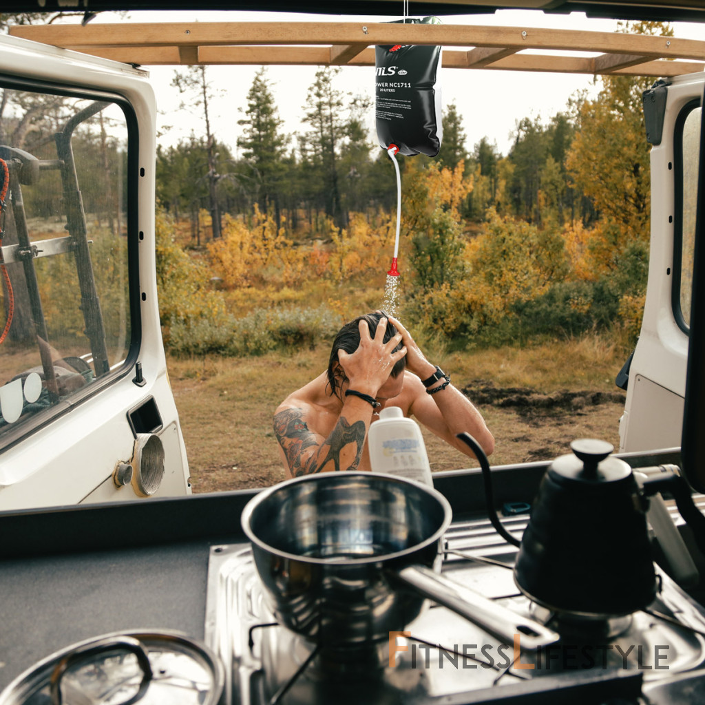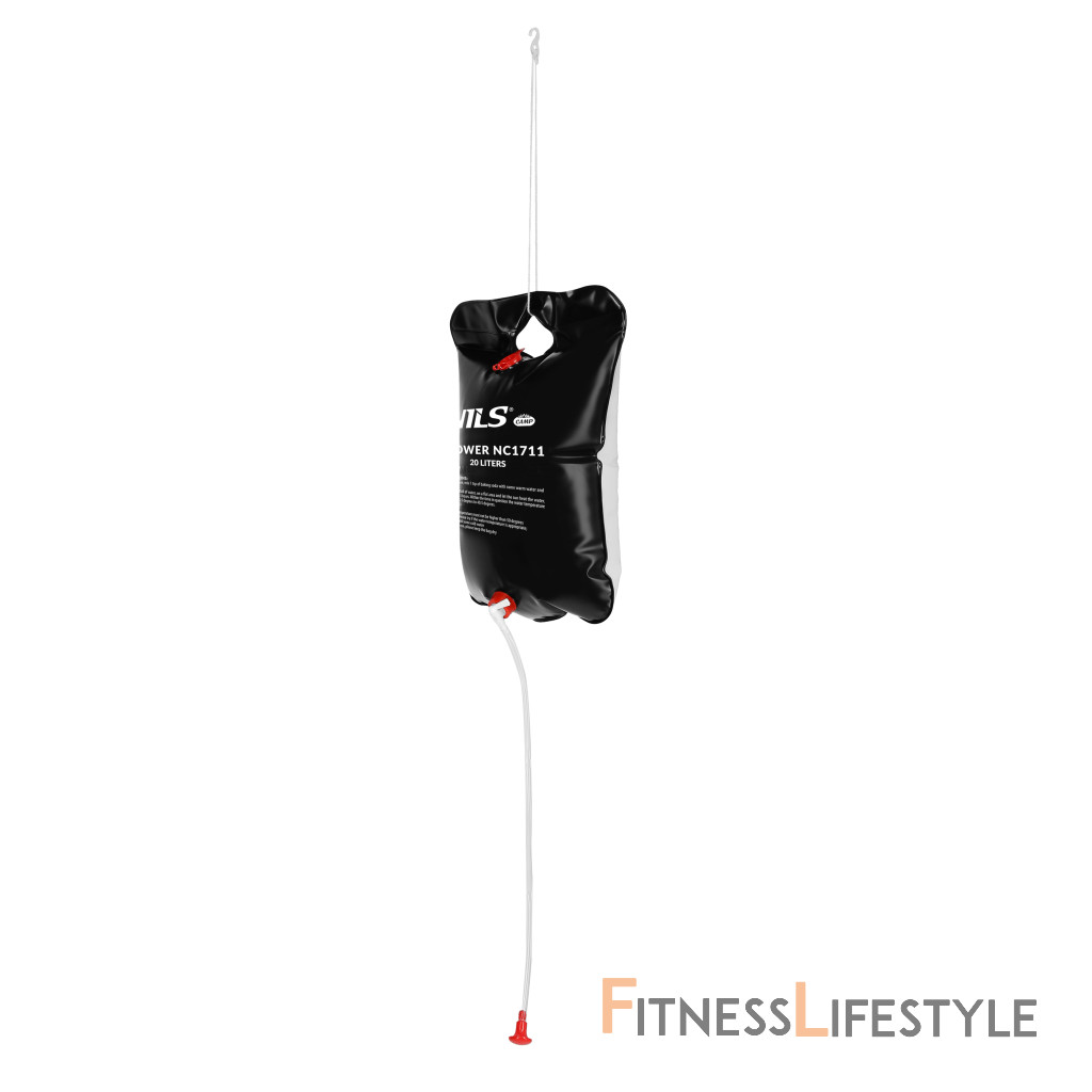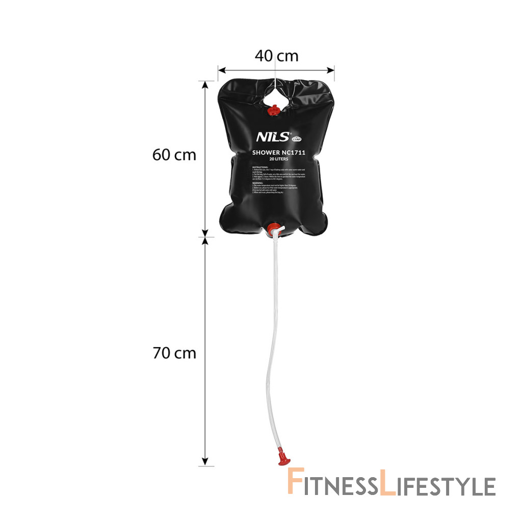 Prenosná turistická sprcha NC1711 od NILS Camp s objemom 20 litrov, ktorá je skvelým riešením pre každého, kto trávi čas kempovaním, cestovaním alebo kdekoľvek, kde nie je prístup do kúpeľne s teplou vodou.