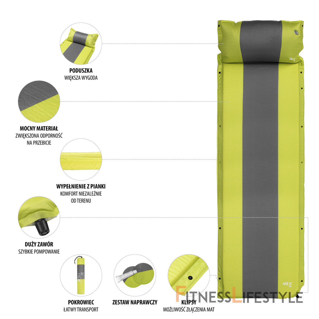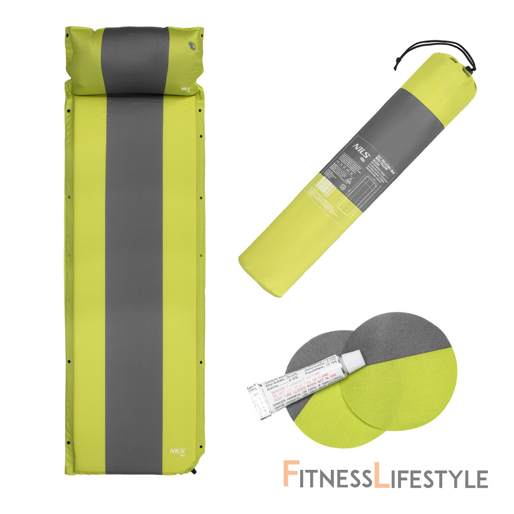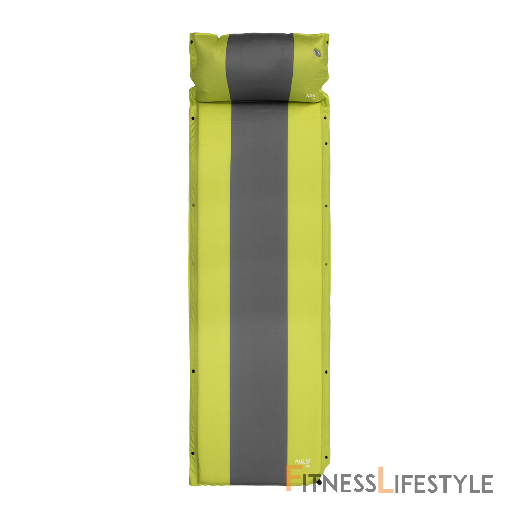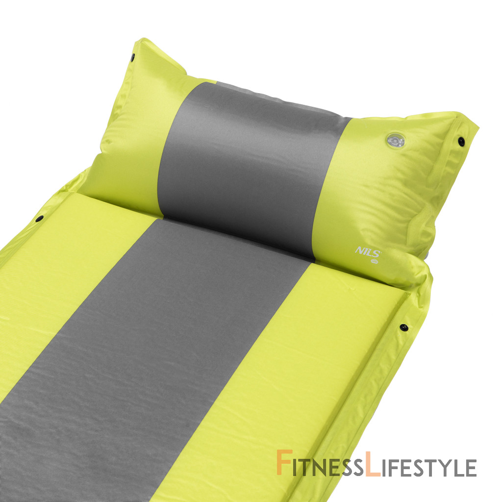 Samonafukovacia karimatka NILS Camp NC4349 zaistí kvalitný spánok počas kempovania a dovoleniek pod stanom. Podložka je ale vhodná aj k vode a všade tam, kde si chcete príjemne poležať. Samonafúknutie zaisťuje vnútorný, penový materiál s otvorenými pórmi. Po povolení ventilu do seba nasáva vzduch a dostáva sa tak do pôvodného stavu. Záverom je ešte potrebné podložku dofúknuť na požadovanú tvrdosť. Skladanie sa vykonáva otvorením ventilu a zrolovaním od opačnej strany, než je ventil. Karimatku potom zaistíme remienkami s prackami a vložíme do dodávaného vaku. Na model NC4349 bol použitý veľmi odolný polyester 75D potiahnutý vrstvou PVC, táto kombinácia zaisťuje vysokú odolnosť a karimatka sa dá položiť aj na nerovný povrch. Lemy karimatky sú opatrené cvočkami, ktoré umožňujú spojiť viac matracov do jednej, veľkej plochy, toto sa hodí napríklad na vyplnenie podlahy v stane. Vankúšik nie je odnímateľný a oproti karimatke nie je vyplnený penou a je potrebné ho celý nafúknuť. Súčasťou balenia je aj opravná sada, ktorá sa hodí v prípade poškodenia. Parametre: Upozornenie: