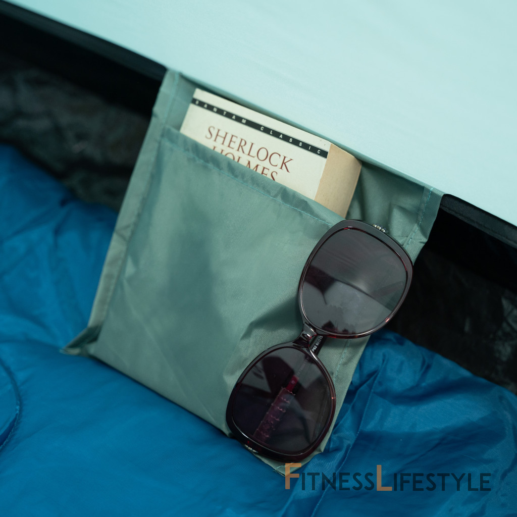 Vstup do spálne je vybavený tkaninou a siete proti komárom na cirkuláciu vzduchu. V strede „stropu“ je háčik, na ktorom môžete zavesiť napríklad baterku a vetracie otvory s sieťou komárom. Na boku je vrecko na odloženie telefónu, peňaženky atď.