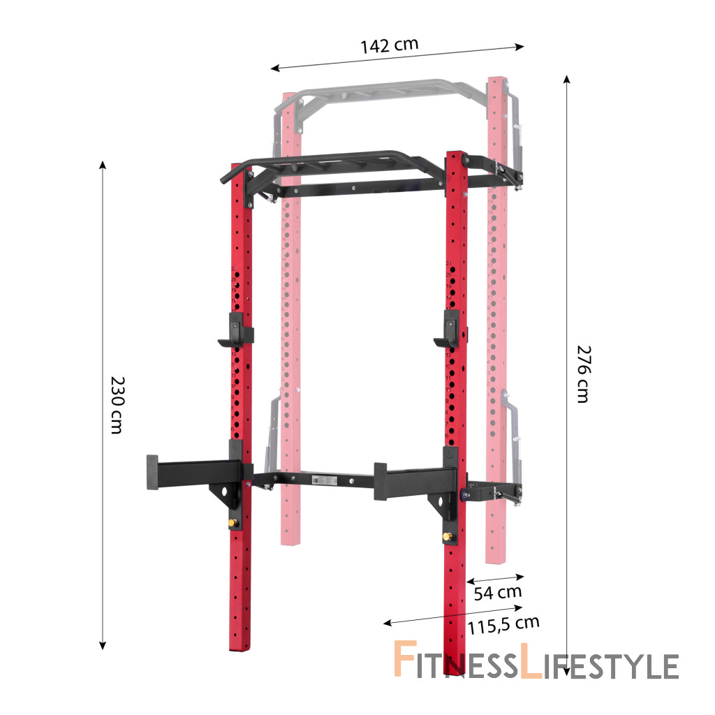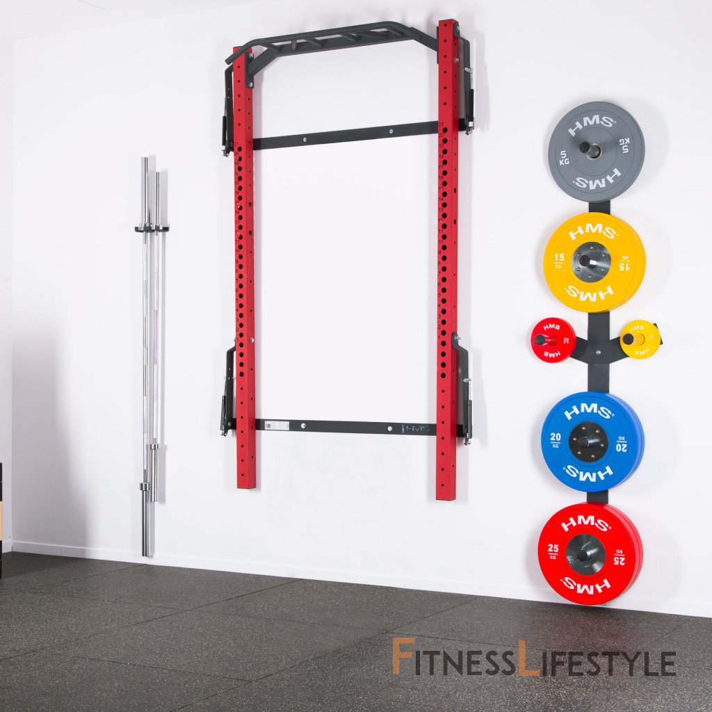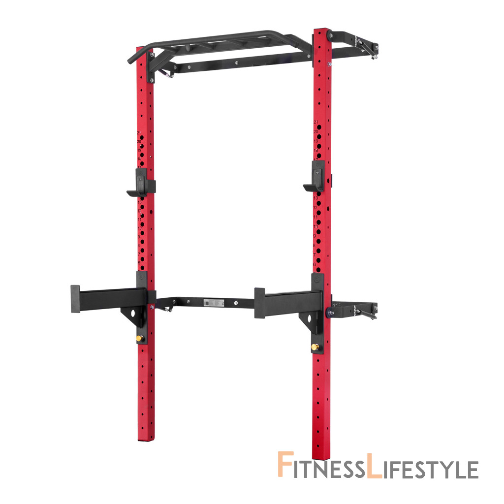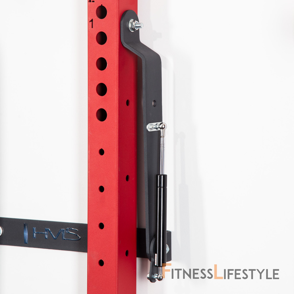 Power Rack KLT23 je pripevnený k stene, čo zaisťuje jeho stabilitu a bezpečnosť. Keď ho nepoužívate, môžete ho ľahko zložiť, takže nezaberie veľa miesta. To je obrovská výhoda tohto zariadenia, pretože ho môžu používať ľudia s obmedzeným tréningovým priestorom. Keď je stojan zložený k stene, v najhlbšom bode, zaberá od steny iba 10 cm! Jedno z ramien je vybavené pneumatickým piestom, ktorý uľahčuje skladanie (zdvíhanie) stojana.
