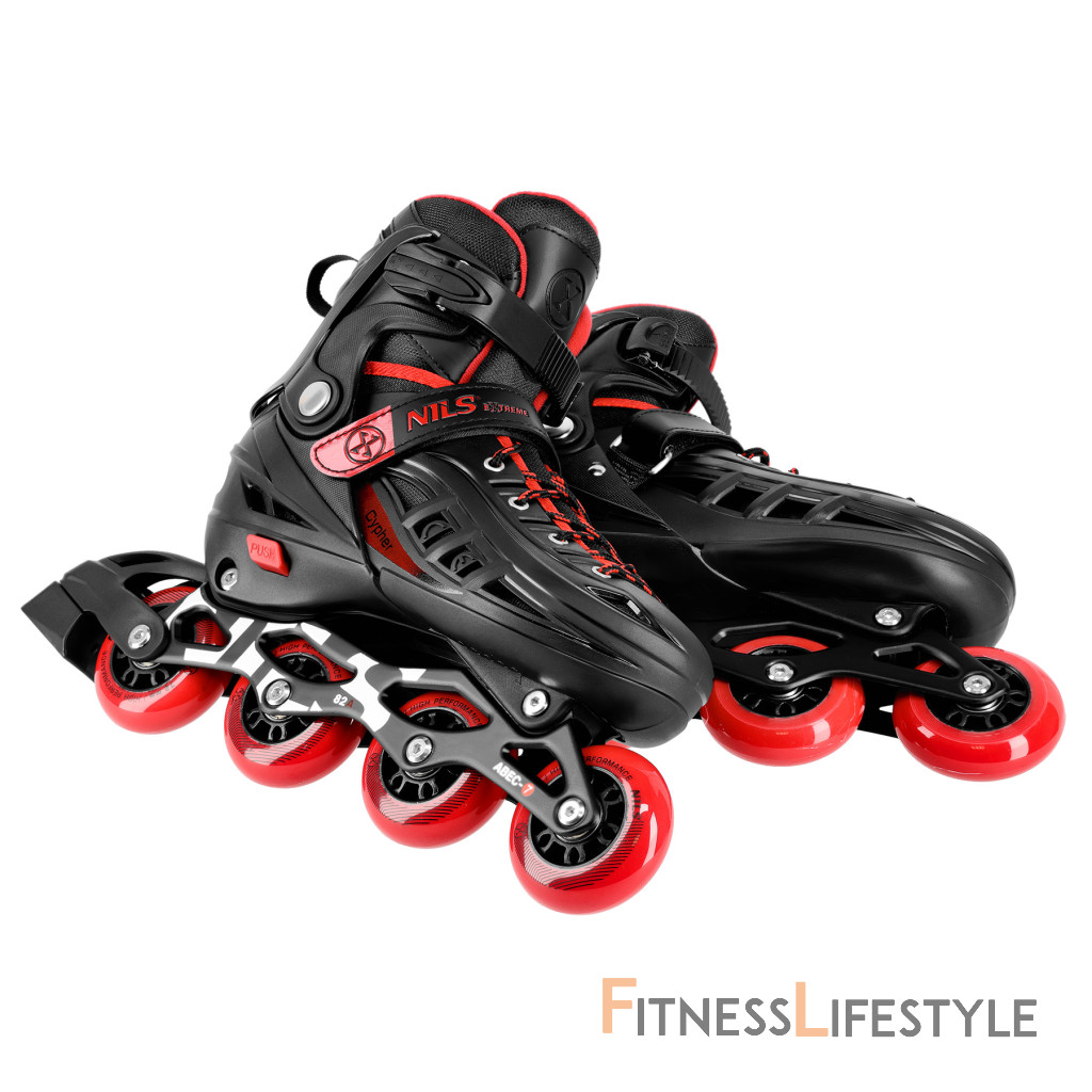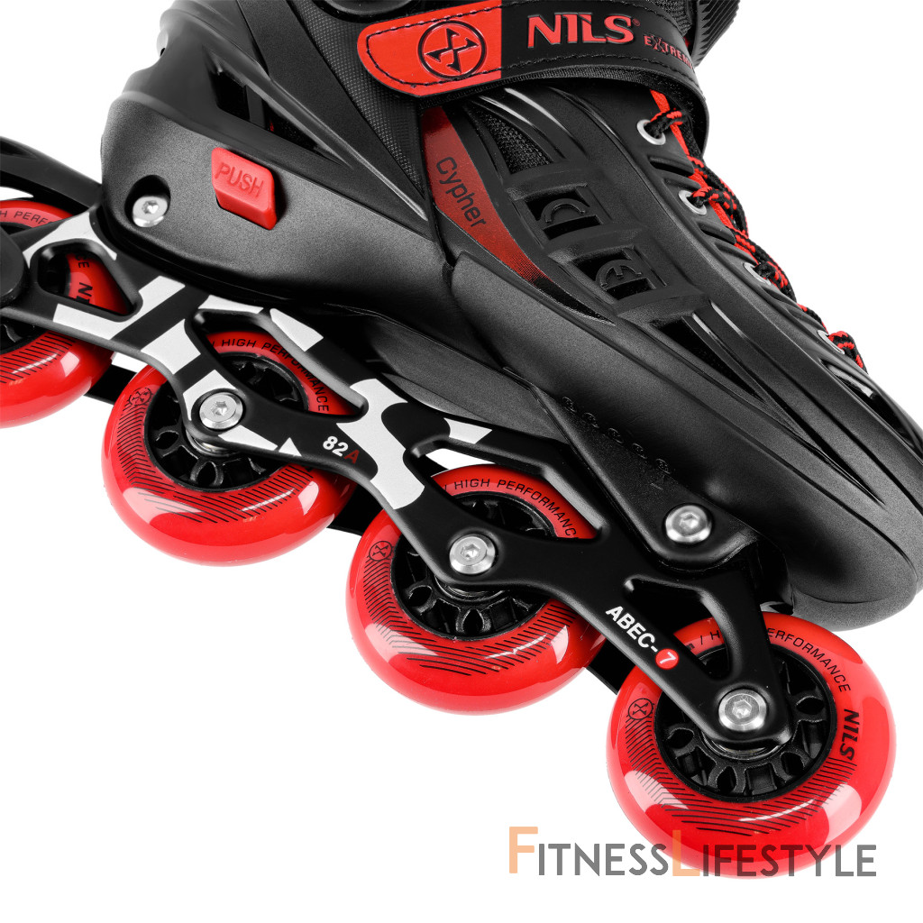Inline korčule NA18811A Cypher vynikajú atraktívnym moderným dizajnom v čierno-červenom prevedení. Nielenže pútajú pozornosť, ale vďaka použitiu pevných materiálov zaisťujú aj dlhú životnosť a vysokú odolnosť proti poškodeniu.
