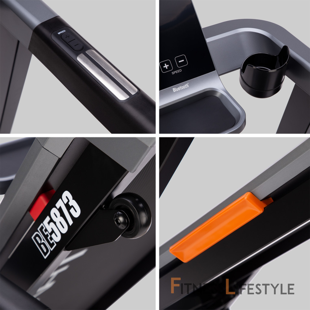 Bežecký pás BE5873 je vybavený technológiou Bluetooth, ktorá umožňuje pripojenie k tréningovým aplikáciám, ako sú Kinomap, Zwift a AnyRun. Bežecký pás je navyše vybavený reproduktorom, takže môžete pri cvičení počúvať svoju obľúbenú hudbu a používať tréningové aplikácie.