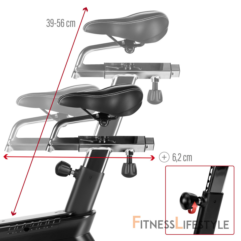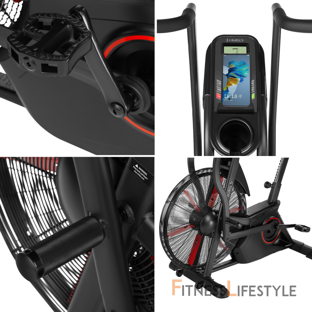 Air bike je vybavený LCD displejom, ktorý umožňuje sledovať kľúčové parametre tréningu: čas, vzdialenosť, rýchlosť, pulz, spálené kalórie a otáčky za minútu. Nastaviteľné sedlo vo vertikálnom a horizontálnom smere umožňuje precízne prispôsobenie pozície podľa výšky a postavy, čo zaisťuje komfort aj pri dlhodobom používaní. Praktické doplnky, ako držiak na fľašu, telefón a transportné kolieska, zvyšujú pohodlie pri používaní zariadenia.