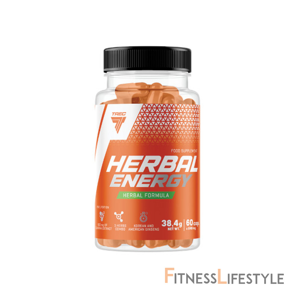 TREC Nutrition Herbal Energy je komplex starostlivo vybraných bylín s energetickým efektom. Kombinácia vysoko kvalitných koncentrovaných extraktov z guarany a amerického a kórejského ženšenu stimuluje mozog a nervový systém a podporuje telo v období vysokej fyzickej alebo mentálnej aktivity. Produkt zvyšuje výrobu energie, zlepšuje koncentráciu a zmierňuje pocit únavy. Bylinná energia zvyšuje adaptačné schopnosti tela, čo umožňuje rozšíriť a zintenzívniť školenie.