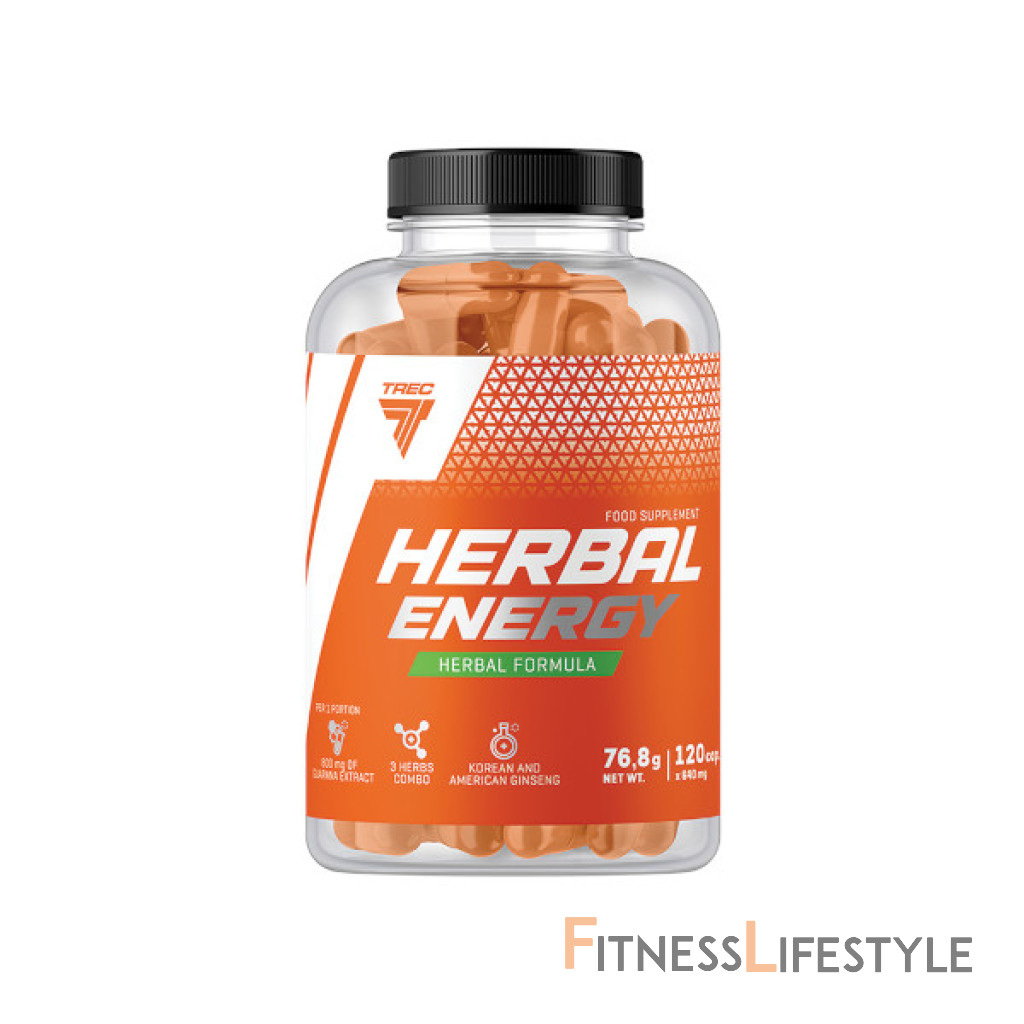 TREC Nutrition Herbal Energy je komplex starostlivo vybraných bylín s energetickým efektom. Kombinácia vysoko kvalitných koncentrovaných extraktov z guarany a amerického a kórejského ženšenu stimuluje mozog a nervový systém a podporuje telo v období vysokej fyzickej alebo mentálnej aktivity. Produkt zvyšuje výrobu energie, zlepšuje koncentráciu a zmierňuje pocit únavy. Bylinná energia zvyšuje adaptačné schopnosti tela, čo umožňuje rozšíriť a zintenzívniť školenie.