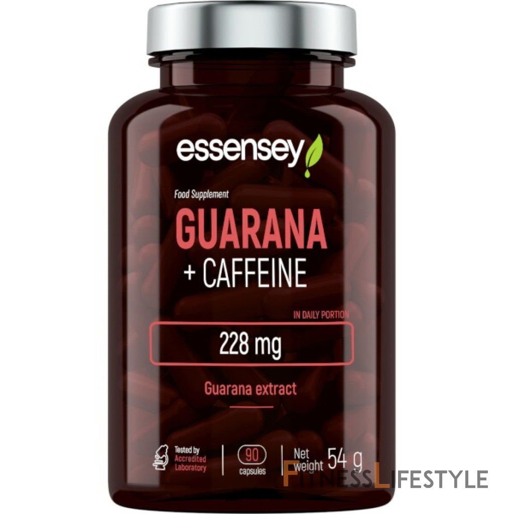 Informácie z značky produktu Essesey Guarana + kofeín . Doplnok potravín. Obsahuje kofeín; Neodporúča sa pre deti a tehotné ženy (200 mg za dennú dávku). Produkt v kapsulách obsahujúcich semená guarany (Paullinia Cupan) a kofeín.