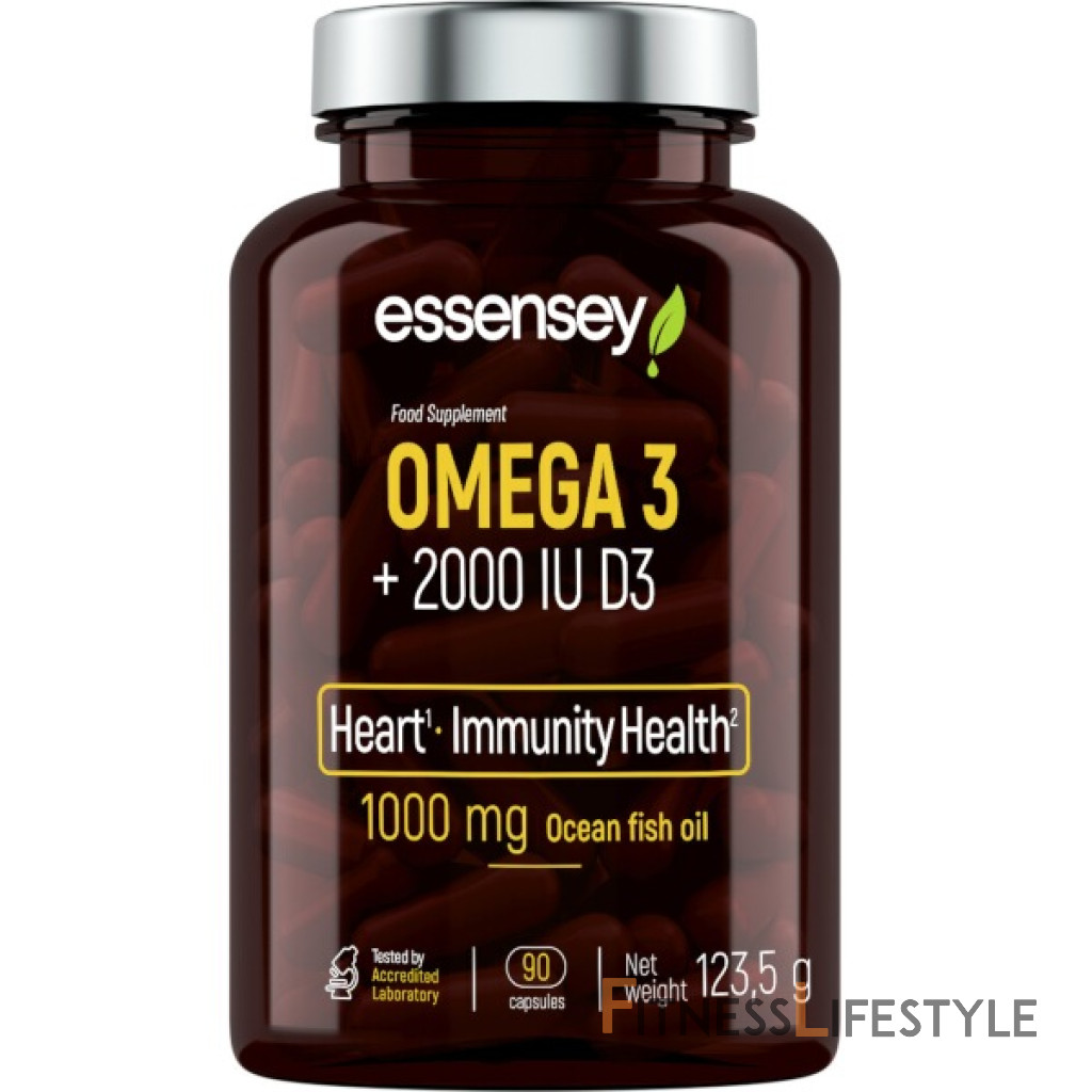 *RHP - Referenčné príjmy pre priemerného dospelého (8400KJ/2000KCal) Informácie z značky produktu Essesey Omega 3 + D3 . Doplnok potravín. Kapsuly rybích olejov, ktoré dodávajú tela EPA esenciálne mastné kyseliny a DHA a vitamín D. Kyselina eikosapentaén (EPA) a kyselina dokosahexaén (DHA) prispievajú k správnemu fungovaniu srdca. Pri konzumácii 250 mg EPA a DHA denne sa vyskytujú priaznivé účinky. Vitamín D prispieva k normálnej funkcii imunitného systému. Vitamín D prispieva k udržiavaniu normálneho stavu kostí.
