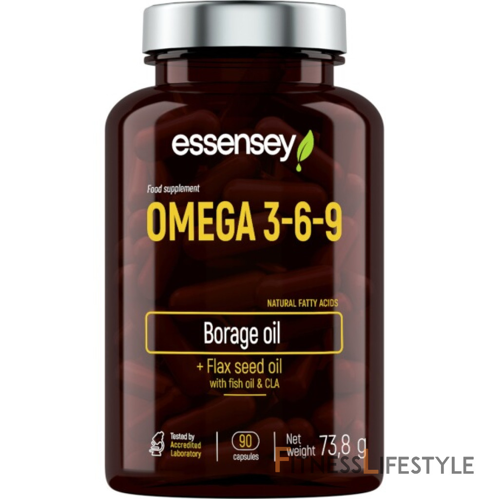 *RHP - Referenčné príjmy pre priemerného dospelého (8400KJ/2000KCal) Informácie z značky produktu Essesey Omega 3-6-9 . Doplnok potravín. Produkt v kapsulách, ktorý dopĺňa stravu s polynenasýtenými mastnými kyselinami: EPA a DHA patriace do skupiny Omega-3 a mastné kyseliny patriace do skupiny Omega-6 a Omega-9.
