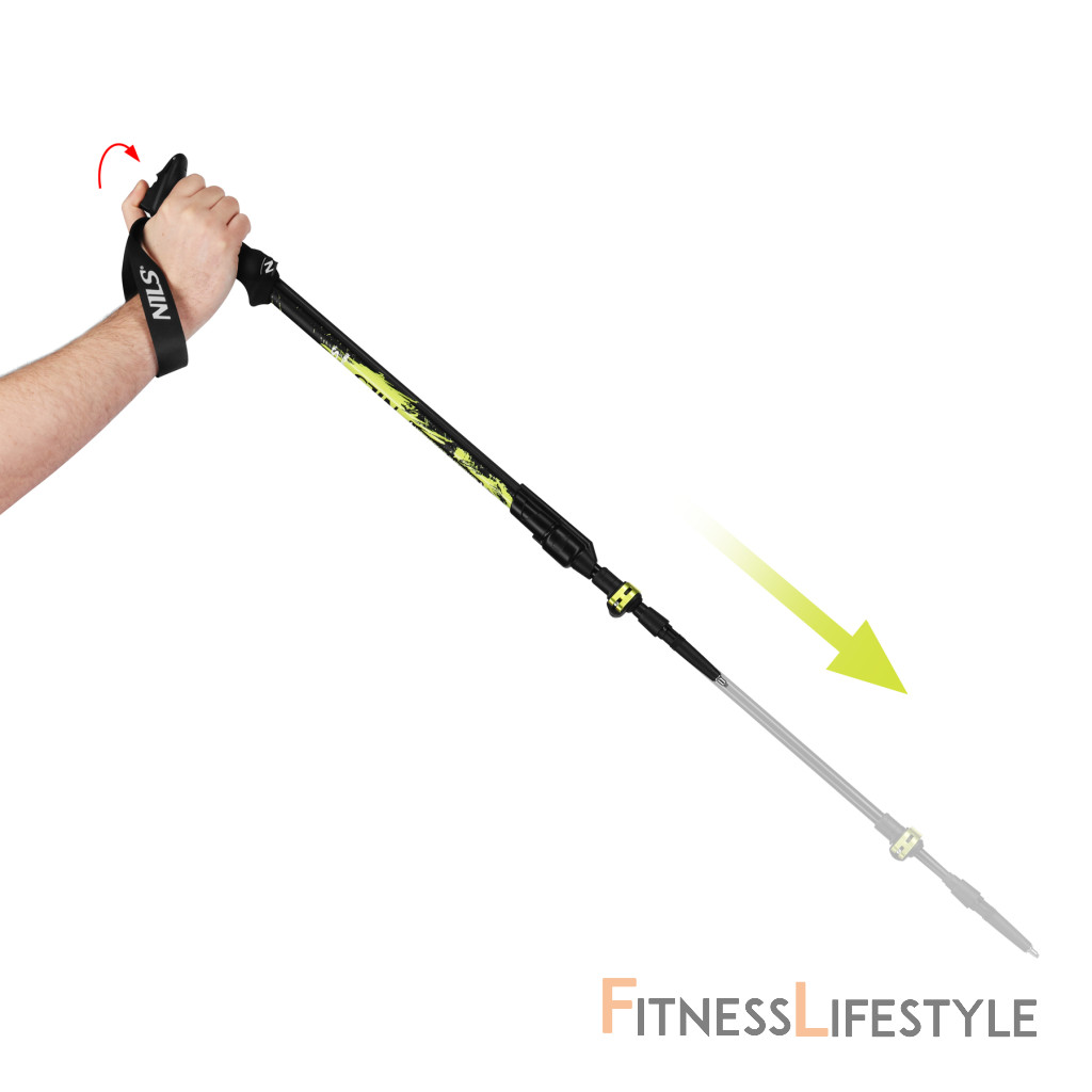 Dĺžka dolného segmentu palice je nastavená manuálne a zamknutá hliníkovým zámkom. Dĺžka stredného segmentu je nastavená, keď je tlačidlo stlačené na hornej časti rukoväte a tyčinky sa dajú nastaviť bez potreby zastavenia.