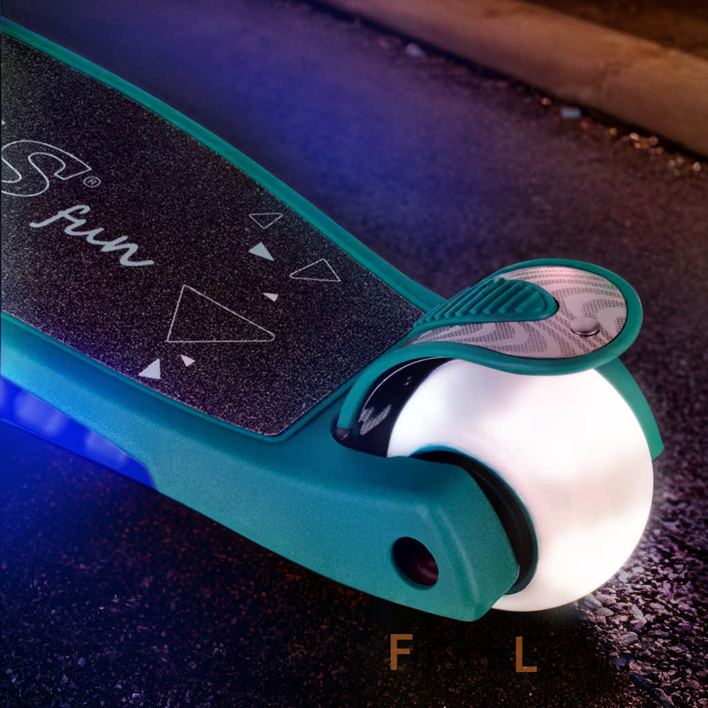 Jazda na skútre HLB1310 je čisté potešenie vďaka vysokej kvality polyuretánových (PU) kolesá, ktoré absorbujú menšie nerovnosti a zabezpečujú hladký pohyb. Okrem toho vďaka osvetleniu LED vstavaným kolesám a platforme sa používateľ vyniká na chodníku, čo zvyšuje viditeľnosť a zvyšuje bezpečnosť. Scooter je tiež vybavený ložiskami ABEC 7, ktoré zaručujú pokojnú a hladkú jazdu bez ohľadu na povrch.